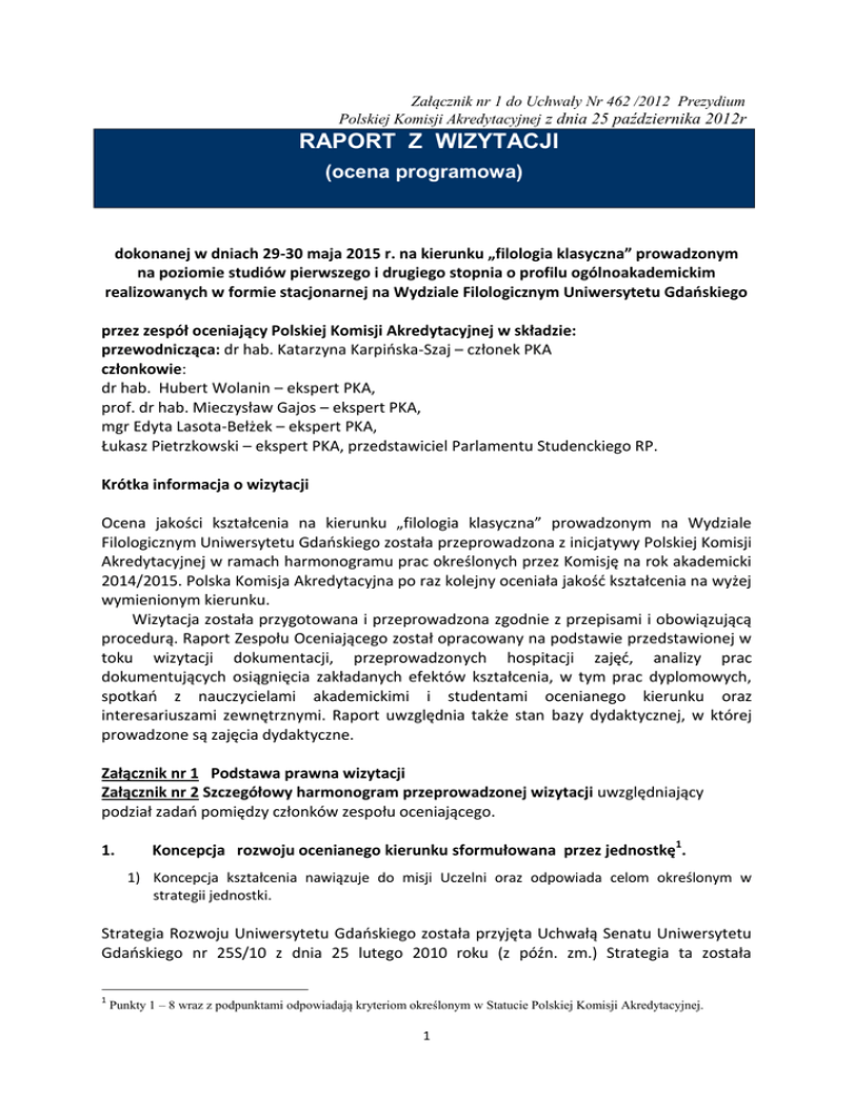 Załącznik nr 1 do Uchwały Nr 462 /2012 Prezydium Polskiej Komisji Akredytacyjnej z dnia 25 października 2012r RAPORT Z WIZYTACJI (ocena programowa) dokonanej w dniach 29-30 maja 2015 r. na kierunku „filologia klasyczna” prowadzonym na poziomie studiów pierwszego i drugiego stopnia o profilu ogólnoakademickim realizowanych w formie stacjonarnej na Wydziale Filologicznym Uniwersytetu Gdańskiego przez zespół oceniający Polskiej Komisji Akredytacyjnej w składzie: przewodnicząca: dr hab. Katarzyna Karpińska-Szaj – członek PKA członkowie: dr hab. Hubert Wolanin – ekspert PKA, prof. dr hab. Mieczysław Gajos – ekspert PKA, mgr Edyta Lasota-Bełżek – ekspert PKA, Łukasz Pietrzkowski – ekspert PKA, przedstawiciel Parlamentu Studenckiego RP. Krótka informacja o wizytacji Ocena jakości kształcenia na kierunku „filologia klasyczna” prowadzonym na Wydziale Filologicznym Uniwersytetu Gdańskiego została przeprowadzona z inicjatywy Polskiej Komisji Akredytacyjnej w ramach harmonogramu prac określonych przez Komisję na rok akademicki 2014/2015. Polska Komisja Akredytacyjna po raz kolejny oceniała jakość kształcenia na wyżej wymienionym kierunku. Wizytacja została przygotowana i przeprowadzona zgodnie z przepisami i obowiązującą procedurą. Raport Zespołu Oceniającego został opracowany na podstawie przedstawionej w toku wizytacji dokumentacji, przeprowadzonych hospitacji zajęć, analizy prac dokumentujących osiągnięcia zakładanych efektów kształcenia, w tym prac dyplomowych, spotkań z nauczycielami akademickimi i studentami ocenianego kierunku oraz interesariuszami zewnętrznymi. Raport uwzględnia także stan bazy dydaktycznej, w której prowadzone są zajęcia dydaktyczne. Załącznik nr 1 Podstawa prawna wizytacji Załącznik nr 2 Szczegółowy harmonogram przeprowadzonej wizytacji uwzględniający podział zadań pomiędzy członków zespołu oceniającego. 1. Koncepcja rozwoju ocenianego kierunku sformułowana przez jednostkę1. 1) Koncepcja kształcenia nawiązuje do misji Uczelni oraz odpowiada celom określonym w strategii jednostki. Strategia Rozwoju Uniwersytetu Gdańskiego została przyjęta Uchwałą Senatu Uniwersytetu Gdańskiego nr 25S/10 z dnia 25 lutego 2010 roku (z późn. zm.) Strategia ta została 1 Punkty 1 – 8 wraz z podpunktami odpowiadają kryteriom określonym w Statucie Polskiej Komisji Akredytacyjnej. 1 opracowana na czas do roku 2020. Podstawową misją Uniwersytetu Gdańskiego, nakreśloną w tym dokumencie jest kształcenie absolwentów wyposażonych we wszechstronną wiedzę, umiejętności i kompetencje niezbędne w życiu gospodarczo-społecznym. W opracowanej przez Wydział Filologiczny Strategii Rozwoju na lata 2012-2016 wyróżniono trzy obszary działań: ogólny, dydaktyczny i naukowy, w których punktowo omówiono najważniejsze zadania stojące przed Wydziałem w latach objętych przyjętym planem strategicznego rozwoju wydziału. W działaniach dydaktycznych zawarto rekomendację ustawicznego podnoszenia poziomu kształcenia na wszystkich kierunkach studiów stacjonarnych, niestacjonarnych oraz studiach podyplomowych. Władze Wydziału podkreślają konieczność zapewniania jakości kształcenia, na prowadzonych kierunkach studiów uwzględniającą nawiązanie efektywnej współpracy z potencjalnymi pracodawcami, co ma zapewnić absolwentom poszczególnych kierunków odnalezienie się na rynku pracy. Wydziałowe strategie rozwoju pozostają zatem w zgodzie z ogólnouczelnianymi założeniami rozwoju uczelni określonymi w przytoczonej Uchwale Senatu. Na podstawie analizy dokumentów, przeprowadzonych rozmów z władzami Uniwersytetu Gdańskiego, Wydziału Filologicznego oraz Dyrekcją, pracownikami i studentami filologii klasycznej można stwierdzić, że oceniany kierunek zgodnie z ogólną misją uczelni, a także zgodnie z przyjętymi przez Wydział Filologiczny kierunkami rozwoju, kształci specjalistów, którzy są wyposażeni w niezbędną wiedzę, umiejętności i kompetencje przydatne do pełnego odnalezienia się w życiu gospodarczym, naukowym, społecznym i kulturalnym. W opracowanej i przyjętej koncepcji kształceniu na kierunku filologia klasyczna dąży się do zapewnienia absolwentom możliwości podejmowania pracy w różnych obszarach aktywności zawodowej związanych z nauczanymi językami oraz kulturą antyczną. Absolwenci studiów I. stopnia filologii klasycznej są przygotowani do kontynuowania studiów filologii klasycznej do uzyskania tytułu magistra oraz do dalszych studiów w takich dyscyplinach, jak np. historia, filologia polska i inne filologie nowożytne, archeologia, historia sztuki, filozofia, teologia, muzykologia, kulturoznawstwo, prawo. Absolwenci Uzyskują również przygotowanie zawodowe, które pozwala na podejmowanie pracy przede wszystkim w bibliotekach i archiwach, w wydawnictwach, w dziennikarstwie (głównie po specjalności Wiedza o literaturze książce i teatrze), w turystyce, muzeach (głównie po specjalności Cywilizacja śródziemnomorska), we wszelkich instytucjach kultury (po obu specjalnościach). Specjalność Studia klasyczne nastawiona jest przy tym głównie na wiedzę o starożytności, a w mniejszym stopniu pozwala zaznajomić się z rolą języków i tradycji antycznej w kształtowaniu się kultury epok późniejszych; natomiast specjalność Studia renesansowe kładzie nacisk właśnie na poznanie znaczenia języków i inspiracji antycznych w rozwoju kultury europejskiej, ze szczególnym uwzględnieniem kultury Gdańska. Absolwenci studiów II. stopnia znajdują zatrudnienie w bibliotekach, archiwach, muzeach, wydawnictwach, redakcjach czasopism i innych instytucjach związanych z badaniem, tworzeniem i upowszechnianiem kultury. Zarówno w Strategii Rozwoju Uczelni jak i Strategii Rozwoju Wydziału wskazano na konieczność internacjonalizacji kształcenia poprzez rozwijanie kontaktów z uczelniami zagranicznymi. W tym zakresie oceniana 