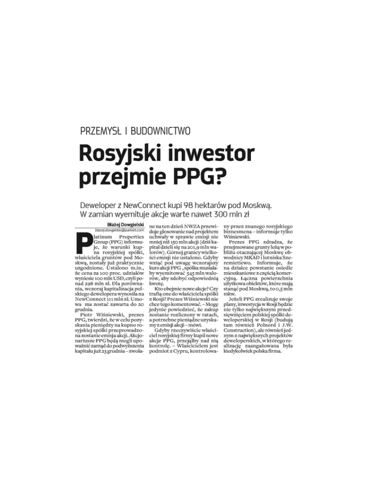 PRZEMYŚL I BUDOWNICTWO Rosyjski inwestor przejmie PPG? Deweloper z NewConnect kupi 98 hektarów pod Moskwą. W zamian wyemituje akcje warte nawet 300 mln zł Błażej Dowgielski P blazej.dowgielskilSiparkiet.com latinum Properties Group (PPG) informu je, że warunki kup na rosyjskiej spółki, właściciela gruntów pod Mo skwą, zostały już praktycznie uzgodnione. Ustalono m.in., że cena za 100 proc. udziałów wyniesie 100 mln USD, czyli po nad 298 mln zl. Dla porówna nia, wczoraj kapitalizacja pol skiego dewelopera wynosiła na NewConnect 111 mln zl. Umo wa ma zostać zawarta do 20 grudnia. Piotr Wiśniewski, prezes PPG, twierdzi, że w celu pozy skania pieniędzy na kupno rosyjskiej spółki przeprowadzo na zostanie emisja akcji. Akcjo nariusze PPG będą mogli upo ważnić zarząd do podwyższenia kapitału już 23 grudnia - zwoła ne na ten dzień NWZA przewi duje głosowanie nad projektem uchwały w sprawie emisji nie mniej niż 150 mln akcji (dziś ka pitał dzieli sięna20i,9mln wa lorów). Górnej granicy wielko ści emisji nie ustalono. Gdyby wziąć pod uwagę wczorajszy kurs akcji PPG , spółka musiała by wyemitować 545 mln walo rów, aby zdobyć odpowiednią kwotę. Kto obejmie nowe akcje? Czy trafią one do właściciela spółki z Rosji? Prezes Wiśniewski nie chce tego komentować. - Mogę jedynie powiedzieć, że zakup zostanie rozliczony w ratach, a potrzebne pieniądze uzyska my z emisji akcji - mówi. Gdyby rzeczywiście właści ciel rosyj skiej firmy kupił nowe akcje PPG, przejąłby nad nią kontrolę. - Właścicielem jest podmiot z Cypru, kontrolowa ny przez znanego rosyjskiego biznesmena - informuje tylko Wiśniewski. Prezes PPG zdradza, że przej mowane grunty leżą w po bliżu otaczającej Moskwę ob wodnicy MKAD i lotniska Szeremietiewo. Informuje, że na działce powstanie osiedle mieszkaniowe z częścią komer cyjną. Łączna powierzchnia użytkowa obiektów, które mają stanąć pod Moskwą, to 0,5 mln mkw. Jeżeli PPG zrealizuje swoje plany, inwestycja w Rosji będzie nie tylko największym przed sięwzięciem polskiej spółki de weloperskiej w Rosji (budują tam również Polnord i J.W. Construction), ale równieżjednym z największych projektów deweloperskich, wktórego re alizację zaangażowana była kiedykolwiek polska firma.