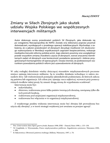 Maciej ZIMNY Zmiany w Siłach Zbrojnych jako skutek udziału Wojska Polskiego we współczesnych interwencjach militarnych Autor dokonuje oceny przeobrażeń polskich Sił Zbrojnych, jaka dokonała się po wstąpieniu Rzeczpospolitej do NATO. Została ona dokonana poprzez pryzmat doświadczeń, wynikających z przebiegu operacji stabilizacyjnych. Wychodząc z założenia, że o jakości przeobrażeń sił zbrojnych decyduje możliwość ich skutecznego wykorzystania w likwidacji współczesnych zagrożeń bezpieczeństwa, wskazuje niezbędne kierunki reformy polskiej armii. Jego zdaniem powinny one uwzględniać przede wszystkim zmianę charakteru użycia sił zbrojnych, wzrost znaczenia niemilitarnych zadań sił zbrojnych oraz konieczność posiadania sprawnych i dobrze przygotowanych kontyngentów sił operacyjnych. Uważa również, że podstawowym warunkiem powodzenia polskich reform jest uzawodowienie sił zbrojnych. W całej rozległej dziedzinie wiedzy dotyczącej stosunków międzynarodowych poczesne miejsce zajmują interwencje militarne. Są to wszelkie działania wchodzące w zakres stosunków dwu- lub wielostronnych pomiędzy jakimikolwiek podmiotami, do których zalicza się państwa lub organizacje. Ich celem jest, ujmując rzecz najkrócej, wywarcie przy pomocy różnych środków takiej presji, by zmusić drugą stronę do wypełnienia oczekiwań1. Interwencja może być: indywidualna, zbiorowa, realizowana przez kilka państw tworzących doraźną, zawiązaną tylko dla tych potrzeb koalicję, realizowana pod auspicjami organizacji międzynarodowej, realizowana bez włączenia w to organizacji międzynarodowej. Z wojskowego punktu widzenia interwencja może być zbrojna lub prowadzona bez użycia siły zbrojnej2, a w teorii strategii wojskowej jest uważana za przejaw agresji3. 1 2 3 Por. L’intervention dans l’aprčs guerre froide, Ramses 1998, IFRI – Dunod, Paris 1998, s. 133–138. W. Czapliński, A. Wyrozumska, Prawo międzynarodowe publiczne. Zagadnienia systemowe, Warszawa 1999, s. 496. B. Balcerowicz, Obronność państwa średniego, Bellona, Warszawa, 1997, s. 78. MATERIAŁY 239 Wspólne cechy interwencji to: interwencja zawsze jest związana z nierównym statusem pomiędzy interwentem a podmiotem stosunków międzynarodowych, na obszarze którego przebiega, interwent musi zaś mieć pewność co do przewagi swojej siły wobec podmiotu interwencji; interwencji najczęściej towarzyszy przekonanie o jej słuszności (według schematu cywilizacja przeciwko barbarzyństwu, prawo – w rozumieniu interwentów – przeciwko bezprawiu4). Przyczyny nasilenia się konfliktów przełomu wieków XX i XXI Kres istniejącego od zakończenia II wojny światowej dwubiegunowego podziału świata tak naprawdę rozpoczął się pierwszymi demokratycznymi wyborami w Polsce 4 czerwca 1989 roku, upadkiem muru berlińskiego w październiku tego samego roku i rozpadem Związku Radzieckiego w roku następnym. Tym samym, wraz z będącym niejako naturalną konsekwencją tych wydarzeń samorozwiązaniem się Układu Warszawskiego, przestał istnieć (po NATO i przewodzącym im Stanom Zjednoczonym) jeden z dwóch największych dotąd animatorów światowej polityki. Skończyła się era strachu przed kolejnym globalnym konfliktem, w którym głównym teatrem działań zbrojnych miała być przede wszystkim Europa, przez lata podzielona tzw. żelazną kurtyną. To do niego przez dziesiątki lat obie strony nieustannie się przygotowywały, gromadząc wielkie ilości środków walki i utrzymując duże liczebnie armie. Dla oddania sprawiedliwości trzeba powiedzieć, że to Układ Warszawski posiadał na swoich zachodnich rubieżach (na terenach Polski oraz ówczesnych NRD i Czechosłowacji) o wiele więcej niż przeciwnik ofensywnych dywizji pancernych, co dość jasno określa jego prawdziwe intencje. Jednak brak przesłanek do dalszego istnienia zagrożenia globalną wojną nie uwolnił świata od zagrożeń tworzonych przez pomniejsze, tlące się od dawna w wielu rejonach świata kryzysy5. Nie pojawiły się nagle – istniały już poprzednio, ale w zależności od potrzeb były dotąd sztucznie tłumione lub umiejętnie podsycanych przez ówczesne mocarstwa. Teraz nowa sytuacja dla wielu z nich zadziałała jak katalizator i ukazało się wiele ognisk zapalnych o trudnym do przewidzenia natężeniu i kierunku dalszego rozwoju. Głównych przyczyn takiego stanu rzeczy było kilka: zakończył się światowy prymat dwóch dominujących dotąd mocarstw i wynikająca z tego konieczność (dobrowolna lub wymuszona) podporządkowania się innych krajów jednemu z dwóch sygnowanych przez nie ustrojów politycznych, 4 5 J. Pawłowski [red.], Walka z terroryzmem we współczesnym świecie, Informator Oddziału Współpracy ze Społeczeństwem departamentu Społeczno-Wychowawczego MON, s. 114. W tym znaczeniu dość szerokie znaczenie pojęcia „kryzys” zostało celowo zawężone do ogólnego określenia stanu, napięcia i destabilizacji, jaki powstał w wyniku gwałtownego osłabienia lub zerwania dotychczasowych powiązań (politycznych, ekonomicznych, kulturowych i innych), [por:] Słownik podstawowych terminów dotyczących bezpieczeństwa państwa, Warszawa 1994, s. 30. 240 6 ROCZNIK BEZPIECZEŃSTWA MIĘDZYNARODOWEGO – 2007 istniejące zawsze regionalnie kryzysy i napięcia były dotąd umiejętnie sterowane przez pozornie niezaangażowane mocarstwa, stanowiły doskonały instrument na międzynarodowej arenie politycznej i bardzo użytecznym narzędziem w poszczególnych regionach do kreowania w zależności od potrzeb odpowiednio dozowanych wartości napięcia, po roku 1989, kiedy priorytety poszczególnych państw (wchodzących w skład lub skupionych wokół dawnego Związku Radzieckiego) nie musiały być już podporządkowane jego polityce, niektóre z tych krajów pozbawione wielkiego nadzorcy okazały się słabe i całkowicie nieprzystosowane nie tylko do samodzielnej 