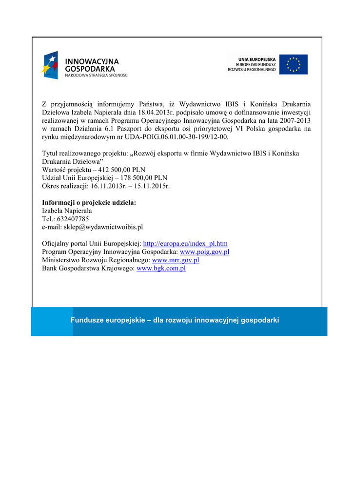Z przyjemnością informujemy Państwa, iż Wydawnictwo IBIS i Konińska Drukarnia Dziełowa Izabela Napierała dnia 18.04.2013r. podpisało umowę o dofinansowanie inwestycji realizowanej w ramach Programu Operacyjnego Innowacyjna Gospodarka na lata 2007-2013 w ramach Działania 6.1 Paszport do eksportu osi priorytetowej VI Polska gospodarka na rynku międzynarodowym nr UDA-POIG.06.01.00-30-199/12-00. Tytuł realizowanego projektu: „Rozwój eksportu w firmie Wydawnictwo IBIS i Konińska Drukarnia Dziełowa” Wartość projektu – 412 500,00 PLN Udział Unii Europejskiej – 178 500,00 PLN Okres realizacji: 16.11.2013r. – 15.11.2015r. Informacji o projekcie udziela: Izabela Napierała Tel.: 632407785 e-mail: [email protected] Oficjalny portal Unii Europejskiej: http://europa.eu/index_pl.htm Program Operacyjny Innowacyjna Gospodarka: www.poig.gov.pl Ministerstwo Rozwoju Regionalnego: www.mrr.gov.pl Bank Gospodarstwa Krajowego: www.bgk.com.pl Fundusze europejskie – dla rozwoju innowacyjnej gospodarki