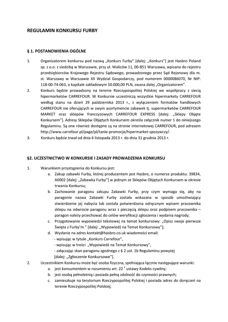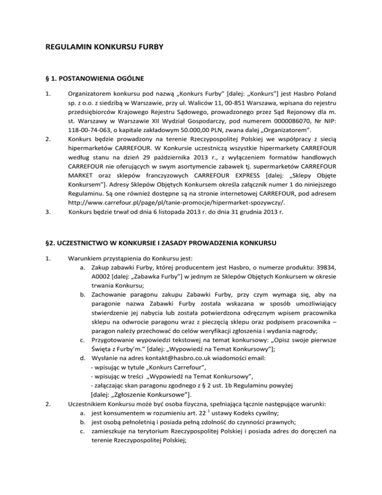 REGULAMIN KONKURSU FURBY § 1. POSTANOWIENIA OGÓLNE 1. 2. 3. Organizatorem konkursu pod nazwą „Konkurs Furby” [dalej: „Konkurs”] jest Hasbro Poland sp. z o.o. z siedzibą w Warszawie, przy ul. Waliców 11, 00-851 Warszawa, wpisana do rejestru przedsiębiorców Krajowego Rejestru Sądowego, prowadzonego przez Sąd Rejonowy dla m. st. Warszawy w Warszawie XII Wydział Gospodarczy, pod numerem 0000086070, Nr NIP: 118-00-74-063, o kapitale zakładowym 50.000,00 PLN, zwana dalej „Organizatorem”. Konkurs będzie prowadzony na terenie Rzeczypospolitej Polskiej we współpracy z siecią hipermarketów CARREFOUR. W Konkursie uczestniczą wszystkie hipermarkety CARREFOUR według stanu na dzień 29 października 2013 r., z wyłączeniem formatów handlowych CARREFOUR nie oferujących w swym asortymencie zabawek tj. supermarketów CARREFOUR MARKET oraz sklepów franczyzowych CARREFOUR EXPRESS [dalej: „Sklepy Objęte Konkursem”]. Adresy Sklepów Objętych Konkursem określa załącznik numer 1 do niniejszego Regulaminu. Są one również dostępne są na stronie internetowej CARREFOUR, pod adresem http://www.carrefour.pl/page/pl/tanie-promocje/hipermarket-spozywczy/. Konkurs będzie trwał od dnia 6 listopada 2013 r. do dnia 31 grudnia 2013 r. §2. UCZESTNICTWO W KONKURSIE I ZASADY PROWADZENIA KONKURSU 1. 2. Warunkiem przystąpienia do Konkursu jest: a. Zakup zabawki Furby, której producentem jest Hasbro, o numerze produktu: 39834, A0002 [dalej: „Zabawka Furby”] w jednym ze Sklepów Objętych Konkursem w okresie trwania Konkursu; b. Zachowanie paragonu zakupu Zabawki Furby, przy czym wymaga się, aby na paragonie nazwa Zabawki Furby została wskazana w sposób umożliwiający stwierdzenie jej nabycia lub została potwierdzona odręcznym wpisem pracownika sklepu na odwrocie paragonu wraz z pieczęcią sklepu oraz podpisem pracownika – paragon należy przechować do celów weryfikacji zgłoszenia i wydania nagrody; c. Przygotowanie wypowiedzi tekstowej na temat konkursowy: „Opisz swoje pierwsze Święta z Furby’m.” [dalej: „Wypowiedź na Temat Konkursowy”]; d. Wysłanie na adres [email protected] wiadomości email: - wpisując w tytule „Konkurs Carrefour”, - wpisując w treści „Wypowiedź na Temat Konkursowy”, - załączając skan paragonu zgodnego z § 2 ust. 1b Regulaminu powyżej [dalej: „Zgłoszenie Konkursowe”]. Uczestnikiem Konkursu może być osoba fizyczna, spełniająca łącznie następujące warunki: a. jest konsumentem w rozumieniu art. 22 1 ustawy Kodeks cywilny; b. jest osobą pełnoletnią i posiada pełną zdolność do czynności prawnych; c. zamieszkuje na terytorium Rzeczypospolitej Polskiej i posiada adres do doręczeń na terenie Rzeczypospolitej Polskiej; 3. 4. d. spełnia warunki uczestnictwa w Konkursie określone w § 2 ust. 1 powyżej; e. nie podlega wykluczeniu z uczestnictwa w Konkursie, zgodnie z postanowieniami ust. 3 i 4 poniżej. W Konkursie nie mogą uczestniczyć pracownicy Organizatora, jak również inne osoby bezpośrednio zaangażowane przez Organizatora w przygotowaniu lub przeprowadzeniu Konkursu, a także członkowie najbliższej rodziny tychże osób. Przez członków najbliższej rodziny, o których mowa w ust. 3 powyżej, rozumie się: wstępnych, zstępnych, rodzeństwo, małżonków, rodziców małżonków oraz osoby pozostające w stosunku przysposobienia. §3. NAGRODY RZECZOWE 1. 2. 3. 4. 5. 6. 7. 8. Dla uczestników Konkursu przewidziano 3 (słownie: trzy) nagrody rzeczowe. Nagrodą rzeczową jest Tablet Samsung Galaxy Tab 2 numer modelu PCH-1000 [dalej: „Nagroda”], z uwzględnieniem ust. 2 poniżej. Łączna wartość nagrody wynosi 1.100,00 PLN (słownie: tysiąc sto złotych) (nagroda rzeczowa o wartości 1.000,00 złotych oraz świadczenie pieniężne w wysokości 100,00 złotych, przeznaczane na podatek od nagród zgodnie z ustawą o podatku dochodowym od osób fizycznych). Należny podatek od nagród zostanie uiszczony bezpośrednio przez Organizatora. Uczestnikom Konkursu nie przysługuje prawo do otrzymania ekwiwalentu (pieniężnego, rzeczowego) Nagrody. Zwycięzcy Konkursu zostaną wyłonieni przez komisję konkursową powołaną przez Organizatora [dalej: „Komisja”]. Komisja wyłoni 3 (słownie: trzech) zwycięzców Konkursu w terminie do dnia 10 stycznia 2014 r. W przypadku, gdy do uczestnictwa w Konkursie zostanie nadesłanych mniej niż 3 (słownie: trzy) Zgłoszeń Konkursowych, wówczas Organizator przyzna odpowiednio mniejszą ilość Nagród. Zwycięzcy Konkursu zostaną powiadomieni o wygranej w terminie wskazanym w ust. 4 powyżej, poprzez przesłanie wiadomości na adres e-mail wskazany w Zgłoszeniu Konkursowym. W odpowiedzi na wiadomość Organizatora o wygranej, zwycięzcy Konkursu są zobowiązani do wskazania danych adresowych dostarczenia Nagrody: imienia, nazwiska oraz adresu zamieszkania zwycięzcy [dalej: „Dane Zwycięzców”], celem umożliwienia Organizatorowi wydania Nagrody. Nagrody zostaną przesłane przez Organizatora zgodnie z przekazanymi Danymi Zwycięzców w terminie 14 dni od otrzymania „Danych Zwycięzców”. Uczestnik w ramach Konkursu może być nagrodzony tylko raz i może otrzymać tylko jedną nagrodę. § 4. ODPOWIEDZIALNOŚĆ ORGANIZATORA 1. Wszelkie ewentualne skargi, związane ze sposobem przebiegu Konkursu, Uczestnik Konkursu obowiązany jest skierować na piśmie do Organizatora w terminie 7 dni od zakończenia 2. Konkursu celem rozpatrzenia zasadności skargi lub żądania. O przyjęciu skargi decyduje data jej nadania. Skargi nadane po upływie powyższego terminu nie będą rozpatrywane. Skargi rozpatrywać będzie Organizator w terminie 14 dni od dnia ich otrzymania. Decyzja Organizatora w sprawie skargi będzie ostateczna. § 5. POSTANOWIENIA KOŃCOWE 1. 2. 3. 4. 5. Udział w Konkursie jest równoznaczny z wyrażeniem przez uczestnika zgody na warunki Konkursu określone niniejszym Regulaminem. Każdy Uczestnik Konkursu przez przystąp
