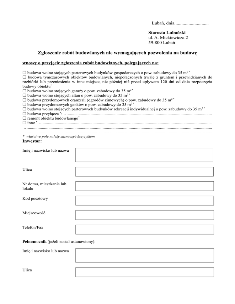 Lubań, dnia............................. Starosta Lubański ul. A. Mickiewicza 2 59-800 Lubań Zgłoszenie robót budowlanych nie wymagających pozwolenia na budowę wnoszę o przyjęcie zgłoszenia robót budowlanych, polegających na: budowa wolno stojących parterowych budynków gospodarczych o pow. zabudowy do 35 m 2 * budowa tymczasowych obiektów budowlanych, niepołączonych trwale z gruntem i przewidzianych do rozbiórki lub przeniesienia w inne miejsce, nie później niż przed upływem 120 dni od dnia rozpoczęcia budowy obiektu* budowa wolno stojących garaży o pow. zabudowy do 35 m2 * budowa wolno stojących altan o pow. zabudowy do 35 m2 * budowa przydomowych oranżerii (ogrodów zimowych) o pow. zabudowy do 35 m 2 * budowa przydomowych ganków o pow. zabudowy do 35 m2 * budowa wolno stojących parterowych budynków rekreacji indywidualnej o pow. zabudowy do 35 m 2 * budowa przyłącza *: …..................................................................................................................................... remont obiektu budowlanego* inne *…............................................................................................................................................................. ….......................................................................................................................................................................... ….......................................................................................................................................................................... * właściwe pole należy zaznaczyć krzyżykiem Inwestor: Imię i nazwisko lub nazwa Ulica Nr domu, mieszkania lub lokalu Kod pocztowy Miejscowość Telefon/Fax Pełnomocnik (jeżeli został ustanowiony): Imię i nazwisko lub nazwa Ulica Nr domu, mieszkania lub lokalu Kod pocztowy Miejscowość Telefon/Fax Adres zamierzenia inwestycyjnego: Działka(-ki) ewidencyjna(-ne) Obręb Ulica Nr budynku Kod pocztowy Miejscowość Rodzaj, zakres i sposób wykonywania robót budowlanych Termin rozpoczęcia robót budowlanych (Zgodnie z art. 30 ust. 5 ustawy – Prawo budowlane zgłoszenia należy dokonać przed terminem zamierzonego rozpoczęcia robót. Właściwy organ, w terminie 30 dni od dnia doręczenia zgłoszenia może w drodze decyzji wnieść sprzeciw. Do wykonywania robót budowlanych można przystąpić, jeżeli organ nie wniósł sprzeciwu w tym terminie) Proszę o wydanie zaświadczenia potwierdzającego przyjęcie zgłoszenia: TAK NIE * Za wydanie zaświadczenia potwierdzającego przyjęcie zgłoszenia robót budowlanych pobierana jest opłata skarbowa w wysokości 17 zł zgodnie z ustawą z dnia 16 listopada 2006 r. o opłacie skarbowej (Dz. U. z 2014 r. poz. 1628 j.t.) na rachunek bankowy Urzędu Miasta Lubań ul. 7-ej Dywizji 14, 59-800 Lubań konto: 37 2030 0045 1110 0000 0082 4230 Przedkładam następujące załączniki: 1)oświadczenie o posiadanym prawie do dysponowania nieruchomością na cele budowlane, 2)w zależności od potrzeb odpowiednie szkice lub rysunki, a także pozwolenia wymagane odrębnymi przepisami, 3)zwięzły opis wykonywanych robót, 4)mapka sytuacyjna z zaznaczonym obiektem (remont), bądź mapka z zaznaczoną lokalizacją, charakterystycznymi odległościami i wymiarami (budowa obiektu), 5)projekt zagospodarowania działki lub terenu (wraz z opisem technicznym instalacji) wykonanym przez projektanta posiadającego odpowiednie uprawnienia budowlane w przypadku budowy obiektów lub urządzeń budowlanych zgodnie z pkt 4 i 5 pouczenia, 6)upoważnienie udzielone osobie działającej w imieniu inwestora, 7)........................................................................................................................................................................... 8)........................................................................................................................................................................... ................................................... (podpis wnioskodawcy) POUCZENIE 1. Zgłoszenia należy dokonać przed terminem zamierzonego rozpoczęcia robót budowlanych. Do wykonania robót budowlanych można przystąpić, jeżeli w terminie 30 dni od dnia doręczenia zgłoszenia właściwy organ nie wniesie, w drodze decyzji, sprzeciwu i nie później niż po upływie 3 lat od określonego w zgłoszeniu terminu ich rozpoczęcia. 2. W zgłoszeniu należy określić rodzaj, zakres i sposób wykonywania robót budowlanych oraz termin ich rozpoczęcia. 3. Do zgłoszenia należy dołączyć oświadczenie, o którym mowa w art. 32 ust. 4 pkt 2 oraz w zależności od potrzeb, odpowiednie szkice lub rysunki, a także pozwolenia, uzgodnienia i opinie wymagane odrębnymi przepisami. 4. W zgłoszeniu budowy obiektów małej architektury w miejscach publicznych należy przedłożyć projekt zagospodarowania działki lub terenu, wykonany przez projektanta posiadającego wymagane uprawnienia budowlane. 5. Do zgłoszenia budowy przyłączy: elektroenergetycznych, wodociągowych, kanalizacyjnych, gazowych, cieplnych i telekomunikacyjnych należy dołączyć projekt zagospodarowania działki lub terenu wraz z opisem technicznym instalacji, wykonany przez projektanta posiadającego odpowiednie uprawnienia budowlane. Projekt zagospodarowania działki lub terenu, w przypadku budowy instalacji zbiornikowych na gaz płynny z pojedynczym zbiornikiem o pojemności do 7 m3, przeznaczonych do zasilania instalacji gazowych w budynkach mieszkalnych jednorodzinnych, uzgodniony z podmiotem właściwym do spraw zabezpieczeń przeciwpożarowych. 6. W razie konieczności uzupełnienia zgłoszenia właściwy organ nakłada, w drodze postanowienia, na zgłaszającego obowiązek uzupełnienia, w określonym terminie, brakujących dokumentów, a w przypadku ich nie uzupełnienia wnosi sprzeciw, w drodze decyzji. 7. Właściwy organ wnosi sprzeciw, jeżeli: 1. zgłoszenie dotyczy budo