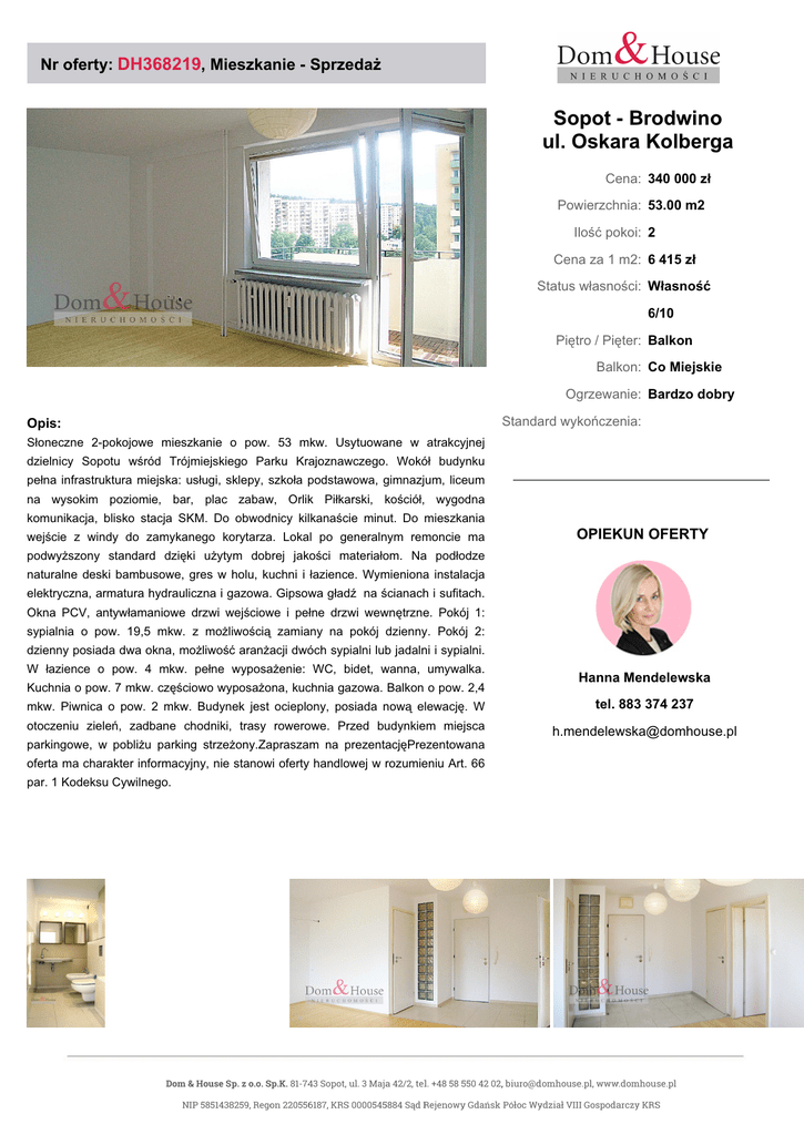 Nr oferty: DH368219, Mieszkanie - Sprzedaż Sopot - Brodwino ul. Oskara Kolberga Mieszkanie, 53.00 m2, pokoje: 2 Cena: 340 000 zł Powierzchnia: 53.00 m2 Ilość pokoi: 2 Cena za 1 m2: 6 415 zł Status własności: Własność 6/10 Piętro / Pięter: Balkon Balkon: Co Miejskie Ogrzewanie: Bardzo dobry Opis: Standard wykończenia: Słoneczne 2-pokojowe mieszkanie o pow. 53 mkw. Usytuowane w atrakcyjnej dzielnicy Sopotu wśród Trójmiejskiego Parku Krajoznawczego. Wokół budynku pełna infrastruktura miejska: usługi, sklepy, szkoła podstawowa, gimnazjum, liceum na wysokim poziomie, bar, plac zabaw, Orlik Piłkarski, kościół, wygodna komunikacja, blisko stacja SKM. Do obwodnicy kilkanaście minut. Do mieszkania wejście z windy do zamykanego korytarza. Lokal po generalnym remoncie ma OPIEKUN OFERTY podwyższony standard dzięki użytym dobrej jakości materiałom. Na podłodze naturalne deski bambusowe, gres w holu, kuchni i łazience. Wymieniona instalacja elektryczna, armatura hydrauliczna i gazowa. Gipsowa gładź na ścianach i sufitach. Okna PCV, antywłamaniowe drzwi wejściowe i pełne drzwi wewnętrzne. Pokój 1: sypialnia o pow. 19,5 mkw. z możliwością zamiany na pokój dzienny. Pokój 2: dzienny posiada dwa okna, możliwość aranżacji dwóch sypialni lub jadalni i sypialni. W łazience o pow. 4 mkw. pełne wyposażenie: WC, bidet, wanna, umywalka. Kuchnia o pow. 7 mkw. częściowo wyposażona, kuchnia gazowa. Balkon o pow. 2,4 Hanna Mendelewska mkw. Piwnica o pow. 2 mkw. Budynek jest ocieplony, posiada nową elewację. W tel. 883 374 237 otoczeniu zieleń, zadbane chodniki, trasy rowerowe. Przed budynkiem miejsca [email protected] parkingowe, w pobliżu parking strzeżony.Zapraszam na prezentacjęPrezentowana oferta ma charakter informacyjny, nie stanowi oferty handlowej w rozumieniu Art. 66 par. 1 Kodeksu Cywilnego.