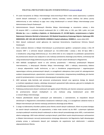 POLITYKA PRYWATNOŚCI SKLEPU INTERNETOWEGO www.nevershy.pl 1. W czasie korzystania ze Sklepu Internetowego www.nevershy.pl Klient może zostać poproszony o podanie swoich danych osobowych, a w szczególności imienia, nazwiska, numeru telefonu lub adresu poczty elektronicznej w celu realizacji na jego rzecz usług świadczonych w ramach Sklepu Internetowego przez Administratora Danych Osobowych. 2. Administratorem Danych Osobowych Klientów Sklepu Internetowego w rozumieniu ustawy z dnia 29 sierpnia 1997 r. o ochronie danych osobowych (Dz. U. z 2002 roku, nr 101, poz. 926 z późn. zm.) jest Mintaka Sp. z o.o. z siedzibą w Będzinie, ul. Modrzejowska 27, 42-500 Będzin, zarejestrowana w Sądzie Rejonowym Katowice-Wschód w Katowicach, VIII Wydział Gospodarczy Krajowego Rejestru Sądowego KRS: 0000435691, NIP: 635-183-10-66 REGON: 243066611 Kapitał zakładowy: 350000 zł., zwana dalej ADO. 3. Zbiór danych osobowych został zgłoszony do rejestracji Generalnemu Inspektorowi Ochrony Danych Osobowych. 4. Dane osobowe zbierane w Sklepie Internetowym są przetwarzane zgodnie z przepisami ustawy z dnia 29 sierpnia 1997 r. o ochronie danych osobowych (j.t. Dz.U.2014.1182) i ustawy z dnia 18 lipca 2002 r. o świadczeniu usług drogą elektroniczną (j.t. Dz.U.2013.1422 ze zm.) wyłącznie na podstawie upoważnienia do przetwarzania danych oraz wyłącznie w celu realizacji zamówienia złożonego przez Klienta, archiwizacji lub usług świadczonych drogą elektroniczną przez ADO oraz w innych celach określonych w Regulaminie. 5. ADO dokłada szczególnych starań w celu ochrony prywatności i informacji przekazanych Sklepowi Internetowemu, a dotyczących Klientów Sklepu Internetowego. ADO z należytą starannością dobiera i stosuje odpowiednie środki techniczne, w tym o charakterze programistycznym i organizacyjnym zapewniające ochronę przetwarzanych danych, w szczególności zabezpiecza dane przed ich udostępnieniem osobom nieupoważnionym, ujawnieniem, utraceniem i zniszczeniem, nieuprawnioną modyfikacją, jak również przed ich przetwarzaniem z naruszeniem obowiązujących przepisów prawa. 6. ADO sprawuje stałą kontrolę nad procesem przetwarzania danych oraz ogranicza dostęp do danych w możliwie największym stopniu, udzielając stosownych upoważnień tylko wówczas, gdy jest to niezbędne do prawidłowego prowadzenia Sklepu internetowego. 7. Podstawą przetwarzania danych osobowych jest zgoda samych Klientów, jak również ustawowe upoważnienie do przetwarzania danych niezbędnych w celu realizacji usług świadczonych przez ADO w ramach Sklepu Internetowego. 8. Podanie jakichkolwiek danych osobowych jest dobrowolne, z zastrzeżeniem, że niepodanie danych określonych w Regulaminie uniemożliwia świadczenie niektórych usług, a w szczególności założenie konta w Sklepie Internetowym jak również realizację zamówienia złożonego przez Klienta. 9. Z uwagi na dobrowolny charakter podania przez Klienta swoich danych osobowych, Klient ma prawo dostępu do swoich danych osobowych, ich poprawiania, a także może zwrócić się do ADO z pisemnym żądaniem usunięcia podanych wcześniej danych osobowych ze zbioru danych prowadzonego przez ADO, z zastrzeżeniem zdania następnego. ADO może odmówić usunięcia danych, jeżeli Klient swoim dotychczasowym zachowaniem w Sklepie Internetowym naruszył postanowienia niniejszego dokumentu lub Regulaminu bądź obowiązujące przepisy prawa, a zachowanie danych jest niezbędne do wyjaśnienia tych okoliczności i ustalenia odpowiedzialności Klienta. 10. W przypadku zmiany danych Klienta, który dokonał rejestracji w Sklepie Internetowym, Klient po zalogowaniu się w Sklepie Internetowym może zmienić wybrane dane. 11. Dane osobowe lub informacje dotyczące Klientów mogą zostać udostępnione organom lub osobom trzecim zgodnie z obowiązującymi przepisami prawa. 12. ADO może powierzyć przetwarzanie danych osobowych oraz informacji dotyczących Klientów osobom trzecim za wyraźną zgodą lub na życzenie Klienta zgodnie z obowiązującymi przepisami prawa, jak również przekazać uprawnionym organom w przypadku naruszenia Klienta przepisów prawa. 13. ADO w zakresie niezbędnym do realizacji usługi złożonej przez Klienta, za jego wyraźną zgodą może przekazać dane osobowe: • operatorowi systemu płatności on-line firmie PayU S.A. z siedzibą w Poznaniu (ul. Marcelińska 90, 60-324 Poznań) jako administratorowi danych, wpisanemu do rejestru przedsiębiorców prowadzonego przez Sąd Rejonowy Poznań – Nowe Miasto i Wilda w Poznaniu, Wydział VIII Gospodarczy Krajowego Rejestru Sądowego, pod numerem 0000274399, o kapitale zakładowym 4.000.000 złotych w całości opłaconym, posiadającym NIP: 779-23-08-495, będąca podmiotem świadczącym usługi płatnicze w rozumieniu ustawy z dnia 19 sierpnia 2011 roku o usługach płatniczych (Dz. U. 2011.199.1175 ze zm.). Przekazanie dotyczy danych niezbędnych do zrealizowania płatności przez PayU, a w szczególności: imię i nazwisko, adres poczty elektronicznej, numer telefonu, • operatorowi systemu płatności on-line firmie Paypal Polska Sp. z o.o. z siedzibą w Warszawie (ul. Emilii Plater 53, 00-113 Warszawa) jako administratorowi danych, wpisanemu do rejestru przedsiębiorców prowadzonego przez Sąd Rejonowy dla m. st. Warszawy w Warszawie, Wydział XII Gospodarczy Krajowego Rejestru Sądowego, pod numerem 0000289372 o kapitale zakładowym 506.500 złotych w całości opłaconym, posiadającym NIP: 5252406419, będąca podmiotem świadczącym usługi płatnicze w rozumieniu ustawy z dnia 19 sierpnia 2011 roku o usługach płatniczych (Dz. U. 2011.199.1175 ze zm.). Przekazanie dotyczy danych niezbędnych do zrealizowania płatności przez Paypal Polska, a w szczególności: imię i nazwisko, adres poczty elektronicznej, numer telefonu. • operatorowi systemu płatności on-line firmie eService z o.o. z siedzibą w Warszawie (ul. Jana Olbrachta 94, 