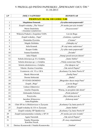 V PRZEGLĄD PIEŚNI PAPIESKIEJ „ŚPIEWAJMY OJCU ŚW.” 11.10.2013 LP IMIĘ I NAZWISKO REPERTUAR PIERWSZY BLOK OD GODZ. 9:00 1 Magdalena Tomczak „Ty tylko mnie poprowadź” 2 Zespół wokalny „The Voices” „W mroku jest tyle światła” 3 Maria Dudzińska i Zuzanna Lenartowicz „Oczyszczenie” 4 Wiktoria Poduch z Zespołem YAPA List do Boga 5 Zespół wokalny „Yapa” „Godzien, o godzien” 6 Dominika Żywicka „Ciemno” 7 Magda Zielińska „Odnajdę cię” 8 Julia Kramek „W ciąż mnie zadziwiasz” 9 Kacper Gołda „Ty tylko mnie poprowadź” 10 Joanna Kamińska „Światło” 11 Julia Filipek „Stanąć przed nowym dniem” 12 Schola dziecięca gr. II z Gołębia „Santo Subito” 13 Schola dziecięca gr. i z Gołębia „ Pokój zostawiam Wam ” 14 Schola młodzieżowa z Gołębia „Nie lękajcie się” 15 Nikola i Karina Ciesielska „Tak mówił Papież” 16 Uczniowie z kl. VI a i III b „Kochamy Cię Janie Pawle II” 17 Marek Mierzwiak „Zaufaj Panu” 18 Dorota Sobiesiak „Barka” 19 IVVENES DOMINO „Błogosław duszo moja Pana” 20 Zespół „Waja” „List do Boga” 21 Łukasz Zdanowicz „Modlitwa” 22 Amelia Chojecka Wierzę, że przyjdzie taki dzień” 23 Aleksandra Soleniec „Pieśń jedności” 24 Pozytywka „Hej rodzina jest ok.” 25 Jarosław Klimowicz Anna Rogińska „Schowaj mnie” 26 Chór SP im A.Mickiewicza w Żyrzynie „Kochamy Cię Janie pawle II” 27 Zespół wokalny kl. II b w Żyrzynie „Santo Subito” 28 Zespół wokalny SP Opatkowice „Kochamy Cię Janie Pawle II” 29 Zespół instrumentalno-wokalny z SP 10 „W mroku jest tyle światła” 30 Agata Narożnik „Tak mówił Papież” 31 Natalia Wenerska Karolina Nocek „W ciszy niepokalanej” 32 Dariusz Kosmowski i Natalia Kosmowska „Telefon” LP IMIĘ I NAZWISKO REPERTUAR DRUGI BLOK OD GODZ. 17:00 33 Kamila Niećko „Barka” 34 Karolina Przygocka „Na drugi brzeg” 35 Jowita Szatraj „Jak pielgrzym” 36 Agata Zając „Panience na dobranoc” 37 Paulina Król „Zamiast” 38 Gabriela Jańczak „Ty tylko mnie poprowadź 39 Klaudia Goral „Pioseneczka” 40 Klaudia Jaksim „Ty wskazałeś drogę do miłości” 41 Zespół wokalny „MUSIC CLUB 2” „Ty prowadzisz nas” 42 Justyna Kowalczyk & Robert Sosik „Schowaj mnie” 43 Zespół „Podzamcze” „Janie Pawle teraz przyjdź” 44 Michał Wachowiec „Moje miasto Wadowice” 45 Maksymilian, Miłosz, Maciej Wachowiec „Barka” 46 Rodzina Wachowców „Nie lękajcie się” 47 Trio Czarneccy „Polskie kwiaty”