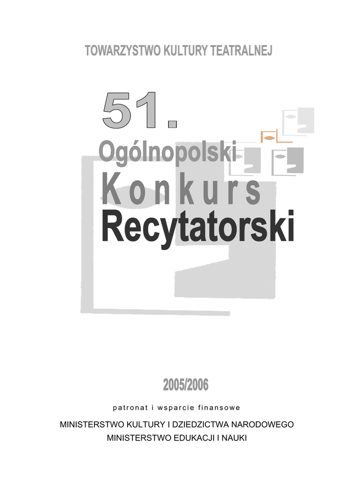 patronat i wsparcie finansowe MINISTERSTWO KULTURY I DZIEDZICTWA NARODOWEGO MINISTERSTWO EDUKACJI I NAUKI W rocznicowym kręgu (Warszawa – Lwów – Gdynia) To było piękne zdarzenie: 6 czerwca 2005 roku w Teatrze Collegium Nobilium warszawskiej Akademii Teatralnej odbył się koncert przypominający o niezwykłym jubileuszu – o 50. edycji Ogólnopolskiego Konkursu Recytatorskiego. Na scenie stawili się laureaci z lat dawniejszych – Irena Jun, Henryk Boukołowski, Olgierd Łukaszewicz, Tadeusz Malak – także z lat bliższych i całkiem niedawnych – Bożena Suchocka, Sławomir Orzechowski, Jarosław Gajewski, Joanna Trzepiecińska, Michał Żebrowski. A na przepełnionej widowni – skupienie i zasłuchanie: dwie godziny mistrzowskiego słowa okazały się chwilą, kończącą się życzeniem – róbcie taki koncert co miesiąc i chrońcie OKR. * Tak było wczoraj. A jutro? Jutro – jeśli doczekamy – organizator Konkursu czyli Towarzystwo Kultury Teatralnej, obchodzić będzie s t u l e c i e swego istnienia. Dzień narodzin to 9 kwietnia 1907 roku, miejsce – Lwów, pierwsze imię – Związek Teatrów i Chórów Włościańskich. W długiej drodze dużo się zmieniało. Były różne nazwy – Związek Teatrów Ludowych, Związek Teatrów Amatorskich. Były rozbłyski niezwykłej aktywności i lata przymusowego milczenia. Nigdy jednak, w najtrudniejszych nawet chwilach, działacze stowarzyszenia nie zapomnieli o idei, która była u podstaw: …liczne grono ludzi z różnych odłamów społeczeństwa, zogniskowane ku wspólnej idei, wzięło sobie za cel drogą najpewniejszą, bo drogą żywego słowa i działania estetycznego, trafić do duszy ludu owocniej niż to może uczynić książka i myśl abstrakcyjna. Postanowiło przez zmysł Piękna dotrzeć do serc… Czy zwrot „drogą najpewniejszą, bo drogą żywego słowa” nie jest przeczuciem tego, co stało się niespełna pół wieku później, przeczuciem narodzin Ogólnopolskiego Konkursu Recytatorskiego? Czy mogło Towarzystwo nie przejąć w pewnym momencie (bo w roku 1953, gdy OKR inicjowano, było skazane na niebyt) zjawiska, które poeta nazwał Wolnym Ruchem Twórczej Mowy? Sprawuje nad nim pieczę od kilku dziesiątków lat i nim właśnie zapowiada przyszłoroczną niezwykłą rocznicę. * Wczoraj… jutro – pozostaje jeszcze dzisiaj, czyli 51. Ogólnopolski Konkurs Recytatorski. I on towarzyszy rocznicy szczególnej, 80-leciu Miasta Gdynia. To był czas i dzieło równie pionierskie jak początki naszego stowarzyszenia, wszystko zaczynało się od nowa, od niczego. W kilka lat po odzyskaniu niepodległości, Sejm Ustawodawczy uchwalił, że rybacka wioska stanie się głównym morskim portem II Rzeczpospolitej. W imponującym tempie dawna – pamiętająca XIII wiek – osada cystersów przeobraziła się w miasto. Dzisiaj Miasto Gdynia zaprasza recytatorów, by wśród wielu rocznicowych zdarzeń należne miejsce znalazło artystyczne, polskie słowo. Zarząd Główny Towarzystwa Kultury Teatralnej Regulamin I. 1. Ogólnopolski Konkurs Recytatorski jest imprezą otwartą. 2. Warunkiem udziału jest przygotowanie repertuaru nie prezentowanego w poprzednich OKR i odpowiadającego założeniom wybranego turnieju (dział II regulaminu). Repertuar zgłoszony i wykonany w przeglądzie stopnia najniższego, nie może być zmieniony. Wykonawca może reprezentować tylko jedną instytucję ( np.: szkołę, ośrodek kultury, klub). 3. Zgłoszenie odbywa się poprzez złożenie KARTY UCZESTNIKA w sekretariacie organizatora najniższego w województwie stopnia Konkursu - w terminie przez niego ustalonym. 4. W Konkursie uczestniczyć ponadgimnazjalnej i starsze. mogą osoby uczęszczające do szkoły 5. Konkurs prowadzony jest w drodze wielostopniowych eliminacji: a. przeglądy środowiskowe; b. przeglądy miejskie, powiatowe; c. przeglądy rejonowe; - zasady kwalifikacji laureatów do przeglądu wyższego szczebla oraz drogę eliminacji ustalają wojewódzcy organizatorzy konkursu; - przedstawiciel rejonu wchodzi w skład wojewódzkiego komitetu organizacyjnego oraz wojewódzkiego jury. a. Przeglądy wojewódzkie: - odbywają się do 7 maja 2006 roku, dla wszystkich turniejów OKR; - w jury uczestniczy przedstawiciel krajowego komitetu organizacyjnego. b. Przeglądy finałowe: • turniej recytatorski i wywiedzione ze słowa 1 – 4 czerwca 2006 roku w Gdyni; • turniej teatrów jednego aktora – zarazem XXXV Ogólnopolskie Spotkania Amatorskich Teatrów Jednego Aktora 9 – 11 czerwca 2006 roku w Zgorzelcu; • turniej poezji śpiewanej 20 – 24 czerwca 2006 roku we Włocławku (poprzedzony warsztatami). 6. OKR jest imprezą o charakterze artystyczno-metodycznym: organizatorzy wszystkich przeglądów zapewnią uczestnikom udział w zajęciach seminaryjnych i warsztatowych oraz możliwość indywidualnej rozmowy z członkami Sądów Konkursowych. II. 51. Ogólnopolski Konkurs Recytatorski przeprowadzony będzie w formie czterech turniejów. TURNIEJ RECYTATORSKI 1. Uczestnicy turnieju występują w dwóch kategoriach: - młodzieży szkół ponadgimnazjalnych; - dorosłych. 2. Repertuar uczestników obejmuje 3 utwory w całości lub fragmentach - 2 utwory poetyckie i prozę. 3. Do prezentacji uczestnik wybiera 2 utwory: prozę oraz utwór poetycki. Łączny czas wykonania nie może przekroczyć 10 minut. TURNIEJ POEZJI ŚPIEWANEJ 1. Uczestnicy występują bez podziału na kategorie. 2. Wykonawca jest solistą. 3. Repertuar obejmuje: - 3 utwory śpiewane - 1 utwór recytowany. 4. W odniesieniu do repertuaru śpiewanego obowiązują następujące zasady: - wykonywane mogą być wiersze, które zostały opublikowane w książkach lub prasie literackiej; - uczestnicy mogą wykonać trzeci utwór z tekstem własnym. 5. Do prezentacji uczestnik zgłasza 2 utwory śpiewane, 1 recytowany i ewentualnie jako trzeci śpiewany utwór z tekstem własnym. (Do przeglądów wojewódzkich włącznie prezentacja utworu recyto