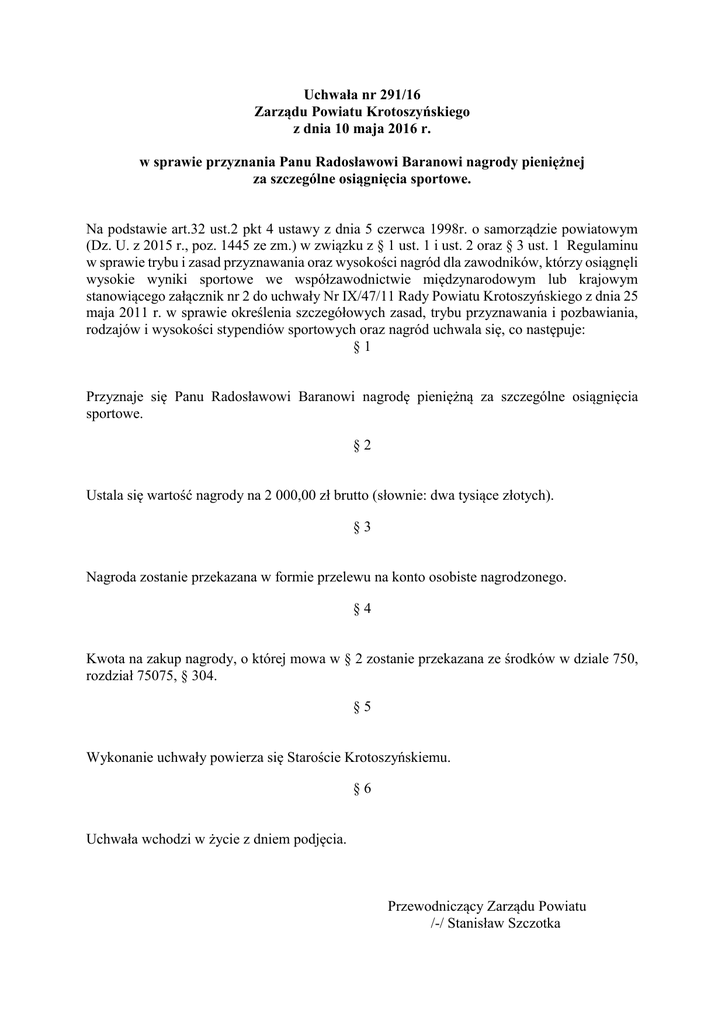 Uchwała nr 291/16 Zarządu Powiatu Krotoszyńskiego z dnia 10 maja 2016 r. w sprawie przyznania Panu Radosławowi Baranowi nagrody pieniężnej za szczególne osiągnięcia sportowe. Na podstawie art.32 ust.2 pkt 4 ustawy z dnia 5 czerwca 1998r. o samorządzie powiatowym (Dz. U. z 2015 r., poz. 1445 ze zm.) w związku z § 1 ust. 1 i ust. 2 oraz § 3 ust. 1 Regulaminu w sprawie trybu i zasad przyznawania oraz wysokości nagród dla zawodników, którzy osiągnęli wysokie wyniki sportowe we współzawodnictwie międzynarodowym lub krajowym stanowiącego załącznik nr 2 do uchwały Nr IX/47/11 Rady Powiatu Krotoszyńskiego z dnia 25 maja 2011 r. w sprawie określenia szczegółowych zasad, trybu przyznawania i pozbawiania, rodzajów i wysokości stypendiów sportowych oraz nagród uchwala się, co następuje: §1 Przyznaje się Panu Radosławowi Baranowi nagrodę pieniężną za szczególne osiągnięcia sportowe. §2 Ustala się wartość nagrody na 2 000,00 zł brutto (słownie: dwa tysiące złotych). §3 Nagroda zostanie przekazana w formie przelewu na konto osobiste nagrodzonego. §4 Kwota na zakup nagrody, o której mowa w § 2 zostanie przekazana ze środków w dziale 750, rozdział 75075, § 304. §5 Wykonanie uchwały powierza się Staroście Krotoszyńskiemu. §6 Uchwała wchodzi w życie z dniem podjęcia. Przewodniczący Zarządu Powiatu /-/ Stanisław Szczotka Uzasadnienie Pan Radosław Baran jest zawodnikiem w zapasach - styl wolny - oraz wychowankiem klubu LKS CERAMIK i mieszkańcem powiatu krotoszyńskiego. Dzięki osiągniętym ostatnio sukcesom otrzymał kwalifikację olimpijską i będzie reprezentował Polskę na XXXI Letnich Igrzyskach Olimpijskich, jako jeden z ośmiu zapaśników polskich w stylu wolnym. Fakt otrzymania kwalifikacji w bardzo mocno i licznie obsadzonej dyscyplinie świadczy o wysokiej klasie zawodnika i jego wielkiej pracowitości. Pan Radosław Baran w przeszłości zmagał się z ciężką chorobą, i pomimo to nie zrezygnował z uprawiania sportu na najwyższym poziomie. Jest wspaniałym przykładem dla młodzieży i znakomitym ambasadorem Ziemi Krotoszyńskiej. Jednocześnie należy zaznaczyć, że pochodzi z niezamożnej wielodzietnej rodziny, a sport łączy z nauką. Kwalifikacja olimpijska osiągnięta przez tego młodego zawodnika wydaje się wydarzeniem bez precedensu i zasługuje na uhonorowanie, dlatego przyjęcie uchwały jest jak najbardziej uzasadnione.