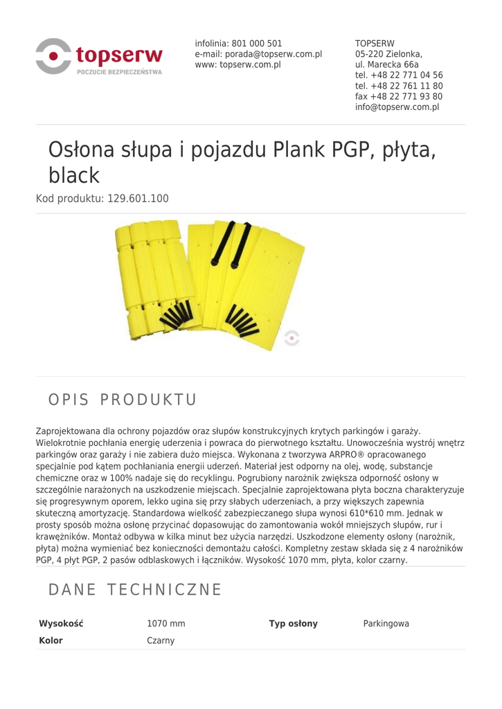 infolinia: 801 000 501 e-mail: [email protected] www: topserw.com.pl TOPSERW 05-220 Zielonka, ul. Marecka 66a tel. +48 22 771 04 56 tel. +48 22 761 11 80 fax +48 22 771 93 80 [email protected] Osłona słupa i pojazdu Plank PGP, płyta, black Kod produktu: 129.601.100 OPIS PRODUKTU Zaprojektowana dla ochrony pojazdów oraz słupów konstrukcyjnych krytych parkingów i garaży. Wielokrotnie pochłania energię uderzenia i powraca do pierwotnego kształtu. Unowocześnia wystrój wnętrz parkingów oraz garaży i nie zabiera dużo miejsca. Wykonana z tworzywa ARPRO® opracowanego specjalnie pod kątem pochłaniania energii uderzeń. Materiał jest odporny na olej, wodę, substancje chemiczne oraz w 100% nadaje się do recyklingu. Pogrubiony narożnik zwiększa odporność osłony w szczególnie narażonych na uszkodzenie miejscach. Specjalnie zaprojektowana płyta boczna charakteryzuje się progresywnym oporem, lekko ugina się przy słabych uderzeniach, a przy większych zapewnia skuteczną amortyzację. Standardowa wielkość zabezpieczanego słupa wynosi 610*610 mm. Jednak w prosty sposób można osłonę przycinać dopasowując do zamontowania wokół mniejszych słupów, rur i krawężników. Montaż odbywa w kilka minut bez użycia narzędzi. Uszkodzone elementy osłony (narożnik, płyta) można wymieniać bez konieczności demontażu całości. Kompletny zestaw składa się z 4 narożników PGP, 4 płyt PGP, 2 pasów odblaskowych i łączników. Wysokość 1070 mm, płyta, kolor czarny. DANE TECHNICZNE Wysokość 1070 mm Kolor Czarny Typ osłony Parkingowa AKCESORIA Komplet pasów mocujących (2) do PGP, długość 3 m, yellow 129.602.101 Komplet pasów mocujących (2) do PGP, długość 3 m, black 129.602.100