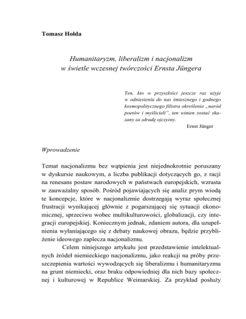 Tomasz Hołda Humanitaryzm, liberalizm i nacjonalizm w świetle wczesnej twórczości Ernsta Jüngera Ten, kto w przyszłości jeszcze raz użyje w odniesieniu do nas śmiesznego i godnego kosmopolitycznego filistra określenia „naród poetów i myślicieli”, ten winien zostać skazany za zdradę ojczyzny. Ernst Jünger Wprowadzenie Temat nacjonalizmu bez wątpienia jest niejednokrotnie poruszany w dyskursie naukowym, a liczba publikacji dotyczących go, z racji na renesans postaw narodowych w państwach europejskich, wzrasta w zauważalny sposób. Pośród pojawiających się analiz prym wiodą te koncepcje, które w nacjonalizmie dostrzegają wyraz społecznej frustracji wynikającej głównie z pogarszającej się sytuacji ekonomicznej, sprzeciwu wobec multikulturowości, globalizacji, czy integracji europejskiej. Koniecznym jednak, zdaniem autora, dla uzupełnienia wyłaniającego się z debaty naukowej obrazu, będzie przybliżenie ideowego zaplecza nacjonalizmu. Celem niniejszego artykułu jest przedstawienie intelektualnych źródeł niemieckiego nacjonalizmu, jako reakcji na próby przeszczepienia wartości wywodzących się liberalizmu i humanitaryzmu na grunt niemiecki, oraz braku odpowiedniej dla nich bazy społecznej i kulturowej w Republice Weimarskiej. Za przykład posłuży Tomasz Hołda wczesna publicystyka Ernsta Jüngera – osoby w żaden sposób nieprzypadkowej, bowiem będącej postacią ikoniczną dla Rewolucji Konserwatywnej – szerokiego nurtu intelektualnego, rozwijającego się w Niemczech w okresie międzywojennym. Artykuł został podzielony na trzy podstawowe części. W pierwszej zaprezentowana zostanie sylwetka Jüngera, ponieważ jego życiorys okazał się kluczowym, zarówno dla promowanej przez Jüngera życiowej postawy, jak i dla recepcji jego dzieł w środowisku niemieckich weteranów i intelektualistów. Ponadto, co równie istotne, w tej części opisane zostanie ogólne tło historyczne, w ramach którego kształtował się niemiecki sprzeciw wobec zastanej rzeczywistości politycznej. Następnie zaprezentowana zostanie intelektualna droga Jüngera, jaką przebył od krytyki liberalizmu i humanitaryzmu do pozycji radykalnego nacjonalizmu, będącego w ujęciu niemieckiego pisarza, negacją dominujących, mieszczańskich postaw. Artykuł kończy się podsumowaniem, którego tezą podstawową jest stwierdzenie, że źródeł postaw radykalnych – zarówno narodowych czy religijnych – nie należy upatrywać jedynie w bieżącej sytuacji ekonomicznej, ale również w domniemanej, moralnej i intelektualnej kompromitacji dotychczas dominujących idei, z liberalizmem i humanitaryzmem włącznie. 1. Republika Weimarska oczyma Ernsta Jüngera Pomimo licznych kontrowersji związanych z jego osobą, Jünger wywarł przemożny wpływ na kulturę niemiecką ubiegłego wieku. Będąc weteranem dwóch wojen światowych – w pierwszej był czternastokrotnie ranny w boju – zaskarbił sobie łaski wśród niemieckich militarystów, stając się niejako głosem pokolenia żołnierzy frontowych. Jako utalentowany pisarz i filozofujący eseista, zasłynął z krytyki wymierzonej przeciw postanowieniom Traktatu 52 Humanitaryzm, liberalizm i nacjonalizm... Wersalskiego oraz Republiki Weimarskiej, stanowiącej jego ucieleśnienie. Powstałe w wyniku przegranej przez II Rzesze wojny, niemieckie państwo od samego początku swojego istnienia spotkało się bowiem z nieprzejednaną niechęcią szerokich, niemieckich kręgów opiniotwórczych – nie tylko środowisk weteranów, ale przede wszystkim intelektualistów kształtujących życie kulturowe powojennych Niemiec. Krytyka sformułowana przez Jüngera nie była zatem odosobniona, a wpisywała się w szerszy, ogólnonarodowy trend powszechnego odrzucenia warunków pokoju. Jednakże racji na indywidualne doświadczenia wojenne gera, jego krytycyzm przybrał formę bezkompromisową, radykalną i na wskroś wojowniczą. Republika Weimarska bowiem, jako państwo ufundowane na narzuconych siłą zasadach liberalizmu społecznego, jawiło się pisarzowi jako twór całkowicie obcy, przeszczep, który w żaden sposób nie może się przyjąć na gruncie Niemieckim. Jünger na kartach Robotnika posunął się nawet do stwierdzenia, że Niemiec niezdolny jest do tego, aby „spożytkować tę wolność, ofiarowaną mu przy pomocy wszelkich sztuk miecza i perswazji i zapisaną w powszechnej deklaracji praw człowieka; była dlań (dla Niemca – T.H), narzędziem, które nie miało związku z jego najbardziej nymi organami”1. Mówiąc wprost podstawowym zarzutem skierowanym w stronę nowej państwowości była nieadekwatność narzuconych struktur społecznych względem niemieckiej esencji kulturowej. Zdaniem Jüngera taki stan rzeczy wynikał z faktu, że Republika Weimarska, to jedynie przejaw woli zwycięzcy – zinstytucjonalizowane narzędzie represji mające na celu zniszczenie tradycyjnego ducha niemieckiego konstytuującego dotychczas wspólnotę Rzeszy. Ponadto, co istotne, ten siłą narzucony dyktat nie tylko niszczy narodowego „ducha niemieckiego” poprzez ciągłe imputowanie Niemcom 1 E. Jünger, Robotnik – panowanie i forma bytu, przeł. W. Kunnicki, WN PWN, Warszawa 2010, s. 16. 53 Tomasz Hołda kompleksu winy, ale również jest narzędziem zbójeckiego, materialnego wyzysku – co w dobitny sposób stwierdza brat Jüngera, Friedrich Georg Jünger. Zdaniem F.G. Jüngera „przeciwnicy Niemiec nie zadowolili się narzuceniem wywalczonej przez siebie przewagi środkami polityczno–wojskowymi, lecz zespolili prawo silniejszego z instrumentami moralnego nacisku i jako strażnicy wyższych wartości moralnych wymusili wyznanie win”2. Scalenie tradycyjnej, politycznej przemocy – skądinąd akceptowanej przez braci Jüngerów – z rodzajem moralnego szantażu zrodziło sytuację, w której pokonany spotkał się z niespotykanym do tej pory natężeniem represji. Paraliż woli wywołany wstydem z