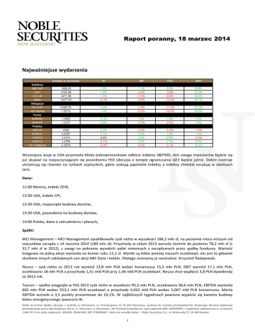 Raport poranny, 18 marzec 2014 Najważniejsze wydarzenia Wczorajsza sesja w USA przyniosła blisko jednoprocentowe odbicie indeksu S&P500, dziś uwaga inwestorów będzie się już skupiać na rozpoczynającym się posiedzeniu FED (decyzja o tempie ograniczania QE3 będzie jutro). Dobre nastroje utrzymują się również na rynkach azjatyckich, gdzie zyskują japońskie indeksy a indeksy chińskie oscylują w okolicach zera. Dane: 11:00 Niemcy, indeks ZEW, 13:30 USA, indeks CPI, 13:30 USA, rozpoczęte budowy domów, 13:30 USA, pozwolenia na budowę domów, 14:00 Polska, dane o zatrudnieniu i płacach, Spółki: MCI Management – MCI Management opublikowało zysk netto w wysokości 186,2 mln zł, na poziomie nieco niższym od szacunków zarządu z 14 stycznia 2014 (189 mln zł). Przychody w całym 2013 wzrosły istotnie do poziomu 78,2 mln zł (z 31,7 mln zł w 2012), z uwagi na pobranie wysokich opłat zmiennych z zarządzanych przez spółkę funduszy. Wartość księgowa na jedną akcje wyniosła na koniec roku 12,2 zł. Wyniki są lekko poniżej naszych oczekiwań, ale jest to głównie skutkiem innych zakładanych cen akcji ABC Data i Indeks. Dlatego oceniamy je neutralnie. Krzysztof Radojewski. Neuca – zysk netto za 2013 rok wyniósł 13,8 mln PLN wobec konsensusu 15,5 mln PLN, EBIT wyniósł 17,1 mln PLN, oczekiwano 18 mln PLN a przychody 1,41 mld PLN przy 1,46 mld PLN oczekiwań. Neuca chce wypłacić 3,8 PLN dywidendy za 2013 rok. Tauron – spółka osiągnęła w IVQ 2013 zysk netto w wysokości 95,5 mln PLN, oczekiwano 36,6 mln PLN, EBITDA wyniosła 665 mln PLN wobec 553,1 mln PLN oczekiwań a przychody 4,922 mld PLN wobec 5,007 mld PLN konsensusu. Marża EBITDA wzrosła o 3,5 punkty procentowe do 19,1%. W najbliższych tygodniach powinna wyjaśnić się kwestia budowy bloku energetycznego Jaworzno III. 1 Comarch – spółka zakłada w 2014 roku przychody z segmentu publicznego co najmniej takie jak rok wcześniej (158 mln PLN). Kernel – informacja o nabyciu w dniach 12-14 marca 50 tysięcy akcji spółki po cenie 23 PLN przez spółkę kontrolowaną przez insidera. Analiza techniczna: Waluty AUDUSD D1: Kurs dolara australijskiego kolejny raz znalazł się przy linii szyi formacji odwróconej głowy z ramionami, która mogłaby zapowiadać zmianę trendu. Ostatnia próba wybicia okazała się nieskuteczna i kurs tylko cieniem wybił podstawę powyższej formacji. Po krótkotrwałym cofnięciu kupujący ponownie mogą próbować wybić ważny punkt oporu w okolicach poziomu 0,9085, przy którym wypada także czerwona linia trendu spadkowego. Trwałe przełamanie tych punktów obrony otworzyłoby drogę w kierunku poziomu 0,9510, wynikającego z zasięgu RGR-a. Za powyższym scenariuszem może także przemawiać poprawiająca się sytuacja fundamentalna w Australii. Na początku marca został opublikowany lepszy od prognoz odczyt PKB za IV kwartał, który wyniósł 2,8% r/r (prognozy wskazywały na 2,5%). Dodatkowo poprawił się także bilans handlu zagranicznego (1,43 mld. vs prognoza 0,27 mld.), sprzedaż detaliczna za styczeń ( wzrost 1,2% vs prognoza 0,5%), indeks PMI dla przemysłu i PSI dla usług, a także znacząco przyrosła ilość nowych domów oddanych do użytku. Na marcowym posiedzeniu Bank Centralny Australii pozostawił stopy procentowe na niezmienionym poziomie 2,5%. Pomimo utrzymującego się relatywnie wysokiego bezrobocia na poziomie 6% (najwyższy od 10 lat poziom dla tego kraju), to ostatnie dane o zatrudnieniu pozytywnie zaskoczyły i wskazały na przyrost o 47,3 tys. wobec prognoz na poziomie 18 tys. Powyższe informacje zwiększają zatem szansę na odrobienie strat w najbliższych tygodniach przez dolara australijskiego. Alternatywnym scenariuszem byłoby odbicie po raz kolejny od oporu w okolicach 0,9085 oraz od czerwonej linii trendu spadkowego, co z kolei przemawiałoby za dalszymi spadkami do poziomów 0,8890 oraz 0,8657. 2 Analiza techniczna: GPW Asseco Linia trendu wzrostowego (obecnie 47.0), jaka uformowała się po opuszczeniu górą opadającego klina z okresu grudzień-styczeń została końcem ubiegłego tygodnia tylko lekko naruszona, a prowadząca do tego korekta przyjęła postać prostokątnego trójkąta z dolnym ograniczeniem 46.2 (najbliższe istotne wsparcie). Wczorajsze wyjście ponad górne ograniczenie trójkąta wskazuje na możliwość zakończenia korekty. Tym samym sięgający 51.5 potencjał wzrostowy związany z wybiciem z 2miesięcznego klina nadal pozostaje aktualny. NajwaŜniejsze wydarzenia, dane, wiadomości ze spółek: Departament Analiz Rynkowych Noble Securities S.A. [email protected] Analiza techniczna – waluty/rynki zagraniczne: Dominik Łebek, Departament Rynków Zagranicznych [email protected] Tel: +48 22 212 54 37 Analiza techniczna – GPW: Krzysztof Ojczyk, Starszy Analityk [email protected] Tel: +48 12 422 31 00 wew.113 3 Niniejsze opracowanie jest jedynie materiałem informacyjnym przygotowanym przez analityka (analityków) Noble Securities S.A. oraz ma charakter wyłącznie informacyjny i nie stanowi oferty ani rekomendacji zawarcia transakcji kupna lub sprzedaży jakiegokolwiek instrumentu finansowego, towaru czy innego instrumentu lub produktu. Niniejsze opracowanie ani żaden z jego zapisów nie stanowi: • oferty w rozumieniu art. 66 ustawy z dnia 23 kwietnia 1964 r. - kodeks cywilny (Dz. U. Nr 16, poz. 93, z późn. zm.), • podstawy do zawarcia umowy lub powstania zobowiązania, • publicznego proponowania nabycia instrumentów finansowych ani oferty publicznej instrumentów finansowych w rozumieniu art. 3 ustawy z dnia 29 lipca 2005 r. o ofercie publicznej i warunkach wprowadzania instrumentów finansowych do zorganizowanego systemu obrotu oraz o spółkach publicznych (tekst jednolity: Dz. U. z 2009 r. Nr 185, poz. 1439, z późn. zm.). Niniejsze opracowanie zostało przygotowane z należytą starannością i rzetelnością, na podstawie ogólnodostępnych informacji, które autor (aut