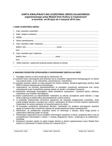 KARTA KWALIFIKACYJNA UCZESTNIKA OBOZU KAJAKOWEGO organizowanego przez Wiejski Dom Kultury w Czyżowicach w terminie: od 28 lipca do 3 sierpnia 2014 roku I. DANE UCZESTNIKA OBOZU 1. Imię i nazwisko uczestnika ....................................................................................................................... 2. Data i miejsce urodzenia .......................................................................................................................... 3. PESEL ..................................................................................................................................................... 4. Adres zameldowania................................................................................................................................. 5. Imię i nazwisko matki / opiekunki ............................................................................................................. telefon: dom ........................................................... praca ........................................................................ kom. .......................................................................................................................................................... 6. Imię i nazwisko ojca / opiekuna ................................................................................................................ telefon: dom ....................................................... .praca ........................................................................... kom. .......................................................................................................................................................... 7. Adres rodziców / opiekunów podczas pobytu dziecka na obozie ......................................................................................................................................................................... ........................................................................................................................................................... II. WNIOSEK RODZICÓW (OPIEKUNÓW) O SKIEROWANIE DZIECKA NA OBÓZ 1. Wysyłając dziecko na obóz przyjmuję do wiadomości, że: a) uczestnik obozu zobowiązany jest stosować się do wszystkich regulaminów obowiązujących na obozie oraz poleceń kadry, w tym: kierownika, wychowawców i instruktorów. b) uczestnik powinien zabrać ze sobą paszport lub dowód osobisty, aktualną legitymację szkolną, kartę ŚRKCH (dowód ubezpieczenia zdrowotnego) c) organizatorzy nie ponoszą odpowiedzialności za pieniądze, przedmioty wartościowe oraz rzeczy pozostawione przez Uczestników podczas pobytu na obozie i w środkach transportu. d) uczestników obowiązuje bezwzględny zakaz posiadania, spożywania i używania tytoniu, alkoholu, narkotyków oraz środków odurzających. e) rodzice (opiekunowie) są odpowiedzialni materialnie za szkody wyrządzone przez dziecko i z tego tytułu przyjmują na siebie pełną odpowiedzialność cywilno-prawną. f) w przypadku drastycznego naruszenia regulaminu lub rażącego postępowania uczestnika, może zostać podjęta decyzja o usunięciu go z obozu i odwiezieniu do domu na koszt rodziców (opiekunów). Organizator nie zwraca pieniędzy za niewykorzystane dni obozu. 2. W przypadku podejrzenia spożywania alkoholu, narkotyków lub środków odurzających wyrażam zgodę na badanie stanu trzeźwości dziecka lub przeprowadzenia testów narkotykowych. 3. Stwierdzam, że podałam/em wszystkie znane mi informacje o dziecku, które mogą pomóc w zapewnieniu właściwej opieki na obozie. 4. Potwierdzam zapoznanie się ze wszelkimi informacjami zawartymi w karcie, programie obozu oraz ze szczegółowymi informacjami o obozie i z treścią „Regulaminu obozu”, przyjmuję je do wiadomości i akceptuję. 5. Niniejszym wyrażam zgodę na udział mojego dziecka w obozie organizowanym przez Wiejski Dom Kultury w Czyżowicach w dniach 28 lipca do 3 sierpnia 2014 r. ................................................ (miejscowość i data) ............................................... (podpis matki / opiekunki) ............................................ (podpis ojca / opiekuna) III. INFORMACJA RODZICÓW (OPIEKUNÓW) O STANIE ZDROWIA DZIECKA 1. 2. 3. 4. 5. 6. 7. Dolegliwości lub objawy, które występują u dziecka (podkreślić te, które występują): omdlenia, drgawki z utratą przytomności, częste bóle głowy, zaburzenia równowagi, częste wymioty, krwotoki z nosa, ataki duszności, bezsenność, przewlekły kaszel, szybkie męczenie się, częste bóle brzucha, bóle stawów,lęki nocne, moczenia nocne, urazy kończyn, inne:.............................................................. Przebyte choroby (wskazać rok): błonica................., żółtaczka zakaźna................., dur (tyfus) brzuszny .................... , inne .................................................................................................................... Dziecko jest uczulone na ......................................................................................................................... Przyjmuje stale leki ................................................................................... w dawce ............................... Jak znosi jazdę autokarem? ..................................................................................................................... Czy nosi: aparat ortodontyczny ......................................... , okulary ....................................................... Inne ........................................................................................................................................................... W razie zagrożenia zdrowia lub życia dziecka zgadzam się na jego leczenie, niezbędne zabiegi diagnostyczne i operacje. .............................................. (miejscowość i data) ................................