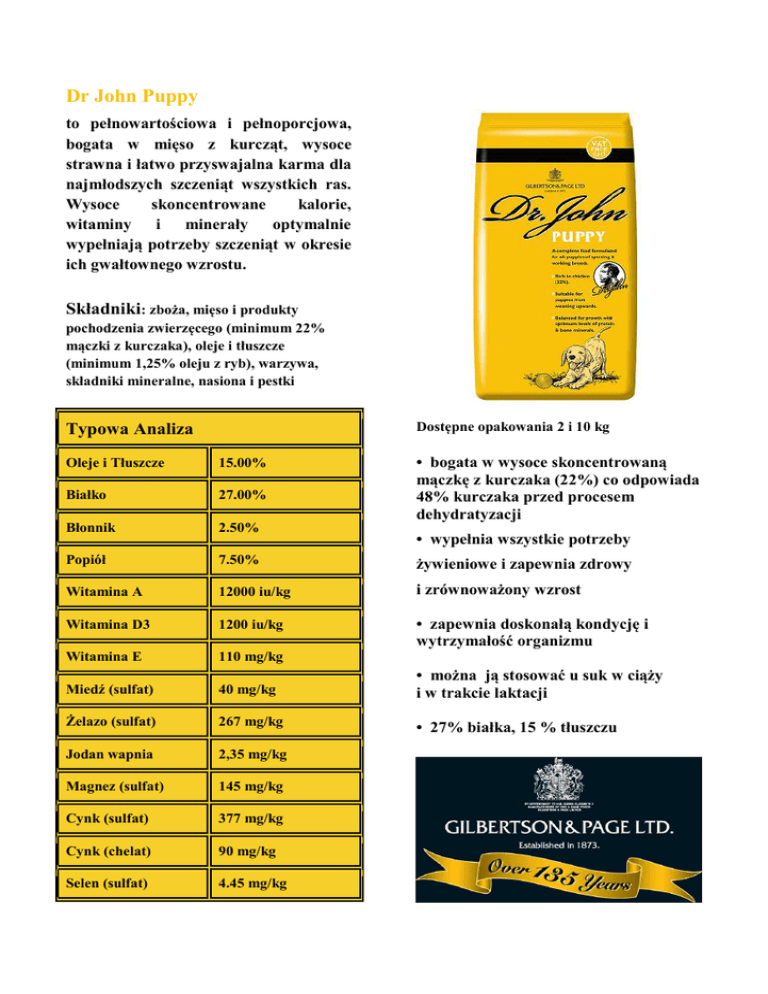 Dr John Puppy to pełnowartościowa i pełnoporcjowa, bogata w mięso z kurcząt, wysoce strawna i łatwo przyswajalna karma dla najmłodszych szczeniąt wszystkich ras. Wysoce skoncentrowane kalorie, witaminy i minerały optymalnie wypełniają potrzeby szczeniąt w okresie ich gwałtownego wzrostu. Składniki: zboża, mięso i produkty pochodzenia zwierzęcego (minimum 22% mączki z kurczaka), oleje i tłuszcze (minimum 1,25% oleju z ryb), warzywa, składniki mineralne, nasiona i pestki Dostępne opakowania 2 i 10 kg Typowa Analiza • bogata w wysoce skoncentrowaną mączkę z kurczaka (22%) co odpowiada 48% kurczaka przed procesem dehydratyzacji Oleje i Tłuszcze 15.00% Białko 27.00% Błonnik 2.50% Popiół 7.50% żywieniowe i zapewnia zdrowy Witamina A 12000 iu/kg i zrównoważony wzrost Witamina D3 1200 iu/kg • zapewnia doskonałą kondycję i wytrzymałość organizmu Witamina E 110 mg/kg Miedź (sulfat) 40 mg/kg • można ją stosować u suk w ciąży i w trakcie laktacji Żelazo (sulfat) 267 mg/kg • 27% białka, 15 % tłuszczu Jodan wapnia 2,35 mg/kg Magnez (sulfat) 145 mg/kg Cynk (sulfat) 377 mg/kg Cynk (chelat) 90 mg/kg Selen (sulfat) 4.45 mg/kg • wypełnia wszystkie potrzeby