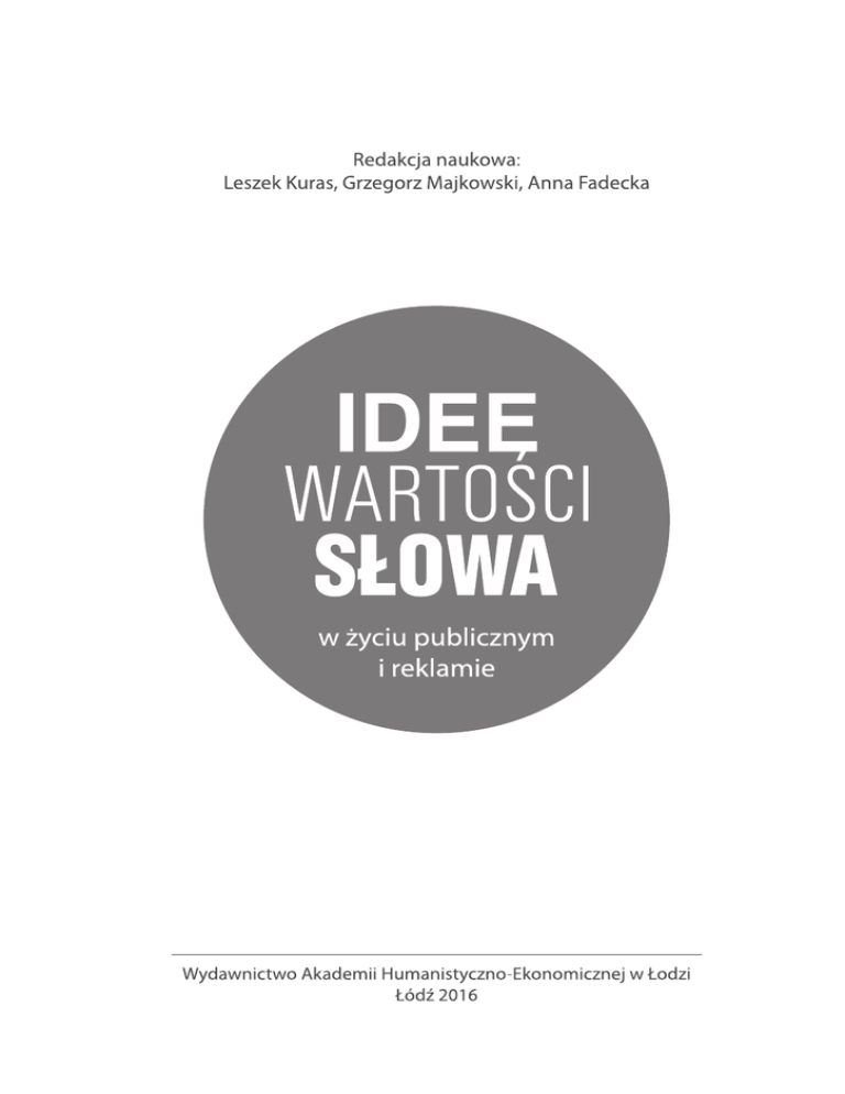 Recenzenci prof. zw. dr hab. Feliks Pluta prof. zw. dr hab. Ireneusz Świtała prof. nadzw. dr hab. Aneta Majkowska Współpraca redakcyjna Justyna Makowska, Marta Wybraniec Projekt okładki Joanna Niekraszewicz Korekta Iwona Cłapińska, Michael Fleming, Marcin Jaźwiec Redaktor prowadzący Iwona Morawska © Copyright by Akademia Humanistyczno-Ekonomiczna, Łódź 2016 Wydanie pierwsze ISBN 978-83-7405-644-1 ISBN 978-83-7405-623-1 (seria „Idee, wartości, słowa”) Skład DTP Monika Poradecka Druk i oprawa OSDW Azymut sp. z o.o., Łódź, ul. Senatorska 31 Wydawnictwo Akademii Humanistyczno-Ekonomicznej w Łodzi 90-212 Łódź, ul. Sterlinga 26 tel. 426 315 908 [email protected] www.wydawnictwo.ahe.lodz.pl Spis treści Wprowadzenie..............................................................................................................................7 Introduction..................................................................................................................................9 Część I Słowo w życiu publicznym Anna Arciszewska Nazwy relacyjne w przestrzeni miejskiej Katowic...................................................................13 Anna Fadecka Grzeczność językowa w postach internautów zamieszczonych na stronie Spotted: MPK Łódź......................................................................................................................21 Agnieszka Kurowska-Janecka, Ewa Kazanecka Głos jako narzędzie komunikacji w mediach...........................................................................37 Justyna Majchrowska O perswazyjnej funkcji tytułów tekstów zamieszczanych na portalu kozaczek.pl..............47 Laura Polkowska Strategie komunikacyjne prezentowania oponenta politycznego jako wroga na przykładzie tygodników opinii..............................................................................................57 Sylwia Sałek Współczesne sposoby i formy komunikowania się w zespole rozproszonym.....................75 Marta Wybraniec Czasowniki performatywne a wypowiedzi konstatujące w librettach baletowych..............85 Część II Idee i wartości w życiu publicznym Marek Palczewski Makdziennikarstwo jako odmiana tabloidyzacji mediów w Polsce......................................93 Makary Krzysztof Stasiak Koncepcja pracy socjalnej jako pracy ze świadomością.........................................................103 Arkadiusz Szymanowski Religijność i wartości moralne osób pozbawionych wolności...............................................111 Kazimierz Świegocki Idea wolności w liryce Adama Mickiewicza i w twórczości Cypriana Kamila Norwida....125 Marek Wichrowski Problem transplantacji. Bioetyka i media.................................................................................135 Beata Żywicka Społeczeństwo obywatelskie – mit czy rzeczywistość? Zmiany obrazu społeczeństwa we współczesnym dyskursie publicystycznym.........................................................................145 Część III Idee, wartości, słowa w reklamie Katarzyna Burska Wartościowanie w katalogach reklamowych biur podróży....................................................163 Róża Klimczak Luksus jako kategoria semantyczna stosowana w brandingu BMW.....................................177 Viktoriya Lazareva Wizerunki kobiet w komercyjnej reklamie telewizyjnej w Polsce i Rosji.............................185 Rafał Leśniczak Zastosowanie klasycznych teorii znaku w reklamie................................................................199 Marika Świeszczak, Krzysztof Świeszczak Język kolorów w działalności marketingowej banków............................................................211 Marika Świeszczak, Krzysztof Świeszczak Nowe media vs. media tradycyjne w reklamie banków..........................................................225 Table of Contents Introduction (pol.).......................................................................................................................7 Introduction (eng.).......................................................................................................................9 Section I Words in public life Anna Arciszewska ‘Relational’ names in the urban space of Katowice..................................................................13 Anna Fadecka Language Politeness in Internet Users’ Posts at Spotted: MPK Łódź Website.....................21 Agnieszka Kurowska-Janecka, Ewa Kazanecka Voice as a tool in the media........................................................................................................37 Justyna Majchrowska The persuasive function of titles in articles published on the site kozaczek.pl....................47 Laura Polkowska Communication strategies of describing a political opponent as an enemy on the basis of Polish weekly magazines...................................................................................57 Sylwia Sałek Modern means and forms of communication in a geographically dispersed team............75 Marta Wybraniec Ballet and performative utterances............................................................................................85 Section II Ideas and values in public life Marek Palczewski McJournalism as a form of the tabloidisation of media in Poland........................................93 Makary Krzysztof Stasiak The Concept of Social Work as Conscious Work.....................................................................103 Arkadiusz Szymanowski The religiousness and moral values of people deprived of freedom......................................111 Kazimierz Świegocki The idea of freedom in the lyrical poetry of Adam Mickiewicz and the works of Cyprian Kamil Norwid ...........................................................................................................125 Marek Wichrowski Transplant debates: Ethical issues and social media............