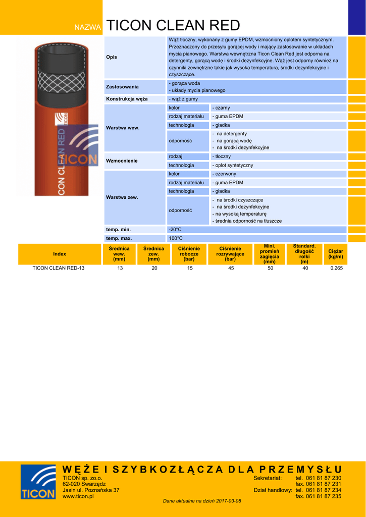 NAZWA TICON CLEAN RED Opis Wąż tłoczny, wykonany z gumy EPDM, wzmocniony oplotem syntetycznym. Przeznaczony do przesyłu gorącej wody i mający zastosowanie w układach mycia pianowego. Warstwa wewnętrzna Ticon Clean Red jest odporna na detergenty, gorącą wodę i środki dezynfekcyjne. Wąż jest odporny również na czynniki zewnętrzne takie jak wysoka temperatura, środki dezynfekcyjne i czyszczące. Zastosowania - gorąca woda - układy mycia pianowego Konstrukcja węża - wąż z gumy Warstwa wew. Wzmocnienie kolor - czarny rodzaj materiału - guma EPDM technologia - gładka odporność - na detergenty - na gorącą wodę - na środki dezynfekcyjne rodzaj - tłoczny technologia - oplot syntetyczny kolor - czerwony rodzaj materiału - guma EPDM technologia - gładka odporność - na środki czyszczące - na środki dezynfekcyjne - na wysoką temperaturę - średnia odporność na tłuszcze Warstwa zew. temp. min. -20°C temp. max. 100°C Index Index Średnica wew. (mm) Średnica zew. (mm) Ciśnienie robocze (bar) Ciśnienie rozrywające (bar) TICON CLEAN RED-13 13 20 15 45 Mini. Mini. promień promień zagięcia zagięcia (mm) (mm) 50 Standard. Standard. długość długość rolki rolki (m) (m) 40 Ciężar Ciężar (kg/m) (kg/m) 0.265 WĘŻE I SZYBKOZŁĄCZA DLA PRZEMYSŁU TICON sp. zo.o. 62-020 Swarzędz Jasin ul. Poznańska 37 www.ticon.pl Sekretariat: Dane aktualne na dzień 2017-03-08 tel. 061 81 87 230 fax. 061 81 87 231 Dział handlowy: tel. 061 81 87 234 fax. 061 81 87 235