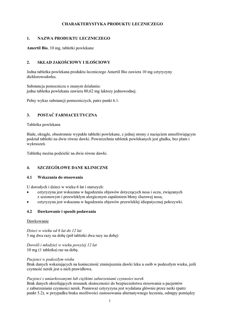 CHARAKTERYSTYKA PRODUKTU LECZNICZEGO 1. NAZWA PRODUKTU LECZNICZEGO Amertil Bio, 10 mg, tabletki powlekane 2. SKŁAD JAKOŚCIOWY I ILOŚCIOWY Jedna tabletka powlekana produktu leczniczego Amertil Bio zawiera 10 mg cetyryzyny dichlorowodorku. Substancja pomocnicza o znanym działaniu: jedna tabletka powlekana zawiera 80,62 mg laktozy jednowodnej. Pełny wykaz substancji pomocniczych, patrz punkt 6.1. 3. POSTAĆ FARMACEUTYCZNA Tabletka powlekana Białe, okrągłe, obustronnie wypukłe tabletki powlekane, z jednej strony z nacięciem umożliwiającym podział tabletki na dwie równe dawki. Powierzchnia tabletek powlekanych jest gładka, bez plam i wykruszeń. Tabletkę można podzielić na dwie równe dawki. 4. SZCZEGÓŁOWE DANE KLINICZNE 4.1 Wskazania do stosowania U dorosłych i dzieci w wieku 6 lat i starszych: cetyryzyna jest wskazana w łagodzeniu objawów dotyczących nosa i oczu, związanych z sezonowym i przewlekłym alergicznym zapaleniem błony śluzowej nosa, cetyryzyna jest wskazana w łagodzeniu objawów przewlekłej idiopatycznej pokrzywki. 4.2 Dawkowanie i sposób podawania Dawkowanie Dzieci w wieku od 6 lat do 12 lat 5 mg dwa razy na dobę (pół tabletki dwa razy na dobę) Dorośli i młodzież w wieku powyżej 12 lat 10 mg (1 tabletka) raz na dobę. Pacjenci w podeszłym wieku Brak danych wskazujących na konieczność zmniejszenia dawki leku u osób w podeszłym wieku, jeśli czynność nerek jest u nich prawidłowa. Pacjenci z umiarkowanymi lub ciężkimi zaburzeniami czynności nerek Brak danych określających stosunek skuteczności do bezpieczeństwa stosowania u pacjentów z zaburzeniami czynności nerek. Ponieważ cetyryzyna jest wydalana głównie przez nerki (patrz punkt 5.2), w przypadku braku możliwości zastosowania alternatywnego leczenia, odstępy pomiędzy 1 poszczególnymi dawkami muszą być ustalone indywidualnie w zależności od czynności nerek. Dawkowanie należy zmodyfikować zgodnie z poniższą tabelą. Aby skorzystać z tabeli dawkowania, należy obliczyć klirens kreatyniny (Clkr) w ml/min. Clkr (ml/min) można obliczyć na podstawie stężenia kreatyniny w surowicy krwi (mg/dl), posługując się następującym wzorem: Clkr = [140 – wiek (lata)] x masa ciała (kg) 72 x stężenie kreatyniny w surowicy (mg/dl) (x 0,85 dla kobiet) Modyfikacja dawkowania u dorosłych pacjentów z zaburzeniami czynności nerek: Stopień wydolności nerek Klirens kreatyniny (ml/min) Prawidłowa czynność nerek ≥ 80 10 mg raz na dobę 50-79 10 mg raz na dobę 30-49 5 mg na dobę < 30 5 mg co drugi dzień < 10 Stosowanie przeciwwskazane Łagodne zaburzenia czynności nerek Umiarkowane zaburzenia czynności nerek Ciężkie zaburzenia czynności nerek Schyłkowa choroba nerek, pacjenci dializowani Dawka i częstość podawania U dzieci z zaburzeniami czynności nerek dawkę należy ustalić indywidualnie na podstawie klirensu kreatyniny, wieku oraz masy ciała pacjenta. Pacjenci z zaburzeniami czynności wątroby Nie ma konieczności dostosowania dawki u pacjentów z zaburzeniami czynności wątroby. Pacjenci z zaburzeniami czynności nerek oraz z zaburzeniami czynności wątroby Zaleca się dostosowanie dawkowania (patrz powyżej: „Pacjenci z umiarkowanymi lub ciężkimi zaburzeniami czynności nerek”). Sposób podawania Tabletki należy połykać, popijając szklanką płynu. 4.3 Przeciwwskazania Nadwrażliwość na substancję czynną, którąkolwiek substancję pomocniczą, hydroksyzynę lub pochodne piperazyny. Ciężkie zaburzenia czynności nerek z klirensem kreatyniny mniejszym niż 10 ml/min. 4.4 Specjalne ostrzeżenia i środki ostrożności dotyczące stosowania Nie stwierdzono istotnych klinicznie interakcji między alkoholem (w stężeniu 0,5 g/l we krwi) a cetyryzyną stosowaną w dawkach terapeutycznych. Jednakże zaleca się zachowanie ostrożności podczas przyjmowania cetyryzyny jednocześnie z alkoholem. Należy zachować ostrożność u pacjentów z czynnikami ryzyka zatrzymania moczu (np. uszkodzony rdzeń kręgowy, rozrost gruczołu krokowego), ponieważ cetyryzyna może zwiększać ryzyko zatrzymania moczu. Zaleca się ostrożność podczas stosowania u pacjentów z padaczką oraz u pacjentów z ryzykiem wystąpienia drgawek. Leki przeciwhistaminowe hamują reakcję alergiczną w skórnych testach alergicznych. Zaleca się odstawienie leków przeciwhistaminowych na 3 dni przed planowanym wykonaniem takich testów. 2 Dzieci Nie zaleca się stosowania cetyryzyny w postaci tabletek powlekanych u dzieci w wieku poniżej 6 lat, ponieważ ta postać farmaceutyczna nie pozwala na odpowiednie dostosowanie dawki leku. Zaleca się stosowanie cetyryzyny w postaci farmaceutycznej przeznaczonej dla dzieci (np. krople doustne lub roztwór doustny). Substancje pomocnicze Produkt leczniczy Amertil Bio zawiera laktozę jednowodną. Pacjenci z rzadko występującą dziedziczną nietolerancją galaktozy, niedoborem laktazy (typu Lapp) lub zespołem złego wchłaniania glukozy-galaktozy nie powinni przyjmować tego produktu leczniczego. 4.5 Interakcje z innymi produktami leczniczymi i inne rodzaje interakcji Ze względu na właściwości farmakokinetyczne, farmakodynamiczne oraz profil tolerancji cetyryzyny nie są spodziewane interakcje tego produktu leczniczego z innymi lekami. W przeprowadzonych badaniach nie zgłaszano występowania interakcji farmakodynamicznych ani znaczących interakcji farmakokinetycznych, w szczególności z pseudoefedryną lub teofiliną (400 mg na dobę). Pokarm nie zmniejsza stopnia wchłaniania cetyryzyny, natomiast zmniejsza szybkość wchłaniania cetyryzyny. 4.6 Wpływ na płodność, ciążę i laktację Ciąża Dane kliniczne dotyczące stosowania cetyryzyny w ciąży są ograniczone. Badania przeprowadzone na zwierzętach nie wykazują bezpośredniego ani pośredniego szkodliwego wpływu na przebieg ciąży, rozwój zarodka i (lub) płodu, przebieg porodu czy rozwój pourodzeniowy (patrz punkt 5.3). Należy zachować ostro