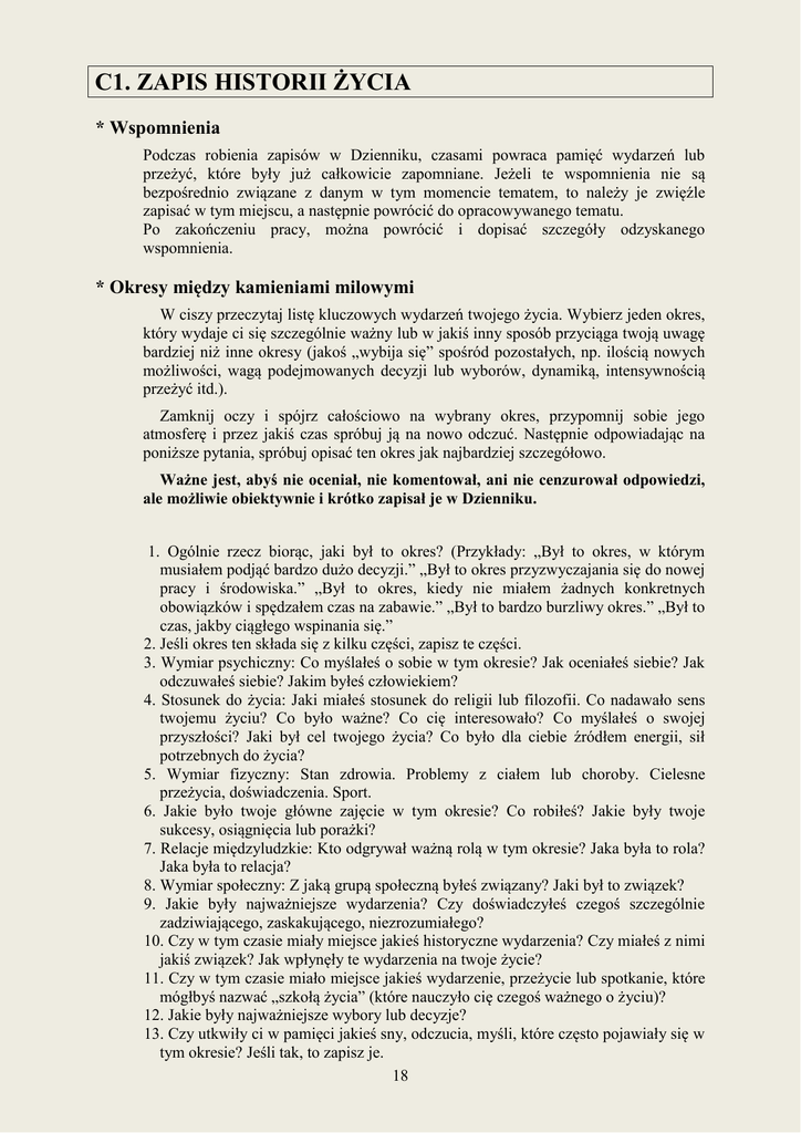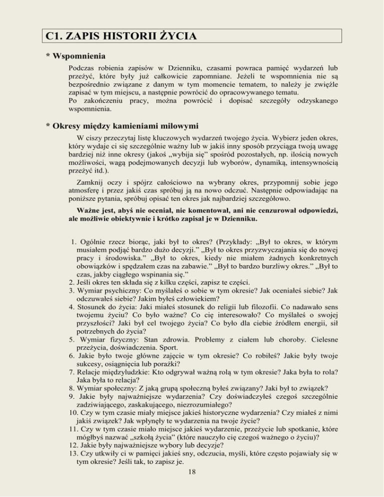 C1. ZAPIS HISTORII ŻYCIA * Wspomnienia Podczas robienia zapisów w Dzienniku, czasami powraca pamięć wydarzeń lub przeżyć, które były już całkowicie zapomniane. Jeżeli te wspomnienia nie są bezpośrednio związane z danym w tym momencie tematem, to należy je zwięźle zapisać w tym miejscu, a następnie powrócić do opracowywanego tematu. Po zakończeniu pracy, można powrócić i dopisać szczegóły odzyskanego wspomnienia. * Okresy między kamieniami milowymi W ciszy przeczytaj listę kluczowych wydarzeń twojego życia. Wybierz jeden okres, który wydaje ci się szczególnie ważny lub w jakiś inny sposób przyciąga twoją uwagę bardziej niż inne okresy (jakoś „wybija się” spośród pozostałych, np. ilością nowych możliwości, wagą podejmowanych decyzji lub wyborów, dynamiką, intensywnością przeżyć itd.). Zamknij oczy i spójrz całościowo na wybrany okres, przypomnij sobie jego atmosferę i przez jakiś czas spróbuj ją na nowo odczuć. Następnie odpowiadając na poniższe pytania, spróbuj opisać ten okres jak najbardziej szczegółowo. Ważne jest, abyś nie oceniał, nie komentował, ani nie cenzurował odpowiedzi, ale możliwie obiektywnie i krótko zapisał je w Dzienniku. 1. Ogólnie rzecz biorąc, jaki był to okres? (Przykłady: „Był to okres, w którym musiałem podjąć bardzo dużo decyzji.” „Był to okres przyzwyczajania się do nowej pracy i środowiska.” „Był to okres, kiedy nie miałem żadnych konkretnych obowiązków i spędzałem czas na zabawie.” „Był to bardzo burzliwy okres.” „Był to czas, jakby ciągłego wspinania się.” 2. Jeśli okres ten składa się z kilku części, zapisz te części. 3. Wymiar psychiczny: Co myślałeś o sobie w tym okresie? Jak oceniałeś siebie? Jak odczuwałeś siebie? Jakim byłeś człowiekiem? 4. Stosunek do życia: Jaki miałeś stosunek do religii lub filozofii. Co nadawało sens twojemu życiu? Co było ważne? Co cię interesowało? Co myślałeś o swojej przyszłości? Jaki był cel twojego życia? Co było dla ciebie źródłem energii, sił potrzebnych do życia? 5. Wymiar fizyczny: Stan zdrowia. Problemy z ciałem lub choroby. Cielesne przeżycia, doświadczenia. Sport. 6. Jakie było twoje główne zajęcie w tym okresie? Co robiłeś? Jakie były twoje sukcesy, osiągnięcia lub porażki? 7. Relacje międzyludzkie: Kto odgrywał ważną rolą w tym okresie? Jaka była to rola? Jaka była to relacja? 8. Wymiar społeczny: Z jaką grupą społeczną byłeś związany? Jaki był to związek? 9. Jakie były najważniejsze wydarzenia? Czy doświadczyłeś czegoś szczególnie zadziwiającego, zaskakującego, niezrozumiałego? 10. Czy w tym czasie miały miejsce jakieś historyczne wydarzenia? Czy miałeś z nimi jakiś związek? Jak wpłynęły te wydarzenia na twoje życie? 11. Czy w tym czasie miało miejsce jakieś wydarzenie, przeżycie lub spotkanie, które mógłbyś nazwać „szkołą życia” (które nauczyło cię czegoś ważnego o życiu)? 12. Jakie były najważniejsze wybory lub decyzje? 13. Czy utkwiły ci w pamięci jakieś sny, odczucia, myśli, które często pojawiały się w tym okresie? Jeśli tak, to zapisz je. 18
