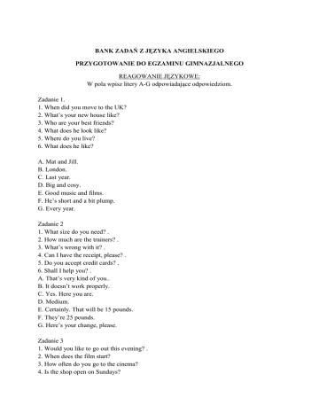 BANK ZADAŃ Z JĘZYKA ANGIELSKIEGO PRZYGOTOWANIE DO EGZAMINU GIMNAZJALNEGO REAGOWANIE JĘZYKOWE: W pola wpisz litery A-G odpowiadające odpowiedziom. Zadanie 1. 1. When did you move to the UK? 2. What’s your new house like? 3. Who are your best friends? 4. What does he look like? 5. Where do you live? 6. What does he like? A. Mat and Jill. B. London. C. Last year. D. Big and cosy. E. Good music and films. F. He’s short and a bit plump. G. Every year. Zadanie 2 1. What size do you need? . 2. How much are the trainers? . 3. What’s wrong with it? . 4. Can I have the receipt, please? . 5. Do you accept credit cards? . 6. Shall I help you? . A. That’s very kind of you.. B. It doesn’t work properly. C. Yes. Here you are. D. Medium. E. Certainly. That will be 15 pounds. F. They’re 25 pounds. G. Here’s your change, please. Zadanie 3 1. Would you like to go out this evening? . 2. When does the film start? 3. How often do you go to the cinema? 4. Is the shop open on Sundays? 5. How much are the tickets for children? 6. Do you like classical music? A. Oh, I see. B. Yes, with pleasure. C. No, I don’t. D. At 8.30 p.m. E. Two pounds. F. No, it isn’t. G. Twice a year. Zadanie 4 1. Did you enjoy the race? 2. Is cricket popular in New Zealand? 3. Can you ride a bike? 4. When did you start learning English? 5. Where were you born? 6. How old were you when you moved to London? \ A. Five years ago. B. At 5 p.m. C. Yes, I did. D. In Bournemouth. E. Yes, it is. F. Yes, I’m pretty good at it. G. Twenty. Zadanie 5 1. Who’s calling please? 2. Can I have a ticket to Manchester, please? 3. Would you like to dance? 4. Could you pass me the salt, please? 5. Can I speak to John, please? 6. Have you got a dishwasher at home? A. Yes, quite a lot. B. Single or return? C. Yes, of course. Here you are. D. It’s Tom. E. No, I haven’t. F. Speaking. G. I’d love to! Zadanie 6 W pola wpisz litery A-K odpowiadające wyrażeniom podanym poniżej. Minisłownik/ Minidictionary: Atchoo! - Apsik! try sth on - przymierzyć coś newly-weds - nowożeńcy 1. "Atchoo!" "…………………….." 2. "Can I have another biscuit?" "………………………….." 3. "Happy holidays." "……………………….." 4. "Thank you very much." "………………………." 5. "Hello. This is Joe. Can I speak to Ted, please?" "………………" 6. "Excuse me, could I try this dress on?" "……………………..The changing rooms are over there." 7. "Do you have any idea what's happened?" "………………" 8. "I'm really sorry, but I can't come to your party." "…………………" 9. "Shall I help you carry these bags?" "…………………" 10. "Here's your coffee. ……………………….." "Thank you." A. Help yourself. B. By all means. C. What a pity. D. Here you are. E. Not a clue. F. Bless you. G. No kidding! H. You're welcome. I. That's very kind of you. J. Speaking. K. Same to you. Zadanie 7 1. "Let's drink for the newly-weds." "……………" 2. "Mary, can you come here?" ………………….”I'll just finish breakfast." 3. "Thank you very much for your help." "…………………….." 4. "I've failed my exams." ………………….”It's not the end of the world." 5. "Excuse me, could I have the menu, please?" …………………”I'll bring it in no time. 6. "I've passed my driving test." "……………………….." 7. "Bye." "…………………" 8. "Can I speak to Susan, please?" "……………….I'll get her." 9. "Bye. I'm going to a party." "……………." 10. "I'm sorry, I forgot your book." "…………………Bring it tomorrow." A. Not at all. B. Cheer up. C. Take care. D. Congratulations! E. That's all right. F. Cheers. G. Certainly. H. Hold on. I. Just a minute. J. Enjoy yourself. K. How rude. CZYTANIE ZE ZROZUMIENIEM: Zadanie 8 Przyporzadkuj nagłówki do tekstów. Nagłówek nie pasujący do żadnego fragmentu należy połączyć z "NIE PASUJE" a. I don’t like the subject. b. I really need a new one. c. I don’t want to leave d. I really want to be a better person. e. I know how tto look after it. f. I’d like to know why he hates me. 1. ….I am moving to Australia with my family. I'm worried because I know I'll miss my best friend Sophie. I know there is e-mail and we can even talk for free online with Skype but it's not the same. I'd like to stay in Bath. 2. ….I've had the same winter coat for four years. It's old and I think it is too small for me. I told my mum about one I like, but she says it's too expensive. What can I do to change her mind? I think I look like a tramp. 3. ….I'm hopeless at Maths and my parents want me to have extra lessons after school. But the real reason I am bad at it is that I hate it so much I don't listen in class. I don't think extra lessons will help me. 4. ….I know I've treated my friends badly in the past, but now I'm trying to change. I smile, say polite things, but they don't seem to notice. I don't think people want to give me a chance. 5. ….I'd love to have a small puppy, but my parents say no. They think I won't care for or exercise it properly. How can I show I am responsible? I have a special book about dogs that gives advice on how to care for them. 6. …. NIE PASUJE. ŚRODKI JĘZYKOWE: Zadanie 9 Przetłumacz podane fragmenty zdań na język angielski. polsku w taki sposób, by pasowały stylistycznie i gramatycznie do zdań. Następnie kliknij "ZAKOŃCZ I SPRAWDŹ". 1. (Tom zawsze wstaje o) ……………………………..6:30 in the morning. 2. Hurry! The train (odjeżdża) ……………………………… 3. Look! (Będzie) ………………………….….rain. 4. Susan (jeszcze nie odrobiła zadania domowego) ……………………………………. 5. John is saving up (aby kupić) …………………………………a new laptop. 6. My brother (uwielbia pływać) ……………………………………. 7. (Nie widziałem mojego przyjaciela) ………………….…