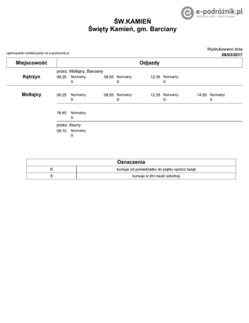 ŚW.KAMIEŃ Święty Kamień, gm. Barciany Wydrukowano dnia 08/03/2017 ogólnopolski rozkład jazdy na e-podroznik.pl Miejscowość Odjazdy przez: Mołtajny, Barciany Kętrzyn 06:25 Mołtajny 06:25 16:40 Normalny S 08:55 Normalny 12:35 Normalny D D Normalny S 08:55 Normalny 12:35 Normalny 14:50 Normalny D D S Normalny S przez: Asuny 08:10 Normalny S Oznaczenia D kursuje od poniedziałku do piątku oprócz świąt S kursuje w dni nauki szkolnej