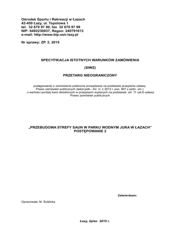 Ośrodek Sportu i Rekreacji w Łazach 42-450 Łazy, ul. Topolowa 1 tel. 32 670 97 90, fax 32 670 97 99 NIP: 6492230937, Regon: 240791613 e-mail: http://www.bip.osir.lazy.pl Nr sprawy: ZP. 2. 2015 SPECYFIKACJA ISTOTNYCH WARUNKÓW ZAMÓWIENIA (SIWZ) PRZETARG NIEOGRANICZONY postępowanie o zamówienie publiczne prowadzone na podstawie przepisów ustawy Prawo zamówień publicznych (tekst jedn.: Dz. U. z 2013 r. poz. 907 z późn. zm.) o wartości poniżej kwot określonych w przepisach wydanych na podstawie art. 11 ust.8 ustawy Prawo zamówień publicznych „PRZEBUDOWA STREFY SAUN W PARKU WODNYM JURA W ŁAZACH” POSTĘPOWANIE 2 Zatwierdzam: Opracowała: M. Ściślicka Łazy, lipiec 2015 r. I. NAZWA ORAZ ADRES ZAMAWIAJĄCEGO 1. Adres Zamawiającego: Ośrodek Sportu i Rekreacji w Łazach 42-450 Łazy, ul. Topolowa 1 tel. 32 670 97 90, fax 32 670 97 99 NIP: 6492230937, Regon: 240791613 2. Adres strony internetowej, na której dostępna jest specyfikacja istotnych warunków zamówienia: www.bip.osir.lazy.pl II. TRYB UDZIELENIA ZAMÓWIENIA Postępowanie o udzielenie zamówienia publicznego jest prowadzone w trybie przetargu nieograniczonego, zgodnie z przepisami ustawy z dnia 29 stycznia 2004 r. – Prawo zamówień publicznych (Dz. U. z 2013 r. poz. 907 z późn. zm.) oraz zgodnie z zapisami niniejszej Specyfikacji Istotnych Warunków Zamówienia (SIWZ). III. OPIS PRZEDMIOTU ZAMÓWIENIA I. Nazwa zamówienia: „PRZEBUDOWA STREFY SAUN W PARKU WODNYM JURA W ŁAZACH” POSTĘPOWANIE 2 II. Opis przedmiotu zamówienia. 1. Zakres prac obejmuje: a) modernizacja strefy saun, b) roboty rozbiórkowe (demontaż okna, okładzin ściennych, sufitów podwieszanych, zerwanie posadzek) c) roboty murowe (wykonanie posadzek na powierzchni ok. 40 m2) d) roboty malarskie, instalacyjne, e) roboty tynkowe (na powierzchni ok. 63 m2), f) dostawa i montaż systemowej sauny suchej wraz z drzwiami. 2. Zamawiający informuje, że termin rozpoczęcia robót (przekazanie terenu robót) planowany jest na początek września 2015r. – termin ten może ulec zmianie w zależności od terminu zawarcia umowy. 3. Zaleca się dokonać oględzin miejsca budowy na etapie sporządzania ofert celem sprawdzenia warunków panujących na obiekcie. Z uwagi na ryczałtowy charakter zamówienia w ofercie należy uwzględnić wszystkie dodatkowe opłaty związane z wykonywanymi robotami, a wynikającymi z zakresu robót . 4. Wykonawca jest zobowiązany udzielić rękojmi za wady i usterki oraz gwarancji na przedmiot zamówienia - roboty budowlane: 5 lat od daty odbioru końcowego.; W zakresie sprzętu i urządzeń – zgodnie z gwarancją udzieloną przez producenta 5. Szczegółowy opis przedmiotu zamówienia zawiera dokumentacja projektowa: 1) PROJEKT PRZEBUDOWY STREFY SAUN W PARKU WODNYM JURA W ŁAZACH wykonany przez Pracownia Architektoniczna „ PROJ-ART” Marzanna Andrzejewska Rosiak Adres: ul. Barbary 3/9-10, 40 – 053 Katowice 2 ) S zcze gó ło we S pe c yf ika cje Techn ic zn e dla zadania MODERNIZACJA WNĘTRZ STREFY SAUN W PLACÓWCE OSIR-U W ŁAZACH 3 ) P r ze dm ia ry rob ó t (p om o cn ic zo ). 6. Wykonawca wykona przedmiot zamówienia z materiałów własnych. Materiały te muszą odpowiadać wymogom wyrobów dopuszczonych do obrotu i stosowania w budownictwie określonym w art. 10 ustawy z dn. 07 lipca 1994 r. Prawo budowlane (tekst jednolity Dz.U. z 2010 r. Nr243, poz. 1623 z późn. zm.). Wszelkie stosowane materiały powinny być nowe, odpowiadać Polskim Normom lub Aprobatom Technicznym oraz posiadać dokumenty takie jak: atest, świadectwo, certyfikat zgodności. Użyte w Specyfikacji Technicznej Wykonania i Odbioru Robót znaki towarowe, patenty lub pochodzenie należy rozumieć jako wzorzec jakościowy. 7. Jeżeli dokumentacja projektowa lub specyfikacja techniczna wykonania i odbioru robót budowlanych, wskazywałyby w odniesieniu do niektórych materiałów lub urządzeń znaki towarowe, patenty lub pochodzenie lub wskazanie norm, aprobat, specyfikacji technicznych i systemów odniesień, o których mowa w art. 30 ust. 1-3 ustawy Pzp – Zamawiający dopuszcza oferowanie materiałów, urządzeń lub rozwiązań równoważnych. Materiały lub urządzenia pochodzące od konkretnych producentów określają minimalne parametry jakościowe i cechy użytkowe, jakim muszą odpowiadać materiały lub urządzenia oferowane przez wykonawcę, aby spełnione zostały wymagania stawiane przez Zamawiającego. Materiały lub urządzenia pochodzące od konkretnych producentów stanowią wyłącznie wzorzec jakościowy przedmiotu zamówienia. Pod pojęciem „minimalne parametry jakościowe cechy użytkowe” zamawiający rozumie wymagania dotyczące materiałów lub urządzeń zawarte w ogólnie dostępnych źródłach, katalogach, stronach internetowych producentów. Operowanie przykładowymi nazwami producenta ma jedynie na celu doprecyzowanie poziomu oczekiwań zamawiającego, w stosunku do określonego rozwiązania. Posługiwanie się nazwami producentów/produktów ma wyłącznie charakter przykładowy. Zamawiający, wskazując oznaczenie konkretnego producenta ( dostawcy ) lub konkretny produkt przy opisie przedmiotu zamówienia, dopuszcza jednocześnie produkty równoważne o parametrach jakościowych i cechach użytkowych co najmniej na poziomie parametrów wskazanego produktu, uznając tym samym każdy produkt o wskazanych lub lepszych parametrach. 8. W przypadku zaoferowania materiałów równoważnych, Wykonawca jest zobowiązany do załączenia do oferty wykazu wyspecyfikowanych wszystkich tych materiałów wraz z podaniem nazwy producenta, dokładnego i jednoznacznego typu materiału oraz załączenia stosowanych dokumentów takich jak: atest PZH, deklaracja zgodności producenta/aprobata techniczna, karta katalogowa producenta zawierających wszystkie parametry techniczno-eksploatacyjne. 9. Zestawienie zamiennych, równoważnych materiałów i urządzeń oceniane będzie pod względem zgodności (równoważności)