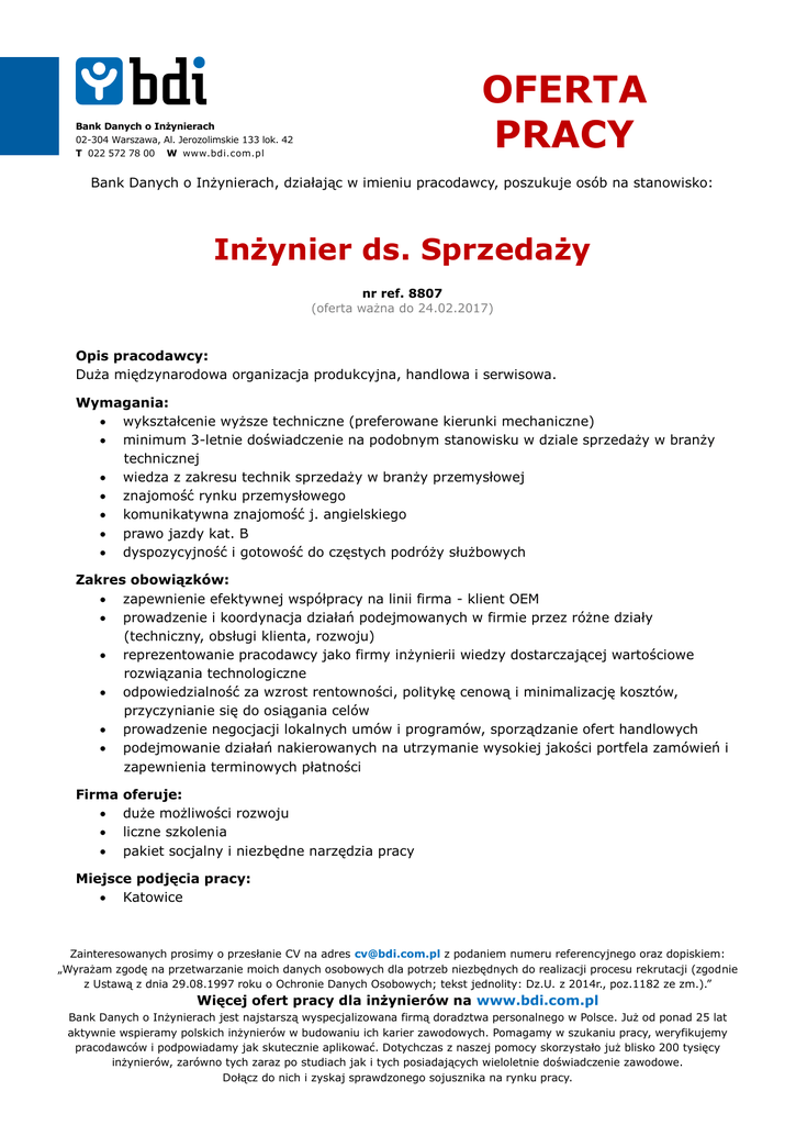 OFERTA PRACY Bank Danych o Inżynierach 02-304 Warszawa, Al. Jerozolimskie 133 lok. 42 T 022 572 78 00 W www.bdi.com.pl Bank Danych o Inżynierach, działając w imieniu pracodawcy, poszukuje osób na stanowisko: Inżynier ds. Sprzedaży nr ref. 8807 (oferta ważna do 24.02.2017) Opis pracodawcy: Duża międzynarodowa organizacja produkcyjna, handlowa i serwisowa. Wymagania: wykształcenie wyższe techniczne (preferowane kierunki mechaniczne) minimum 3-letnie doświadczenie na podobnym stanowisku w dziale sprzedaży w branży technicznej wiedza z zakresu technik sprzedaży w branży przemysłowej znajomość rynku przemysłowego komunikatywna znajomość j. angielskiego prawo jazdy kat. B dyspozycyjność i gotowość do częstych podróży służbowych Zakres obowiązków: zapewnienie efektywnej współpracy na linii firma - klient OEM prowadzenie i koordynacja działań podejmowanych w firmie przez różne działy (techniczny, obsługi klienta, rozwoju) reprezentowanie pracodawcy jako firmy inżynierii wiedzy dostarczającej wartościowe rozwiązania technologiczne odpowiedzialność za wzrost rentowności, politykę cenową i minimalizację kosztów, przyczynianie się do osiągania celów prowadzenie negocjacji lokalnych umów i programów, sporządzanie ofert handlowych podejmowanie działań nakierowanych na utrzymanie wysokiej jakości portfela zamówień i zapewnienia terminowych płatności Firma oferuje: duże możliwości rozwoju liczne szkolenia pakiet socjalny i niezbędne narzędzia pracy Miejsce podjęcia pracy: Katowice Zainteresowanych prosimy o przesłanie CV na adres [email protected] z podaniem numeru referencyjnego oraz dopiskiem: „Wyrażam zgodę na przetwarzanie moich danych osobowych dla potrzeb niezbędnych do realizacji procesu rekrutacji (zgodnie z Ustawą z dnia 29.08.1997 roku o Ochronie Danych Osobowych; tekst jednolity: Dz.U. z 2014r., poz.1182 ze zm.).” Więcej ofert pracy dla inżynierów na www.bdi.com.pl Bank Danych o Inżynierach jest najstarszą wyspecjalizowana firmą doradztwa personalnego w Polsce. Już od ponad 25 lat aktywnie wspieramy polskich inżynierów w budowaniu ich karier zawodowych. Pomagamy w szukaniu pracy, weryfikujemy pracodawców i podpowiadamy jak skutecznie aplikować. Dotychczas z naszej pomocy skorzystało już blisko 200 tysięcy inżynierów, zarówno tych zaraz po studiach jak i tych posiadających wieloletnie doświadczenie zawodowe. Dołącz do nich i zyskaj sprawdzonego sojusznika na rynku pracy.