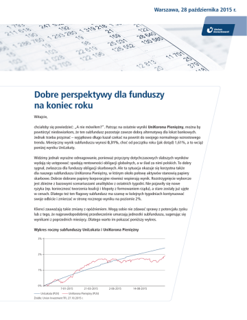 Warszawa, 28 października 2015 r. Dobre perspektywy dla funduszy na koniec roku Witajcie, chciałoby się powiedzieć: „A nie mówiłem?”. Patrząc na ostatnie wyniki UniKorona Pieniężny, można by powtórzyć niedowiarkom, że ten subfundusz pozostaje zawsze dobrą alternatywą dla lokat bankowych. Jednak trzeba przyznać – wyjątkowo długo kazał czekać na powrót do swojego normalnego wzrostowego trendu. Miesięczny wynik subfunduszu wynosi 0,31%, choć od początku roku (jak dotąd) 1,61%, a to wciąż poniżej wyniku UniLokaty. Widzimy jednak wyraźne odreagowanie, ponieważ przyczyny dotychczasowych słabszych wyników wydają się ustępować: spadają rentowności obligacji globalnych, a w ślad za nimi polskich. To dobry sygnał, zwłaszcza dla funduszy obligacji skarbowych. Ale ta sytuacja okazuje się korzystna także dla naszego subfunduszu UniKorona Pieniężny, w którym około połowę aktywów stanowią papiery skarbowe. Dobrze dobrane papiery korporacyjne również wspierają wynik. Rozstrzygnięcie wyborcze jest zbieżne z bazowymi scenariuszami analityków z ostatnich tygodni. Nie pojawiły się nowe ryzyka (np. koniecznosć tworzenia koalicji i kłopoty z formowaniem rządu), a stare zostały już ujęte w cenach. Dlatego też ten flagowy subfundusz ma szansę w kolejnych tygodniach kontynuować swoje odbicie i zmierzać w stronę rocznego wyniku na poziomie 2%. Klienci zauważają takie zmiany z opóźnieniem. Mogą sobie nie zdawać sprawy z potencjału zysku lub z tego, że najprawdopodobniej przedwcześnie umarzają jednostki subfunduszu, sugerując się wynikami z poprzednich miesięcy. Dlatego warto im pokazać poniższy wykres. Wykres roczny subfunduszy UniLokata i UniKorona Pieniężny 3% 2% 1% 0% UniLokata (PLN) 7-01-2015 21-03-2015 UniKorona Pieniężny (PLN) Źródło: Union Investment TFI, 27.10.2015 r. 2-06-2015 14-08-2015 Warszawa, 28 października 2015 r. Jednak zmienność nie zniknęła, więc dla wielu klientów nadal lepszym rozwiązaniem będą UniLokata i UniWIBID Plus. Dobry klimat dla obligacji skarbowych pojawił w związku ze spekulacjami, że Europejski Bank Centralny zwiększy skalę dodruku pieniędzy. Do tej pory powodowało to wzrost cen obligacji nie tylko w strefie euro, ale też w Polsce i innych krajach regionu. Przynajmniej do II kwartału przyszłego roku odsunięty został czynnik destabilizujący rynek, czyli potencjalne wprowadzenie przez amerykański bank centralny podwyżki stóp procentowych. Obecny konsensus zakłada, że stanie się to w przyszłym roku, więc rynki mają chwilę spokoju. Okazało się też, że Rada Polityki Pieniężnej jednak dyskutuje nad obniżeniem stóp procentowych. To kolejny czynnik, który sprzyja obligacjom skarbowym. Na fali tych zdarzeń UniKorona Obligacje zarobił w ostatnim miesiącu ponad 0,6% i krótkoterminowo widać w nim pewien potencjał zysku. Natomiast subfundusz UniObligacje: Nowa Europa po silnej fali spadkowej, trwającej od końca stycznia, zaczął błyskawicznie poprawiać wynik. Powód? Poprawa sentymentu dla tureckich i polskich obligacji. Rentowności tureckich obligacji od miesiąca mocno spadają (rosną ich ceny), choć wciąż pozostają na wysokim poziomie – ponad 9,5% dla papierów dziesięcioletnich. To znaczy, że gdyby nie było żadnych zmian w kursach walut, to tyle właśnie możemy na nich zarobić w ciągu roku bez dalszych obniżek rentowności. 8% 7% 6% 5% 4% 3% 2% 1% 0% -1% -2% -3% -4% -5% 7-01-2015 UniObligacje: Nowa Europa (PLN) Źródło: Union Investment TFI, 27.10.2015 r. 21-03-2015 2-06-2015 14-08-2015 Warszawa, 28 października 2015 r. Tymczasem umacnia się też turecka waluta (wzmocnienie liry do złotówki o ponad 8% za ostatni miesiąc). To ważne dla naszych funduszy, ponieważ kupują one aktywa w lirze tureckiej. Stąd miesięczny wynik dla UniObligacje: Nowa Europa na poziomie 4,33% za ostatni miesiąc, a 5,64% od dołka w połowie września. Ceny aktywów w Turcji spadały w ostatnich miesiącach drastycznie i było tylko kwestią czasu, kiedy zmieni się ich kierunek. Po okresie niepewności dotyczącej sytuacji politycznej jesteśmy w przededniu wyborów (1 listopada). Analitycy niemal jednogłośnie przewidują powołanie rządu formowanego przez dwie największe partie. Inne ryzyka (jak wojna w Syrii czy konflikt z Kurdami) są rozpoznane i najwyraźniej ujęte już w cenach. Dlatego warto postawić także na fundusze akcyjne, które inwestują w aktywa tureckie. Trudno oczekiwać, że przed nami stałe wzrosty, ale nie jest jeszcze za późno na inwestycje w Turcji. Przed nami perspektywa zapewne kilku dobrych miesięcy. W ofercie mamy aż trzy subfundusze, które mocno angażują się na tym rynku. Od najbardziej agresywnego UniAkcje: Turcja (dla przypomnienia: najlepszy fundusz akcyjny ubiegłego roku w Polsce), poprzez balansujący głównie pomiędzy akcjami polskimi i tureckimi subfundusz UniAkcje: Nowa Europa (nasz typ inwestycyjny), do wybierającego spółki o mniejszej zmienności i długoterminowym potencjale – UniAkcje Dywidendowy. Wymienione subfundusze od dołka w połowie września zarobiły odpowiednio: 19,4% (sic!), 7,1% oraz 4,6%. 25% 20% 15% 10% 5% 0% -5% -10% -15% -20% -25% -30% 7-01-2015 UniAkcje: Nowa Europa (PLN) 21-03-2015 UniAkcje Turcja (PLN) 2-06-2015 14-08-2015 UniAkcje Dywidendowy (PLN) Źródło: Union Investment TFI, 27.10.2015 r. Fundusze akcyjne wspiera poprawa globalnego sentymentu po otrząśnięciu się z szoku, jakim okazał się dla rynków „czarny poniedziałek” w sierpniu tego roku w Chinach. Turcja to jednak podwyższone ryzyko i w efekcie relatywnie wysoka zmienność. Bardziej przewidywalne są rynki rozwinięte, a zwłaszcza giełdy ze strefy euro, gdzie większość aktywów lokuje UniStrategie Dynamiczny (nasz globalny subfundusz zarządzany przez Union AM we Frankfurcie) i zachowujący się trochę spokojniej UniObligacje Zamienne. Warszawa, 28 października 2015 r. Podsumo