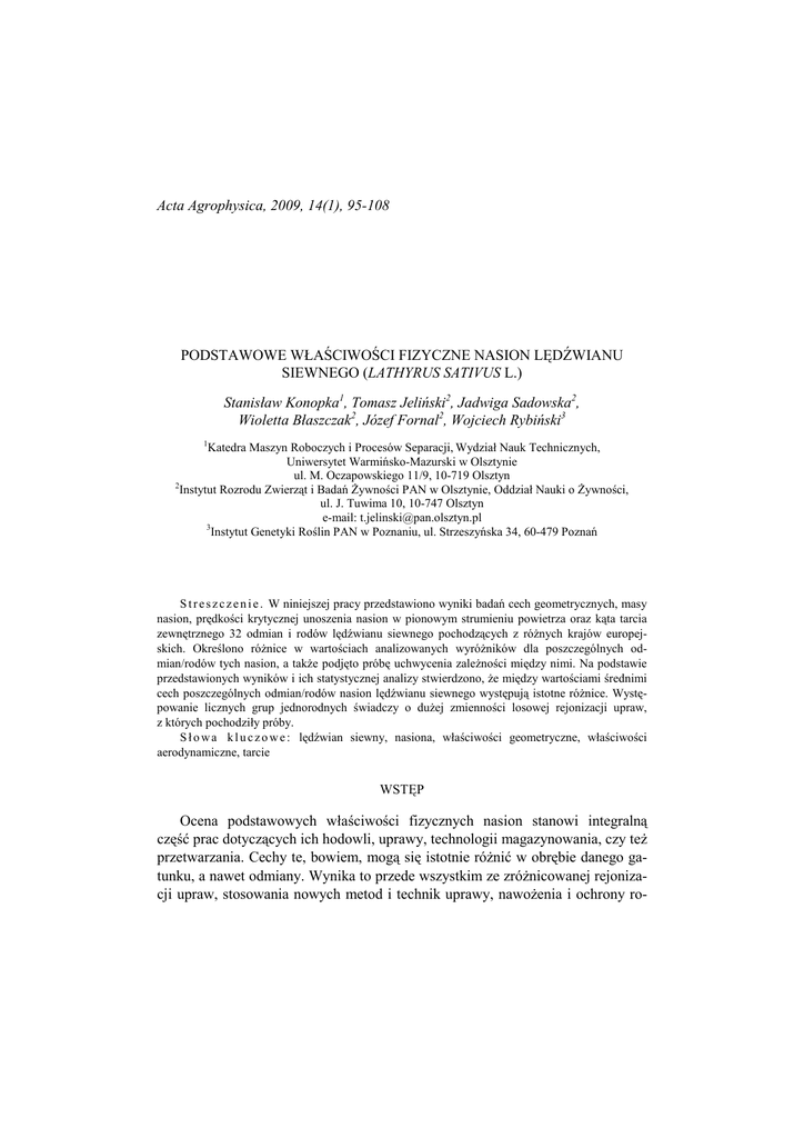 Acta Agrophysica, 2009, 14(1), 95-108 PODSTAWOWE WŁAŚCIWOŚCI FIZYCZNE NASION LĘDŹWIANU SIEWNEGO (LATHYRUS SATIVUS L.) Stanisław Konopka1, Tomasz Jeliński2, Jadwiga Sadowska2, Wioletta Błaszczak2, Józef Fornal2, Wojciech Rybiński3 1 Katedra Maszyn Roboczych i Procesów Separacji, Wydział Nauk Technicznych, Uniwersytet Warmińsko-Mazurski w Olsztynie ul. M. Oczapowskiego 11/9, 10-719 Olsztyn 2 Instytut Rozrodu Zwierząt i Badań śywności PAN w Olsztynie, Oddział Nauki o śywności, ul. J. Tuwima 10, 10-747 Olsztyn e-mail: [email protected] 3 Instytut Genetyki Roślin PAN w Poznaniu, ul. Strzeszyńska 34, 60-479 Poznań S t r e s z c z e n i e . W niniejszej pracy przedstawiono wyniki badań cech geometrycznych, masy nasion, prędkości krytycznej unoszenia nasion w pionowym strumieniu powietrza oraz kąta tarcia zewnętrznego 32 odmian i rodów lędźwianu siewnego pochodzących z róŜnych krajów europejskich. Określono róŜnice w wartościach analizowanych wyróŜników dla poszczególnych odmian/rodów tych nasion, a takŜe podjęto próbę uchwycenia zaleŜności między nimi. Na podstawie przedstawionych wyników i ich statystycznej analizy stwierdzono, Ŝe między wartościami średnimi cech poszczególnych odmian/rodów nasion lędźwianu siewnego występują istotne róŜnice. Występowanie licznych grup jednorodnych świadczy o duŜej zmienności losowej rejonizacji upraw, z których pochodziły próby. S ł o w a k l u c z o w e : lędźwian siewny, nasiona, właściwości geometryczne, właściwości aerodynamiczne, tarcie WSTĘP Ocena podstawowych właściwości fizycznych nasion stanowi integralną część prac dotyczących ich hodowli, uprawy, technologii magazynowania, czy teŜ przetwarzania. Cechy te, bowiem, mogą się istotnie róŜnić w obrębie danego gatunku, a nawet odmiany. Wynika to przede wszystkim ze zróŜnicowanej rejonizacji upraw, stosowania nowych metod i technik uprawy, nawoŜenia i ochrony ro- 96 S. KONOPKA i in. ślin. Dlatego teŜ informacje o zmienności zasadniczych cech fizycznych nasion stanowią cenne informacje dla hodowców na temat ich „dorodności” oraz dla mechanizatorów rolnictwa na temat technologii siewu, zbioru, obróbki pozbiorowej (czyszczenia, sortowania, rozdrabniania), transportu oraz konstrukcji i budowy obiektów magazynowych. Nasiona lędźwianu siewnego (Lathyrus sativus L.) charakteryzują się z jednej strony wysoką zawartością i wartością biologiczną białek, z drugiej zaś obecnością substancji antyŜywieniowych uznanych za neurotoksyny (β ODAP). ChociaŜ główne obszary uprawy znajdują się w krajach azjatyckich (Indie, Chiny, Pakistan), coraz większe zainteresowanie budzi on równieŜ w krajach europejskich (Francja, Hiszpania, Niemcy, Włochy i Polska). Genetyczne prace zmierzają w kierunku wyhodowania rodów, bądź odmian, charakteryzujących się obniŜoną zawartością neurotoksyn. Taka modyfikacja moŜe powodować zmiany właściwości fizykochemicznych nasion, a co za tym idzie – konieczność zmian parametrów procesów technologicznych, w których surowcem jest lędźwian. W niniejszej pracy przedstawiono charakterystykę podstawowych cech fizycznych róŜnych odmian (rodów) lędźwianu siewnego (Lathyrus sativus L.). Dla nasion określano: • cechy geometryczne, tj. ich długość, szerokość i grubość - istotne w procesach separacji w urządzeniach zwierających sita lub w tryjerach; • masę, charakteryzującą przede wszystkim dorodność nasion i dominującą cechę w tzw. hydroseparacji; • prędkość krytyczną unoszenia w pionowym strumieniu powietrza, cechę istotną w procesach pneumatycznego rozdzielania (wstępnego czyszczenia lub czyszczenia w czyszczalniach złoŜonych) i transportu. Prędkość ta jest określana jako prędkość strumienia powietrza przepływającego przez pionowy kanał, w którym nasiona znajdują się w stanie równowagi względnej, tzn. „zawiśnie”; • kąty (współczynniki) tarcia zewnętrznego dla najczęściej stosowanych materiałów konstrukcyjnych (stali, drewna, gum oraz PCV). Cecha ta określa wielkość tarcia między cząsteczką a materiałem konstrukcyjnym. Jest wykorzystywana głównie w procesach rozdzielania i transportu jako właściwość tarciowa. Z uzyskanych wyników pomiarów wyliczono wartość średnią oraz odchylenie standardowe, stanowiące zasadniczą miarę rozrzutu wyników. Celem pracy było określenie róŜnic pomiędzy wartościami średnimi danej cechy oraz korelacji analizowanych cech dla danej odmiany/rodu nasion lędźwianu siewnego. PODSTAWOWE WŁAŚCIWOŚCI FIZYCZNE NASION LĘDŹWIANU 97 MATERIAŁ I METODY BADAŃ Materiał badawczy stanowiły nasiona lędźwianu siewnego (Lathyrus sativus L.). W skład badanej próby wchodziło 30 rodów pochodzących z krajów europejskich (oznaczonych: FR – Francji; HI – Hiszpanii; NI – Niemiec oraz WL –Włoch) oraz dwie polskie odmiany Krab i Derek. Liczebność nasion objętych pomiarami była zróŜnicowana dla poszczególnych zbiorów nasion i zawierała się w przedziale od 11 do 71. Przedmiotem badań było określenie dla poszczególnych nasion lędźwianu siewnego: • podstawowych cech geometrycznych, tj. ich długości, szerokości i grubości, • masy, • prędkości krytycznej unoszenia w pionowym strumieniu powietrza, • kątów (współczynników) tarcia zewnętrznego po: stali, drewnie, gumie oraz PCV. Doświadczenia związane z określeniem cech geometrycznych nasion przeprowadzono przy uŜyciu warsztatowego mikroskopu typu MWM 2325, umoŜliwiającego wyznaczanie wymiarów obiektu w trzech wzajemnie prostopadłych płaszczyznach z dokładnością do 0,01 mm. Pomiary wykonywano zgodnie z metodyką opisaną w pracy (Konopka 1999). Wymiar najmniejszy określał grubość nasion, średni – szerokość, zaś największy – ich długość. Masę poszczególnych nasion oznaczano na wadze typu WA-32 firmy ZMP w Gdańsku z dokładnoś