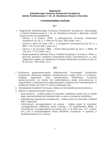 Regulamin Zakładowego Funduszu Świadczeń Socjalnych Szkoły Podstawowej nr 1 im. dr. Stanisława Krzysia w Barcinie I POSTANOWIENIA OGÓLNE §1 1. Regulamin Zakładowego Funduszu Świadczeń Socjalnych obowiązuje w Szkole Podstawowej nr 1 im. dr. Stanisława Krzysia w Barcinie i został opracowany na podstawie: Ustawy z 4 marca 1994r. o zakładowym funduszu świadczeń socjalnych (tj. Dz. U. z 1996r Nr 70, poz. 335 z późn. zm.), Ustawa z dnia 23 maja 1991 r. o związkach zawodowych.(tj. Dz. U. z 2001 r. Nr 79 poz. 854. z póź. zm.) Ustawy z 26 stycznia 1982r. – Karta Nauczyciela (tj. Dz.U. z 2003r. Nr 118, poz. 1112 z późn. zm.), Rozporządzenia Ministra Pracy i Polityki Socjalnej z 14 marca 1994r. w sprawie sposobu ustalania przeciętnej liczby zatrudnionych w celu naliczania odpisu na zakładowy fundusz świadczeń socjalnych (Dz. U. Nr 43, poz. 168 z późn. zm.). §2 1. Podstawę gospodarowania Zakładowym Funduszem Świadczeń Socjalnych stanowią przepisy wymienionych wyżej ustaw o Funduszu, niniejszy regulamin oraz zatwierdzony Preliminarz Funduszu opracowywany na każdy rok kalendarzowy przez pracodawcę w uzgodnieniu z zakładowymi organizacjami związkowymi i zatwierdzany w ustalonym trybie do dnia 31 marca każdego roku. 2. Zarządzanie środkami Funduszu należy do kompetencji pracodawcy. 3. Ilekroć w regulaminie jest mowa o: pracodawcy – należy przez to rozumieć dyrektora szkoły lub w czasie jego usprawiedliwionej nieobecności w pracy zastępcę dyrektora, zakładowej organizacji związkowej – należy przez to rozumieć Oddział ZNP w Barcinie, minimalnym wynagrodzeniu za pracę – należy przez to rozumieć wynagrodzenie określane przez ustawę z 10 października 2002r. o minimalnym wynagrodzeniu za pracę (Dz. U. Nr 200, poz. 167 z późn. zm.) lub w rozporządzeniu Rady Ministrów wydanym w oparciu o postanowienia w/w ustawy. 1 §3 Regulamin określa: 1. Osoby uprawnione do korzystania ze świadczeń i pomocy z ZFŚS. 2. Cele na które przeznacza się środki ZFŚS. 3. Zasady i warunki przyznawania świadczeń z ZFŚS. §4 1. Regulamin ZFŚS, jego wszelkie zmiany oraz coroczny preliminarz wymagają uzgodnienia z zakładowymi organizacjami związkowymi działającymi w szkole. 2. Preliminarz Funduszu na rok kalendarzowy jest zmiennym Załącznikiem nr 1 do niniejszego regulaminu. 3. Prawo zgłaszania propozycji zmian w regulaminie oraz w rocznym preliminarzu wydatków z Funduszu mają pracodawca i zakładowe organizacje związków zawodowych. 4. Decyzje dotyczące sposobu podziału środków Funduszu w ramach zatwierdzonego preliminarza rocznego podejmuje dyrektor szkoły po uzgodnieniu z przedstawicielem związków zawodowych. 5. W szkole powołuje się Komisję Socjalną, która ma charakter opiniotwórczy. Tworzą ją przedstawiciele pracodawcy oraz przedstawiciel związków zawodowych, działających przy Szkole Podstawowej nr 1 im. dr. Stanisława Krzysia w Barcinie 6. Decyzje dotyczące przyznawania lub odmowy indywidualnych świadczeń socjalnych poszczególnym osobom podejmuje dyrektor szkoły po zasięgnięciu opinii Komisji Socjalnej. §5 ZFŚS tworzy się: 1. Dla nauczycieli – z odpisu ustalonego na podstawie art. 53 Karty Nauczyciela. 2. Dla pracowników niepedagogicznych z odpisu ustalonego na podstawie Ustawy o zakładowym funduszu świadczeń socjalnych. 3. Dla emerytów i rencistów z odpisu na podstawie Ustawy o zakładowym funduszu świadczeń socjalnych. §6 1. Środki Funduszu są gromadzone na odrębnym rachunku bankowym. 2. Środki niewykorzystane w danym roku kalendarzowym przechodzą na rok następny. 2 §7 1. Środki Funduszu na pomoc socjalną są przyznawane w formie pieniężnej lub rzeczowej (np. paczki świąteczne). W przypadku świadczeń rzeczowych osoby uprawnione nie mogą żądać zapłaty ich równowartości. 2. Świadczenia mają charakter uznaniowy i przyznawane są na wniosek uprawnionego. W razie odmownego załatwienia wniosku należy osobie uprawnionej podać przyczyny odmowy na piśmie w ciągu 14 dni od dnia rozpatrzenia wniosku. §8 1. Wnioski w sprawie przyznania pomocy socjalnej należy składać w sekretariacie szkoły, na obowiązujących u pracodawcy drukach, stanowiących Załącznik nr 2 do Regulaminu wraz z wymaganymi dokumentami potwierdzającymi zawarte w nim dane: 1.1 zeznanie podatkowe pracownika, współmałżonka lub uprawnionego do korzystania z Funduszu członka rodziny (jeśli wcześniej ich nie przedłożono upoważnionemu pracownikowi sekretariatu); 1.2 zaświadczenia o kontynuacji nauki przez dziecko powyżej 18 roku życia; 1.3 aktualną decyzję Urzędu Pracy o wysokości pobieranego zasiłku dla bezrobotnych lub o przyznaniu statusu bezrobotnego bez prawa do zasiłku. 2. Druki, o których mowa w §8 ust. 1, dostępne są w sekretariacie szkoły, u dyrektora oraz na stronie internetowej szkoły. 3. Regulamin jest dostępny dla pracowników oraz innych osób uprawnionych do korzystania ze świadczeń socjalnych ze środków Funduszu w bibliotece szkolnej i na stronie internetowej szkoły II OSOBY UPRAWNIONE DO KORZYSTANIA Z FUNDUSZU §9 1. Z działalności socjalnej finansowanej ze środków Funduszu mogą korzystać: 1.1 pracownicy zatrudnieni na podstawie umowy o pracę i mianowania niezależnie od wymiaru czas pracy, 1.2 pracownicy przebywający na urlopach macierzyńskich, wychowawczych, dla poratowania zdrowia, w stanie nieczynnym, na nauczycielskich świadczeniach kompensacyjnych 3 2. 3. 4. 5. 6. 7. 1.3 emeryci i renciści byli pracownicy szkoły, dla których szkoła była ostatnim miejscem pracy poprzedzającym pobranie świadczenia emerytalnego lub rentowego, 1.4 członkowie rodzin wymienionych w pkt. 1.1 – 1.3, 1.5 członkowie rodzin po byłych pracownikach, jeżeli byli na ich utrzymaniu, a zgon nastąpił w czasie trwania zatrudnienia Członkami rodzin uprawnionymi do korzystania ze świadczeń Funduszu, o których mowa w § 9 ust. 1 pkt 1.4 są: 2.1 współmałżonkowi