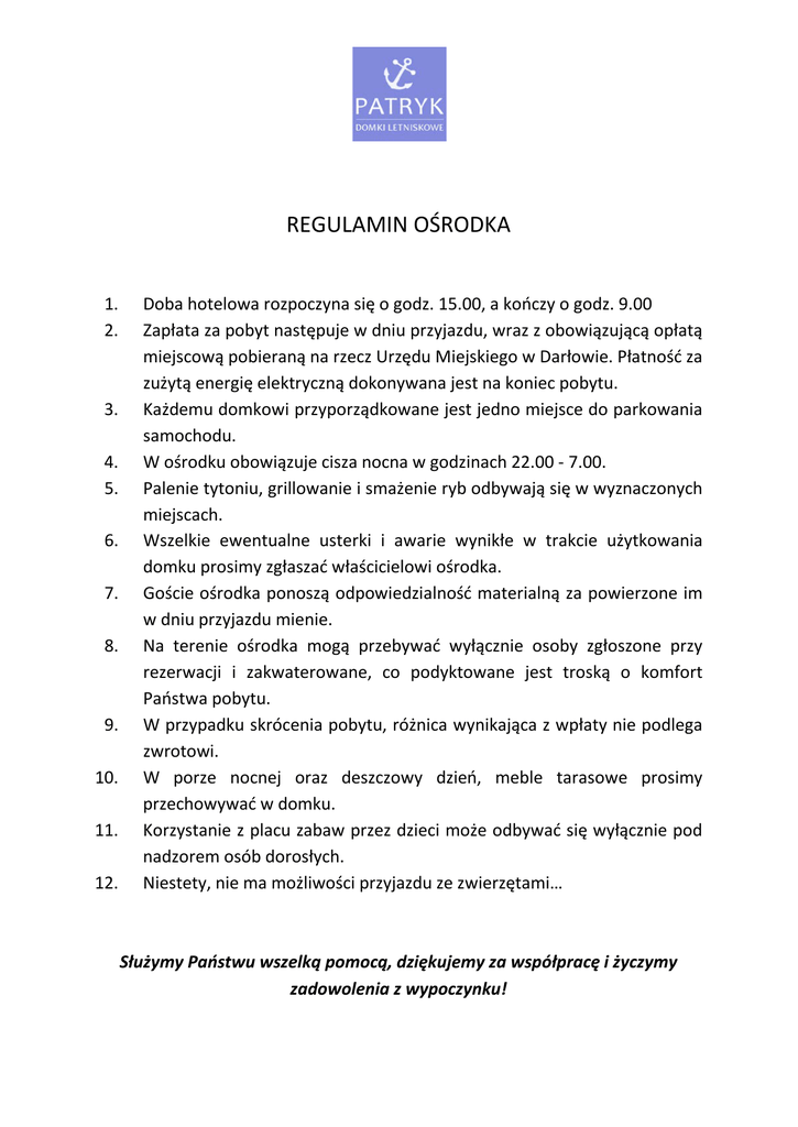 REGULAMIN OŚRODKA 1. 2. 3. 4. 5. 6. 7. 8. 9. 10. 11. 12. Doba hotelowa rozpoczyna się o godz. 15.00, a kończy o godz. 9.00 Zapłata za pobyt następuje w dniu przyjazdu, wraz z obowiązującą opłatą miejscową pobieraną na rzecz Urzędu Miejskiego w Darłowie. Płatność za zużytą energię elektryczną dokonywana jest na koniec pobytu. Każdemu domkowi przyporządkowane jest jedno miejsce do parkowania samochodu. W ośrodku obowiązuje cisza nocna w godzinach 22.00 - 7.00. Palenie tytoniu, grillowanie i smażenie ryb odbywają się w wyznaczonych miejscach. Wszelkie ewentualne usterki i awarie wynikłe w trakcie użytkowania domku prosimy zgłaszać właścicielowi ośrodka. Goście ośrodka ponoszą odpowiedzialność materialną za powierzone im w dniu przyjazdu mienie. Na terenie ośrodka mogą przebywać wyłącznie osoby zgłoszone przy rezerwacji i zakwaterowane, co podyktowane jest troską o komfort Państwa pobytu. W przypadku skrócenia pobytu, różnica wynikająca z wpłaty nie podlega zwrotowi. W porze nocnej oraz deszczowy dzień, meble tarasowe prosimy przechowywać w domku. Korzystanie z placu zabaw przez dzieci może odbywać się wyłącznie pod nadzorem osób dorosłych. Niestety, nie ma możliwości przyjazdu ze zwierzętami… Służymy Państwu wszelką pomocą, dziękujemy za współpracę i życzymy zadowolenia z wypoczynku!