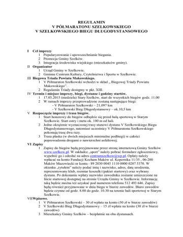 REGULAMIN V PÓŁMARATONU SZELKOWSKIEGO V SZELKOWSKIEGO BIEGU DŁUGODYSTANSOWEGO I Cel imprezy 1 Popularyzowanie i upowszechnianie biegania. 2 Promocja Gminy Szelków. 3 Integracja środowiska wiejskiego (mieszkańców gminy). II Organizator 1 Urząd Gminy w Szelkowie. 2 Gminne Centrum Kultury, Czytelnictwa i Sportu w Szelkowie. III Biegowa Triada Powiatu Makowskiego. 1 V Półmaraton Szelkowski wchodzi w skład „ Biegowej Triady Powiatu Makowskiego”. 2 Regulamin Triady dostępny w pkt. XIII. IV Termin i miejsce imprezy, biegi, dystanse i godziny startów. 1 17.05.2015 (niedziela) Stary Szelków, start do wszystkich biegów godz. 11.00 2 W ramach imprezy przeprowadzone zostaną następujące biegi: - V Półmaraton Szelkowski – 21,097 km - V Szelkowski Bieg Długodystansowy – ok.10,5 km V Rozpoczęcie imprezy i trasa biegów. 1 Start honorowy do biegów odbędzie się przed halą sportową w Starym Szelkowie. Start ostry i meta ok. 100 m od hali. 2 Jedno okrążenie wyznaczonej trasy stanowi dystans V Szelkowskiego Biegu Długodystansowego, natomiast uczestnicy V Półmaratonu Szelkowskiego pokonują trasę dwa razy. 3 Trasa płaska (w dwóch miejscach minimalne podbiegi) w całości poprowadzona drogami o nawierzchni asfaltowej. VI Zapisy 1 Zapisy do biegów będą przyjmowane przez stronę internetową Gminy Szelków www.szelkow.pl. W zakładce „sport” należy pobrać formularz zgłoszeniowy, wypełnić go i odesłać na adres [email protected]. Opłaty należy wpłacać na konto Fundacji Kocham Maków ul. Kopernika 11/35 , 06-200 Maków Mazowiecki nr konta - 89 2030 0045 1110 0000 0207 5370. W okienku „tytułem” należy podać imię i nazwisko, adres, datę urodzenia, reprezentowany klub, rozmiar koszulki (pakiet startowy) oraz wybrany dystans. Po dokonaniu wpłaty nazwisko zawodnika zostanie umieszczone na liście startowej dostępnej na stronie Urzędu Gminy w Szelkowie. Informację taką będzie można też uzyskać pod numerem telefonu 512 493 646. Zapisy będą również przyjmowane w dniu biegu w biurze zawodów. Biuro zawodów będzie czynne od godz. 8.00 do godz. 10.30 na terenie hali sportowej w Starym Szelkowie. VII Wpisowe. 1 V Półmaraton Szelkowski – 30 zł wpłata na konto (50 zł w biurze zawodów) 2 V Szelkowski Bieg Długodystansowy – 15 zł wpłata na konto (30 zł w biurze zawodów) 3 Mieszkańcy Gminy Szelków – bezpłatnie na obu dystansach. VIII Warunki uczestnictwa. 1 Wniesienie opłaty startowej w wysokości podanej powyżej. 2 W półmaratonie mogą wziąć udział osoby, które do dnia 17.05.2015 r. ukończyły 18 lat. 3 W biegu na dystansie 10,5 km mogą wziąć udział osoby, które do dnia 17.05.2015 r. ukończyły 15 lat. W przypadku osób niepełnoletnich wymagana będzie pisemna zgoda rodziców lub opiekunów. 4 Każdy uczestnik przed rozpoczęciem biegu okaże dowód osobisty lub legitymację szkolną w celu weryfikacji oraz podpisze oświadczenie o braku przeciwwskazań zdrowotnych do uczestnictwa w biegu. IX Kategorie 1 IV Półmaraton Szelkowski: - K/M 20 – 18-29 lat - K/M 30 - 30-39 lat - K/M 40 – 40-49 lat - K/M 50 – 50-59 lat - K/M 60 – 60-69 lat - K/M 70 – 70 – powyżej 2 IV Szelkowski Bieg Długodystansowy: - K/M 10 - 15-19 lat - K/M 20 – 20-29 lat - K/M 30 - 30-39 lat - K/M 40 – 40-49 lat - K/M 50 – 50-59 lat - K/M 60 – 60- 69 lat - K/M 70 – 70 - powyżej X Nagrody w V Półmaratonie Szelkowskim i V Szelkowskim Biegu Długodystansowym. 1 Za pierwsze trzy miejsca w klasyfikacji generalnej (od 1 do 3) – nagrody 2 W kategoriach wiekowych za zwycięstwo w każdej kategorii – puchary. 3 Wszyscy uczestnicy imprezy otrzymają pamiątkowe drewniane statuetki. XI Organizator przewiduje dodatkowe wyróżnienia dla: 1 Najstarszego zawodnika. 2 Mistrza Gminy Szelków w półmaratonie. XII Postanowienia końcowe. 1 Organizator dopuszcza start zawodników nordic walking, ale bez dodatkowej kategorii tzn. zostaną oni uwzględnieni w klasyfikacji open oraz w kategoriach wiekowych razem z biegaczami. 2 Wszystkim zawodnikom, którzy dokonają wpłaty na konto organizator zapewnia pełny pakiet startowy, w skład którego wejdzie koszulka treningowa (techniczna), gadżety reklamowe, napój oraz baton. Zawodnikom, którzy dokonają wpłaty w biurze zawodów organizator nie zapewnia pełnego pakietu startowego. 3 Organizator przewiduje poczęstunek dla uczestników biegu oraz osób towarzyszących. 4 Szatnie i toalety zlokalizowane będą na terenie hali sportowej w Starym Szelkowie. 5 Organizator nie zapewnia noclegów. Uczestnicy, którzy zechcą skorzystać z odpłatnego noclegu w pensjonacie lub bezpłatnego pola namiotowego proszeni są o kontakt z organizatorami. 6 Bieg będzie prowadzony przy ograniczonym ruchu kołowym. Uczestnicy proszeni są o zachowanie ostrożności i przestrzeganie zasad ruchu drogowego. 7 Organizator nie ubezpiecza uczestników biegu. 8 Trasa nie posiada atestu PZLA. Pomiar czasu będzie wykonywany ręcznie. 9 Bieg odbędzie się niezależnie od warunków atmosferycznych. 10 Osoby deklarujące swój udział w jednym z biegów będą sklasyfikowane jedynie na zadeklarowanym dystansie. 11 Sprawy sporne nie ujęte w regulaminie rozstrzyga organizator biegu. 12 Wszelkie informacje dotyczące imprezy pod nr tel. 512 493 646 lub [email protected]. XIII Biegowa Triada Powiatu Makowskiego 1 Biegowa Triada Powiatu Makowskiego to cykl trzech imprez biegowych rozgrywanych na terenie Powiatu Makowskiego 2. Biegi rozgrywane są na różnych dystansach według następującej kolejności - V Półmaraton Szelkowski - 21,097 km – 17.05.2015 – Szelków - Makowska Piętnastka – 15 km – 14.06.2015 – Maków Mazowiecki - Bieg Siedmiu Róż – 10 km – 11.10.2015 – Czerwonka 2 Każdy bieg traktowany jest jako odrębne zawody i posiada odrębną klasyfikację 3 Dla zawodników, którzy ukończą wszystkie trzy biegi przewidziana jest klasyfikacja – Biegowa Triada Powiatu Makowskiego 5. O kol