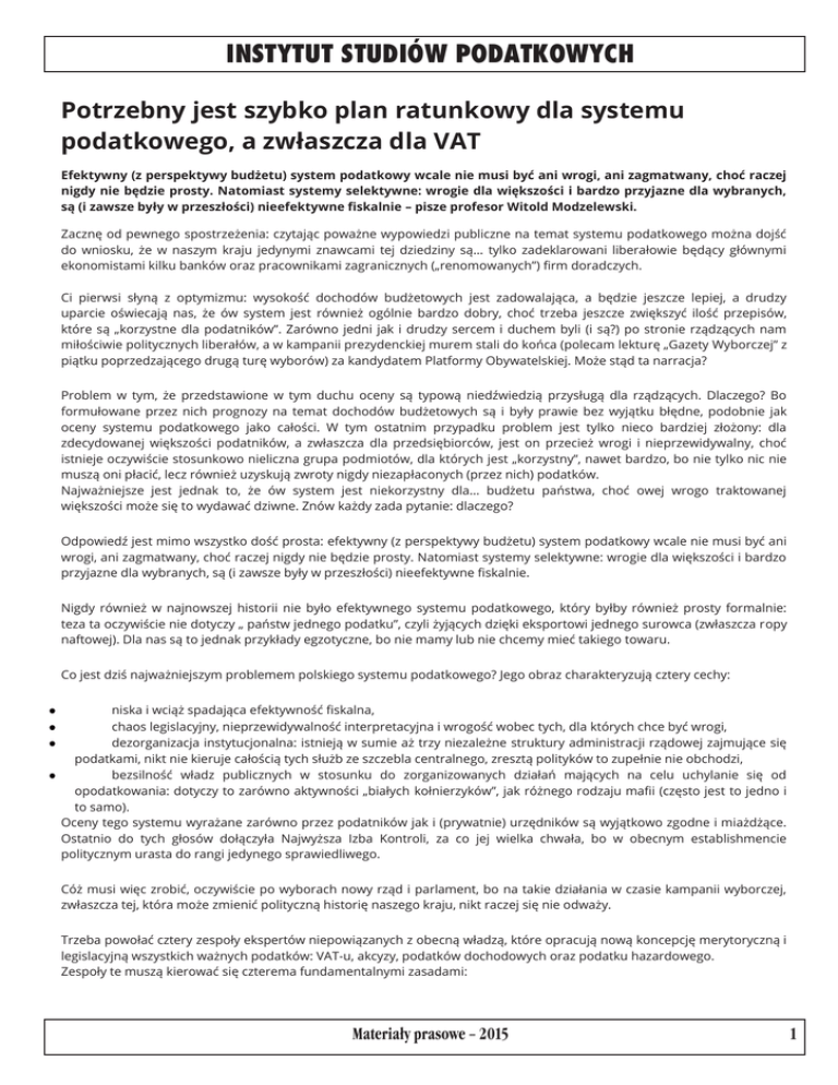 INSTYTUT STUDIÓW PODATKOWYCH Potrzebny jest szybko plan ratunkowy dla systemu podatkowego, a zwłaszcza dla VAT Efektywny (z perspektywy budżetu) system podatkowy wcale nie musi być ani wrogi, ani zagmatwany, choć raczej nigdy nie będzie prosty. Natomiast systemy selektywne: wrogie dla większości i bardzo przyjazne dla wybranych, są (i zawsze były w przeszłości) nieefektywne fiskalnie – pisze profesor Witold Modzelewski. Zacznę od pewnego spostrzeżenia: czytając poważne wypowiedzi publiczne na temat systemu podatkowego można dojść do wniosku, że w naszym kraju jedynymi znawcami tej dziedziny są… tylko zadeklarowani liberałowie będący głównymi ekonomistami kilku banków oraz pracownikami zagranicznych („renomowanych”) firm doradczych. Ci pierwsi słyną z optymizmu: wysokość dochodów budżetowych jest zadowalająca, a będzie jeszcze lepiej, a drudzy uparcie oświecają nas, że ów system jest również ogólnie bardzo dobry, choć trzeba jeszcze zwiększyć ilość przepisów, które są „korzystne dla podatników”. Zarówno jedni jak i drudzy sercem i duchem byli (i są?) po stronie rządzących nam miłościwie politycznych liberałów, a w kampanii prezydenckiej murem stali do końca (polecam lekturę „Gazety Wyborczej” z piątku poprzedzającego drugą turę wyborów) za kandydatem Platformy Obywatelskiej. Może stąd ta narracja? Problem w tym, że przedstawione w tym duchu oceny są typową niedźwiedzią przysługą dla rządzących. Dlaczego? Bo formułowane przez nich prognozy na temat dochodów budżetowych są i były prawie bez wyjątku błędne, podobnie jak oceny systemu podatkowego jako całości. W tym ostatnim przypadku problem jest tylko nieco bardziej złożony: dla zdecydowanej większości podatników, a zwłaszcza dla przedsiębiorców, jest on przecież wrogi i nieprzewidywalny, choć istnieje oczywiście stosunkowo nieliczna grupa podmiotów, dla których jest „korzystny”, nawet bardzo, bo nie tylko nic nie muszą oni płacić, lecz również uzyskują zwroty nigdy niezapłaconych (przez nich) podatków. Najważniejsze jest jednak to, że ów system jest niekorzystny dla… budżetu państwa, choć owej wrogo traktowanej większości może się to wydawać dziwne. Znów każdy zada pytanie: dlaczego? Odpowiedź jest mimo wszystko dość prosta: efektywny (z perspektywy budżetu) system podatkowy wcale nie musi być ani wrogi, ani zagmatwany, choć raczej nigdy nie będzie prosty. Natomiast systemy selektywne: wrogie dla większości i bardzo przyjazne dla wybranych, są (i zawsze były w przeszłości) nieefektywne fiskalnie. Nigdy również w najnowszej historii nie było efektywnego systemu podatkowego, który byłby również prosty formalnie: teza ta oczywiście nie dotyczy „ państw jednego podatku”, czyli żyjących dzięki eksportowi jednego surowca (zwłaszcza ropy naftowej). Dla nas są to jednak przykłady egzotyczne, bo nie mamy lub nie chcemy mieć takiego towaru. Co jest dziś najważniejszym problemem polskiego systemu podatkowego? Jego obraz charakteryzują cztery cechy: niska i wciąż spadająca efektywność fiskalna, chaos legislacyjny, nieprzewidywalność interpretacyjna i wrogość wobec tych, dla których chce być wrogi, dezorganizacja instytucjonalna: istnieją w sumie aż trzy niezależne struktury administracji rządowej zajmujące się podatkami, nikt nie kieruje całością tych służb ze szczebla centralnego, zresztą polityków to zupełnie nie obchodzi, bezsilność władz publicznych w stosunku do zorganizowanych działań mających na celu uchylanie się od opodatkowania: dotyczy to zarówno aktywności „białych kołnierzyków”, jak różnego rodzaju mafii (często jest to jedno i to samo). Oceny tego systemu wyrażane zarówno przez podatników jak i (prywatnie) urzędników są wyjątkowo zgodne i miażdżące. Ostatnio do tych głosów dołączyła Najwyższa Izba Kontroli, za co jej wielka chwała, bo w obecnym establishmencie politycznym urasta do rangi jedynego sprawiedliwego. Cóż musi więc zrobić, oczywiście po wyborach nowy rząd i parlament, bo na takie działania w czasie kampanii wyborczej, zwłaszcza tej, która może zmienić polityczną historię naszego kraju, nikt raczej się nie odważy. Trzeba powołać cztery zespoły ekspertów niepowiązanych z obecną władzą, które opracują nową koncepcję merytoryczną i legislacyjną wszystkich ważnych podatków: VAT-u, akcyzy, podatków dochodowych oraz podatku hazardowego. Zespoły te muszą kierować się czterema fundamentalnymi zasadami: Materia³y prasowe – 2015 1 INSTYTUT STUDIÓW PODATKOWYCH ich członkowie muszą być wolni od wszelkich związków z biznesem zajmującym się „optymalizacją podatkową” a zwłaszcza o charakterze międzynarodowym, z systemu podatkowego muszą być usunięte wszystkie „trofea lobbystyczne”, powstałe zwłaszcza w ciągu ostatnich pięciu lat, oraz należy nie dopuścić do narzucenia tym zespołom koncepcji szkodliwych dla interesu publicznego, nowe rozwiązania prawne oraz organizacyjne mają być podporządkowane zasadzie maksymalizacji efektywności fiskalnej przy minimalizacji represyjności wprowadzanych rozwiązań, nowe ustawy mają chronić podatników działających w dobrej wierze jednocześnie nie dając pardonu dla wszelkich oszustów i wyłudzaczy („optymalizatorów”). Oczywiście w pierwszej kolejności generalnej naprawy wymagają podatek od towarów i usług oraz akcyza, bo, po pierwsze, są to dwa najważniejsze źródła dochodów budżetu państwa przeżywające od lat głęboki kryzys efektywności fiskalnej, po drugie, tylko z tych dwóch źródeł można w relatywnie krótkim okresie zwiększyć dochody budżetowe niezbędne dla sfinansowania spadku dochodów z podatku dochodowego od osób fizycznych w wyniku podwyższenia minimum wolnego od podatku. Jest nawet projekt nowej ustawy o podatku od towarów i usług, który od 2010 r