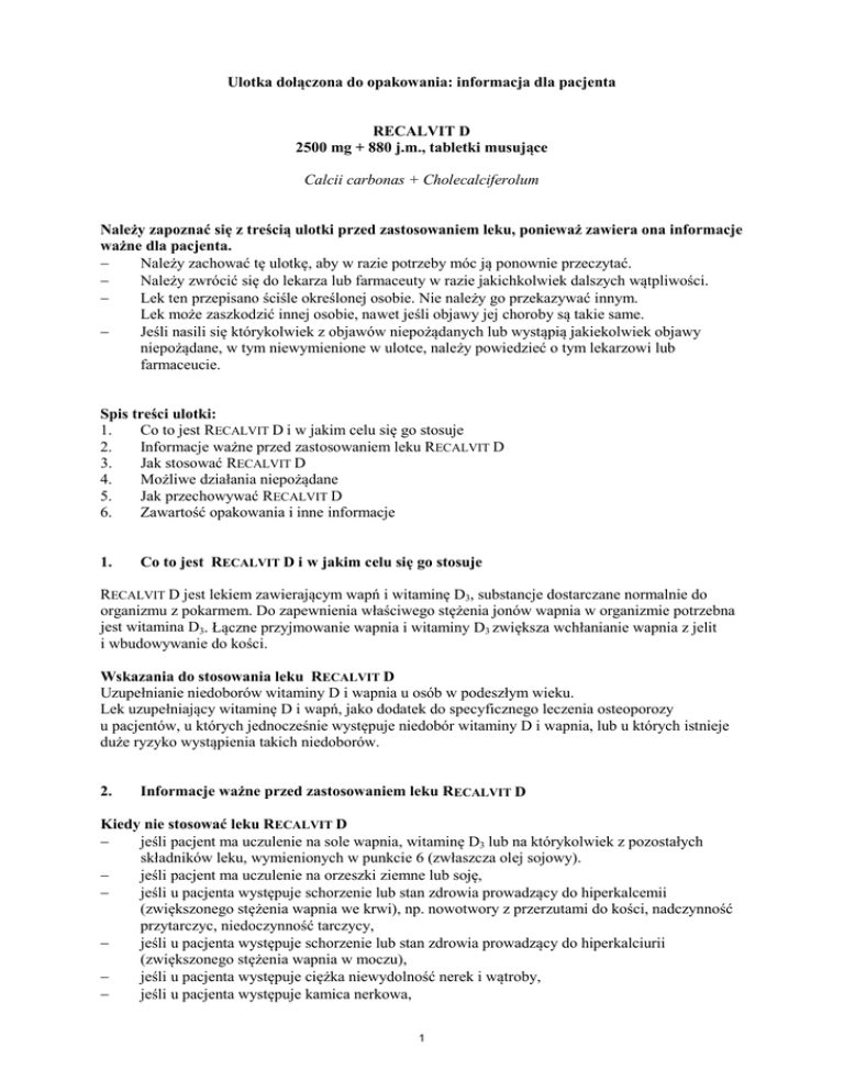 Ulotka dołączona do opakowania: informacja dla pacjenta RECALVIT D 2500 mg + 880 j.m., tabletki musujące Calcii carbonas + Cholecalciferolum Należy zapoznać się z treścią ulotki przed zastosowaniem leku, ponieważ zawiera ona informacje ważne dla pacjenta. − Należy zachować tę ulotkę, aby w razie potrzeby móc ją ponownie przeczytać. − Należy zwrócić się do lekarza lub farmaceuty w razie jakichkolwiek dalszych wątpliwości. − Lek ten przepisano ściśle określonej osobie. Nie należy go przekazywać innym. Lek może zaszkodzić innej osobie, nawet jeśli objawy jej choroby są takie same. − Jeśli nasili się którykolwiek z objawów niepożądanych lub wystąpią jakiekolwiek objawy niepożądane, w tym niewymienione w ulotce, należy powiedzieć o tym lekarzowi lub farmaceucie. Spis treści ulotki: 1. Co to jest RECALVIT D i w jakim celu się go stosuje 2. Informacje ważne przed zastosowaniem leku RECALVIT D 3. Jak stosować RECALVIT D 4. Możliwe działania niepożądane 5. Jak przechowywać RECALVIT D 6. Zawartość opakowania i inne informacje 1. Co to jest RECALVIT D i w jakim celu się go stosuje RECALVIT D jest lekiem zawierającym wapń i witaminę D3, substancje dostarczane normalnie do organizmu z pokarmem. Do zapewnienia właściwego stężenia jonów wapnia w organizmie potrzebna jest witamina D3. Łączne przyjmowanie wapnia i witaminy D3 zwiększa wchłanianie wapnia z jelit i wbudowywanie do kości. Wskazania do stosowania leku RECALVIT D Uzupełnianie niedoborów witaminy D i wapnia u osób w podeszłym wieku. Lek uzupełniający witaminę D i wapń, jako dodatek do specyficznego leczenia osteoporozy u pacjentów, u których jednocześnie występuje niedobór witaminy D i wapnia, lub u których istnieje duże ryzyko wystąpienia takich niedoborów. 2. Informacje ważne przed zastosowaniem leku RECALVIT D Kiedy nie stosować leku RECALVIT D − jeśli pacjent ma uczulenie na sole wapnia, witaminę D3 lub na którykolwiek z pozostałych składników leku, wymienionych w punkcie 6 (zwłaszcza olej sojowy). − jeśli pacjent ma uczulenie na orzeszki ziemne lub soję, − jeśli u pacjenta występuje schorzenie lub stan zdrowia prowadzący do hiperkalcemii (zwiększonego stężenia wapnia we krwi), np. nowotwory z przerzutami do kości, nadczynność przytarczyc, niedoczynność tarczycy, − jeśli u pacjenta występuje schorzenie lub stan zdrowia prowadzący do hiperkalciurii (zwiększonego stężenia wapnia w moczu), − jeśli u pacjenta występuje ciężka niewydolność nerek i wątroby, − jeśli u pacjenta występuje kamica nerkowa, 1 − − − − jeśli pacjent jest chory na fenyloketonurię (rzadka, dziedziczna choroba metaboliczna), jeśli u pacjenta występuje hiperwitaminoza D (nadmiar witaminy D w organizmie), u dzieci, u kobiet w ciąży i karmiących piersią. Ostrzeżenia i środki ostrożności Przed rozpoczęciem stosowania leku RECALVIT D należy zwrócić się do lekarza lub farmaceuty. Należy ściśle przestrzegać zaleconego dawkowania leku, ze względu na możliwość wystąpienia hiperwitaminozy. Podczas stosowania leku RECALVIT D należy unikać stosowania innych leków zawierających witaminę D i jej pochodne oraz pokarmów, które mogą być wzbogacone w witaminę D. U pacjentów z zaburzeniami czynności nerek lekarz będzie stosować witaminę D z zachowaniem ostrożności, obserwując jej wpływ na stężenie wapnia i fosforanów. Należy uwzględnić ryzyko zwapnienia tkanek miękkich. Lek należy ostrożnie stosować u osób ze skłonnością do tworzenia kamieni w drogach moczowych (pacjenci powinni zwiększyć przyjmowanie płynów). Podczas długotrwałego leczenia lekarz zaleci badanie stężenia wapnia we krwi i w moczu oraz badanie czynności nerek poprzez oznaczanie stężenia kreatyniny w surowicy. Kontrolowanie jest szczególnie ważne u pacjentów w podeszłym wieku leczonych jednocześnie glikozydami nasercowymi lub lekami moczopędnymi oraz u pacjentów z tendencją do tworzenia się kamieni. W przypadku wystąpienia hiperkalcemii (zwiększone stężenie wapnia we krwi) lub objawów zaburzenia czynności nerek, lekarz zaleci zmniejszenie dawki lub przerwanie leczenia. Jeżeli ilość wapnia wydalanego w moczu będzie większa niż 7,5 mmol/24 godziny (co odpowiada 300 mg wapnia w ciągu 24 godzin), należy natychmiast przerwać stosowanie leku. Lek należy stosować ostrożnie u pacjentów z sarkoidozą (ogólnoustrojową, niezakaźną chorobą układu odpornościowego), z powodu ryzyka zwiększenia przemiany witaminy D do jej aktywnych metabolitów. U tych pacjentów należy kontrolować stężenie wapnia w surowicy krwi i w moczu. Lek należy ostrożnie stosować u unieruchomionych pacjentów z osteoporozą, ze względu na ryzyko wystąpienia zwiększonego stężenia wapnia we krwi. Dzieci RECALVIT D nie jest przeznaczony do stosowania u dzieci. Inne leki i RECALVIT D Należy powiedzieć lekarzowi lub farmaceucie o wszystkich lekach stosowanych obecnie lub ostatnio, a także o lekach, które pacjent planuje stosować. Sole wapnia zmniejszają wchłanianie tetracyklin, związków żelaza, bisfosfonianów, fluorku sodu i fluorochinolonów. Jeśli stosuje się jednocześnie związki żelaza, bisfosfoniany, fluorek sodu lub fluorochinolony, należy je podawać co najmniej 2 godziny przed przyjęciem leku RECALVIT D. Tetracykliny należy podawać co najmniej 2 godziny przed lub 4 do 6 godzin po doustnym przyjęciu leku RECALVIT D. Hiperkalcemia w czasie stosowania wapnia i witaminy D może zwiększyć toksyczność digoksyny i innych glikozydów nasercowych oraz ryzyko wystąpienia zaburzeń rytmu serca. Lekarz będzie obserwował stan pacjenta stosując badania elektrokardiograficzne (EKG) i badania stężenia wapnia w surowicy krwi. Tiazydowe leki moczopędne (np. hydrochlorotiazyd) zmniejszają wydalanie wapnia w moczu. W przypadku jednoczesnego przyjmowania tiazydowych leków moczopędnych i pr