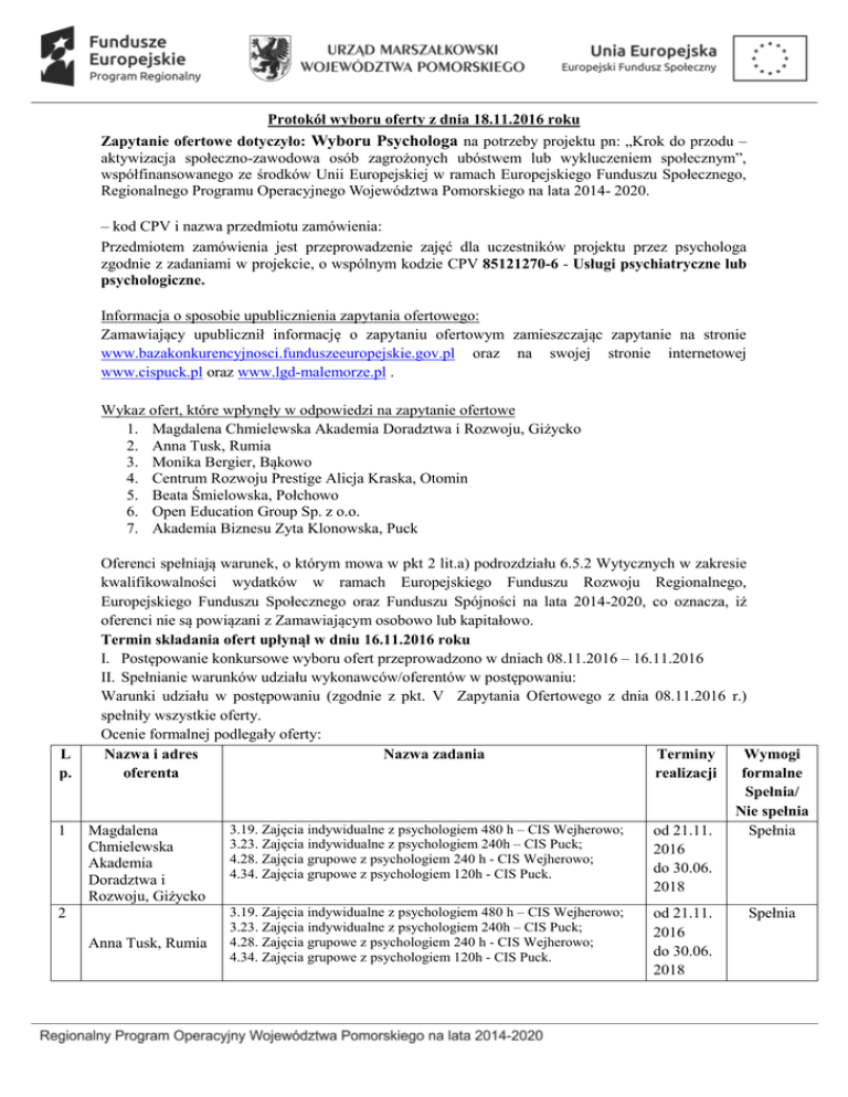 Protokół wyboru oferty z dnia 18.11.2016 roku Zapytanie ofertowe dotyczyło: Wyboru Psychologa na potrzeby projektu pn: „Krok do przodu – aktywizacja społeczno-zawodowa osób zagrożonych ubóstwem lub wykluczeniem społecznym”, współfinansowanego ze środków Unii Europejskiej w ramach Europejskiego Funduszu Społecznego, Regionalnego Programu Operacyjnego Województwa Pomorskiego na lata 2014- 2020. – kod CPV i nazwa przedmiotu zamówienia: Przedmiotem zamówienia jest przeprowadzenie zajęć dla uczestników projektu przez psychologa zgodnie z zadaniami w projekcie, o wspólnym kodzie CPV 85121270-6 - Usługi psychiatryczne lub psychologiczne. Informacja o sposobie upublicznienia zapytania ofertowego: Zamawiający upublicznił informację o zapytaniu ofertowym zamieszczając zapytanie na stronie www.bazakonkurencyjnosci.funduszeeuropejskie.gov.pl oraz na swojej stronie internetowej www.cispuck.pl oraz www.lgd-malemorze.pl . Wykaz ofert, które wpłynęły w odpowiedzi na zapytanie ofertowe 1. Magdalena Chmielewska Akademia Doradztwa i Rozwoju, Giżycko 2. Anna Tusk, Rumia 3. Monika Bergier, Bąkowo 4. Centrum Rozwoju Prestige Alicja Kraska, Otomin 5. Beata Śmielowska, Połchowo 6. Open Education Group Sp. z o.o. 7. Akademia Biznesu Zyta Klonowska, Puck L p. 1 2 Oferenci spełniają warunek, o którym mowa w pkt 2 lit.a) podrozdziału 6.5.2 Wytycznych w zakresie kwalifikowalności wydatków w ramach Europejskiego Funduszu Rozwoju Regionalnego, Europejskiego Funduszu Społecznego oraz Funduszu Spójności na lata 2014-2020, co oznacza, iż oferenci nie są powiązani z Zamawiającym osobowo lub kapitałowo. Termin składania ofert upłynął w dniu 16.11.2016 roku I. Postępowanie konkursowe wyboru ofert przeprowadzono w dniach 08.11.2016 – 16.11.2016 II. Spełnianie warunków udziału wykonawców/oferentów w postępowaniu: Warunki udziału w postępowaniu (zgodnie z pkt. V Zapytania Ofertowego z dnia 08.11.2016 r.) spełniły wszystkie oferty. Ocenie formalnej podlegały oferty: Nazwa i adres Nazwa zadania Terminy Wymogi oferenta realizacji formalne Spełnia/ Nie spełnia 3.19. Zajęcia indywidualne z psychologiem 480 h – CIS Wejherowo; Magdalena od 21.11. Spełnia 3.23. Zajęcia indywidualne z psychologiem 240h – CIS Puck; Chmielewska 2016 4.28. Zajęcia grupowe z psychologiem 240 h - CIS Wejherowo; Akademia do 30.06. 4.34. Zajęcia grupowe z psychologiem 120h - CIS Puck. Doradztwa i 2018 Rozwoju, Giżycko 3.19. Zajęcia indywidualne z psychologiem 480 h – CIS Wejherowo; od 21.11. Spełnia 3.23. Zajęcia indywidualne z psychologiem 240h – CIS Puck; 2016 Anna Tusk, Rumia 4.28. Zajęcia grupowe z psychologiem 240 h - CIS Wejherowo; do 30.06. 4.34. Zajęcia grupowe z psychologiem 120h - CIS Puck. 2018 Monika Bergier, Bąkowo 3.19. Zajęcia indywidualne z psychologiem 480 h – CIS Wejherowo; 3.23. Zajęcia indywidualne z psychologiem 240h – CIS Puck; 4.28. Zajęcia grupowe z psychologiem 240 h - CIS Wejherowo; 4.34. Zajęcia grupowe z psychologiem 120h - CIS Puck. Centrum Rozwoju Prestige Alicja Kraska, Otomin 3.19. Zajęcia indywidualne z psychologiem 480 h – CIS Wejherowo; 3.23. Zajęcia indywidualne z psychologiem 240h – CIS Puck; 4.28. Zajęcia grupowe z psychologiem 240 h - CIS Wejherowo; 4.34. Zajęcia grupowe z psychologiem 120h - CIS Puck. 3 4 5 Beata Śmielowska, Połchowo 3.19. Zajęcia indywidualne z psychologiem 480 h – CIS Wejherowo; 3.23. Zajęcia indywidualne z psychologiem 240h – CIS Puck; Open Education Group Sp. z o.o. 3.19. Zajęcia indywidualne z psychologiem 480 h – CIS Wejherowo; 3.23. Zajęcia indywidualne z psychologiem 240h – CIS Puck; 4.28. Zajęcia grupowe z psychologiem 240 h - CIS Wejherowo; 4.34. Zajęcia grupowe z psychologiem 120h - CIS Puck. Akademia Biznesu Zyta Klonowska, Puck 3.19. Zajęcia indywidualne z psychologiem 480 h – CIS Wejherowo; 3.23. Zajęcia indywidualne z psychologiem 240h – CIS Puck; 4.28. Zajęcia grupowe z psychologiem 240 h - CIS Wejherowo; 4.34. Zajęcia grupowe z psychologiem 120h - CIS Puck. 6 7 III. Informacja o wagach punktowych lub procentowych przypisanych do poszczególnych kryteriów oceny i sposobie przyznawania punktacji poszczególnym wykonawcom za spełnienie danego kryterium: Lp. Nazwa kryterium 1. Cena brutto brutto za godzinę prowadzenia zajęć (wraz z narzutami – ze wszystkimi kosztami) Doświadczenie - ilość godzin poradnictwa psychologicznego przeprowadzonych z osobami zagrożonymi wykluczeniem społecznym lub ubóstwem (wykazane w zał. nr 4 i potwierdzone odpowiednimi dokumentami) 2. od 21.11. 2016 do 30.06. 2018 od 21.11. 2016 do 30.06. 2018 od 21.11. 2016 do 30.06. 2018 od 21.11. 2016 do 30.06. 2018 od 21.11. 2016 do 30.06. 2018 Maksymalna liczba punktów Znaczenie kryterium 100 60 % 100 40 % Ocena ofert została przeprowadzona wyłącznie w oparciu o przedstawione powyżej kryteria według następujących zasad: 1. Oferent może uzyskać maksymalnie 60 punktów w kryterium dotyczącym ceny: cena oferty najniższej x 100 pkt x 60% cena oferty ocenianej 2. Oferent może uzyskać maksymalnie 40 punktów w kryterium dotyczącym doświadczenia w zakresie przeprowadzania zajęć poradnictwa psychologicznego z osobami zagrożonymi wykluczeniem społecznym lub ubóstwem. Ilość godzin poradnictwa psychologicznego z oferty ocenianej ilość godzin poradnictwa psychologicznego oferty z największym doświadczeniem Maksymalna ilość punktów możliwych do zdobycia – 100 pkt. Cena + Doświadczenie = wynik punktowy oferty ocenianej x 100 pkt x 40% Spełnia Spełnia Spełnia Spełnia Spełnia IV. Wykaz ofert, które wpłynęły w odpowiedzi na zapytanie ofertowe: Dane z oferty, które stanowią odpowiedź na kryteria oceny oferty Data wpływu oferty Dane Wykonawcy 1. 14.11.2016r Magdalena Chmielewska Akademia Doradztwa i Rozwoju, Giżycko 2. 15.11.2016r Anna Tusk, Rumia 3. 15.11.2016r Monika Bergier, Bąkowo 4. 15.11.2016r 5. 16.11.2016r Beata Śmielowska, Połchowo 6. 16