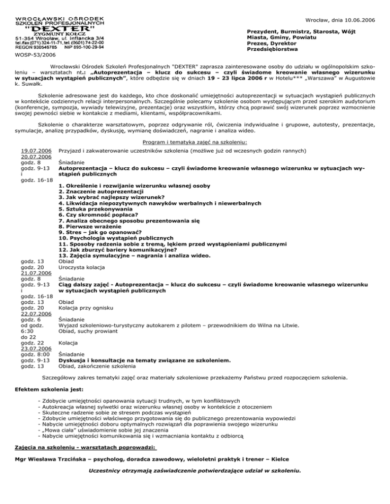 Wrocław, dnia 10.06.2006 Prezydent, Burmistrz, Starosta, Wójt Miasta, Gminy, Powiatu Prezes, Dyrektor Przedsiębiorstwa WOSP-53/2006 Wrocławski Ośrodek Szkoleń Profesjonalnych "DEXTER" zaprasza zainteresowane osoby do udziału w ogólnopolskim szkoleniu – warsztatach nt.: „Autoprezentacja – klucz do sukcesu – czyli świadome kreowanie własnego wizerunku w sytuacjach wystąpień publicznych”, które odbędzie się w dniach 19 - 23 lipca 2006 r w Hotelu*** „Warszawa” w Augustowie k. Suwałk. Szkolenie adresowane jest do kaŜdego, kto chce doskonalić umiejętności autoprezentacji w sytuacjach wystąpień publicznych w kontekście codziennych relacji interpersonalnych. Szczególnie polecamy szkolenie osobom występującym przed szerokim audytorium (konferencje, sympozja, wywiady telewizyjne, prezentacje) oraz wszystkim, którzy chcą poprawić swój wizerunek poprzez wzmocnienie swojej pewności siebie w kontakcie z mediami, klientami, współpracownikami. Szkolenie o charakterze warsztatowym, poprzez odgrywanie ról, ćwiczenia indywidualne i grupowe, autotesty, prezentacje, symulacje, analizę przypadków, dyskusję, wymianę doświadczeń, nagranie i analiza wideo. Program i tematyka zajęć na szkoleniu: 19.07.2006 20.07.2006 godz. 8 godz. 9-13 i godz. 16-18 godz. 13 godz. 20 21.07.2006 godz. 8 godz. 9-13 i godz. 16-18 godz. 13 godz. 20 22.07.2006 godz. 6 od godz. 6:30 do 22 godz. 22 23.07.2006 godz. 8:00 godz. 9-13 godz. 13 Przyjazd i zakwaterowanie uczestników szkolenia (moŜliwe juŜ od wczesnych godzin rannych) Śniadanie Autoprezentacja – klucz do sukcesu – czyli świadome kreowanie własnego wizerunku w sytuacjach wystąpień publicznych 1. Określenie i rozwijanie wizerunku własnej osoby 2. Znaczenie autoprezentacji 3. Jak wybrać najlepszy wizerunek? 4. Likwidacja niepozytywnych nawyków werbalnych i niewerbalnych 5. Sztuka przekonywania 6. Czy skromność popłaca? 7. Analiza obecnego sposobu prezentowania się 8. Pierwsze wraŜenie 9. Stres – jak go opanować? 10. Psychologia wystąpień publicznych 11. Sposoby radzenia sobie z tremą, lękiem przed wystąpieniami publicznymi 12. Jak zburzyć bariery komunikacyjne? 13. Zajęcia symulacyjne – nagrania i analiza wideo. Obiad Uroczysta kolacja Śniadanie Ciąg dalszy zajęć - Autoprezentacja – klucz do sukcesu – czyli świadome kreowanie własnego wizerunku w sytuacjach wystąpień publicznych Obiad Kolacja przy ognisku Śniadanie Wyjazd szkoleniowo-turystyczny autokarem z pilotem – przewodnikiem do Wilna na Litwie. Obiad, suchy prowiant Kolacja Śniadanie Dyskusja i konsultacje na tematy związane ze szkoleniem. Obiad, zakończenie szkolenia Szczegółowy zakres tematyki zajęć oraz materiały szkoleniowe przekaŜemy Państwu przed rozpoczęciem szkolenia. Efektem szkolenia jest: - Zdobycie umiejętności opanowania sytuacji trudnych, w tym konfliktowych Autokreacja własnej sylwetki oraz wizerunku własnej osoby w kontekście z otoczeniem Skuteczne radzenie sobie ze stresem podczas wystąpień Zdobycie umiejętności właściwego przygotowania się do publicznego prezentowania wypowiedzi Nabycie umiejętności doboru optymalnych rozwiązań dla poprawienia swojego wizerunku „Mowa ciała” uświadomienie sobie jej znaczenia Nabycie umiejętności komunikowania się i wzmacniania kontaktu z odbiorcą Zajęcia na szkoleniu - warsztatach poprowadzi: Mgr Wiesława Trzcińska – psycholog, doradca zawodowy, wieloletni praktyk i trener – Kielce Uczestnicy otrzymają zaświadczenie potwierdzające udział w szkoleniu. Warunki organizacyjno – finansowe: Uczestnicy szkolenia mają zagwarantowane 4 noclegi w Hotelu*** “Warszawa” w Augustowie w pokojach 1 - lub 2 osobowych (łazienka, wc, radio, telewizor z programem satelitarnym), a takŜe wyŜywienie. Podczas pobytu w Hotelu*** “Warszawa” uczestnicy mogą korzystać z restauracji, drink-baru, sauny, siłowni, bilarda oraz wypoŜyczalni sprzętu sportowego – wodnego i strzeŜonego parkingu samochodowego. Hotel połoŜony jest nad brzegiem jeziora Necko. Ogólny koszt uczestnictwa w szkoleniu wynosi: 1380 złotych (słownie: jeden tysiąc trzysta osiemdziesiąt złotych) – w pokoju 2- osobowym 1580 złotych (słownie: jeden tysiąc pięćset osiemdziesiąt złotych) – w pokoju 1- osobowym (ilość pokoi ograniczona) Istnieje moŜliwość skorzystania tylko z dwóch pierwszych dni szkolenia w cenie 890 złotych (pokój 2 osobowy). MoŜna takŜe skorzystać z wybranych dni szkolenia w cenie 260 złotych za dzień (z obiadem). Kwotę za uczestnictwo w szkoleniu prosimy przekazać do dnia 12 lipca 2006 r. na konto: WOSP „DEXTER” PKO BP S.A. – III O/Wrocław nr 11 1020 5242 0000 2302 0024 8633 Wypełnioną kartę uczestnictwa prosimy przekazać pocztą, faksem lub e-mailem w terminie do dnia 12.07.2006 na adres: Wrocławski Ośrodek Szkoleń Profesjonalnych „Dexter” 51-354 Wrocław, ul. Inflancka 3/4 tel./fax. 071 324 11 71, tel. kom. 601 74 22 00 e-mail: [email protected] www.dexter.com.pl Adres hotelu, w którym odbędzie się szkolenie: Hotel „Warszawa” ul. Zdrojowa 1, 16-300 Augustów, tel. 087 643 28 05. Dojazd pociągiem PKP do stacji w Augustowie. Hotel znajduje się około 3 km od stacji (dojazd do hotelu taksówką). O zakwalifikowaniu uczestników decyduje kolejność wpływu karty uczestnictwa i wpłata pieniędzy na konto. Jednocześnie informujemy, Ŝe nie wysyłamy pisemnych potwierdzeń przyjęcia zgłoszenia, jedynie w przypadku braku miejsc zostanie wysłana pisemna odmowa i zwrot pieniędzy. W przypadku nieobecności uczestnika na szkoleniu lub rezygnacji w terminie krótszym niŜ 7 dni od daty rozpoczęcia szkolenia z przyczyn niezaleŜnych od organizatora, zgłaszający zobowiązany jest do pokrycia pełnych kosztów szkolenia. W związku z planowanym wyjazdem za granicę prosimy o wzięcie ze sobą waŜnego paszportu lub dowodu osobistego. Fakturę VAT za udział w szkoleniu uczestnicy otrzymają w o