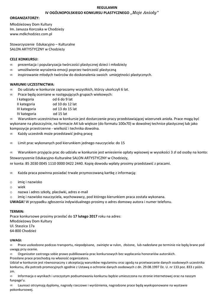 REGULAMIN IV OGÓLNOPOLSKIEGO KONKURSU PLASTYCZNEGO „Moje Anioły” ORGANIZATORZY: Młodzieżowy Dom Kultury Im. Janusza Korczaka w Chodzieży www.mdkchodziez.com.pl Stowarzyszenie Edukacyjno – Kulturalne SALON ARTYSTYCZNY w Chodzieży CELE KONKURSU: • prezentacja i popularyzacja twórczości plastycznej dzieci i młodzieży • umożliwienie wyrażenia emocji poprzez twórczość plastyczną • inspirowanie młodych twórców do doskonalenia swoich umiejętności plastycznych. WARUNKI UCZESTNICTWA: • Do udziału w konkursie zapraszamy wszystkich, którzy ukończyli 6 lat. • Prace będą oceniane w następujących grupach wiekowych: I kategoria od 6 do 9 lat II kategoria od 10 do 12 lat III kategoria od 13 do 15 lat IV kategoria od 15 lat • Warunkiem uczestnictwa w konkursie jest dostarczenie pracy przedstawiającej wizerunek anioła. Prace mogą być wykonane na płaszczyźnie, na formacie A4 lub większe (do formatu 100x70) w dowolnej technice plastycznej lub jako kompozycje przestrzenne - wielkość i technika dowolna. • Każdy uczestnik może przedstawić jedną pracę • Limit prac wykonanych pod kierunkiem jednego nauczyciela: do 15 • Warunkiem przyjęcia prac do udziału w konkursie jest wniesienie opłaty wpisowej w wysokości 3 zł od osoby na konto: Stowarzyszenie Edukacyjno-Kulturalne SALON ARTYSTYCZNY w Chodzieży, nr konta: 85 2030 0045 1110 0000 0422 2440. Kopię dowodu wpłaty prosimy przedstawić z pracami. • Każda praca powinna posiadać trwale przymocowaną kartkę z informacją: o imię i nazwisko o wiek o nazwa i adres szkoły, placówki, adres e-mail o imię i nazwisko nauczyciela, wychowawcy, pod którego kierunkiem praca została wykonana. UWAGA! W przypadku zgłoszenia indywidualnego prosimy o adres domowy autora i numer telefonu. TERMIN: Prace konkursowe prosimy przesłać do 17 lutego 2017 roku na adres: Młodzieżowy Dom Kultury Ul. Staszica 17a 64-800 Chodzież UWAGI: • Prace uszkodzone podczas transportu, niepodpisane, zwinięte w rulon, złożone, lub nadesłane po terminie nie będą brane pod uwagę przy ocenie. • Organizator zastrzega sobie prawo publikowania prac konkursowych bez wypłacania honorariów autorskich. Przesłane prace przechodzą na własność organizatora. Udział w konkursie jest równoznaczny z akceptacją warunków regulaminu oraz zgodą na przetwarzanie danych osobowych uczestnika konkursu, dla potrzeb promocyjnych zgodnie z Ustawą o ochronie danych osobowych z dn. 29.08.1997 Dz. U. nr 133 poz. 833 z późn. zm. • Informacja o wynikach i uroczystym podsumowaniu konkursu będzie umieszczona na stronie internetowej oraz na naszym funpage’u. • Laureaci otrzymają dyplomy, nagrody rzeczowe i wyróżnienia, nagrodzone prace będą wyeksponowane na wystawie pokonkursowej.