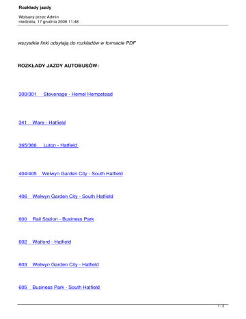 Rozkłady jazdy Wpisany przez Admin niedziela, 17 grudnia 2006 11:48 wszystkie linki odsyłają do rozkładów w formacie PDF ROZKŁADY JAZDY AUTOBUSÓW: 300/301 Stevenage - Hemel Hempstead 341 Ware - Hatfield 365/366 Luton - Hatfield 404/405 Welwyn Garden City - South Hatfield 406 Welwyn Garden City - South Hatfield 600 Rail Station - Business Park 602 Watford - Hatfield 603 Welwyn Garden City - Hatfield 605 Business Park - South Hatfield 1/3 Rozkłady jazdy Wpisany przez Admin niedziela, 17 grudnia 2006 11:48 608 Hatfield Station - Hatfield Garden Village 609 Railway Station - Salisbury Village 610 Enfield - Hatfield 614 Queensbury - Hatfield 615 Mount Vernon/Rayners Lane - Hatfield 620 Business Park - Town Centre 632 Watford - Hatfield 634 Hitchin - Hemel Hempstead 636 Hatfield - Luton 641 Broxbourne - Hatfield 2/3 Rozkłady jazdy Wpisany przez Admin niedziela, 17 grudnia 2006 11:48 655 Borehamwood - Hatfield 724 Heathrow Airport - Harlow 797 Hitchin/Stevenage - London 826 Hatfield - Dame Alice Owens School 842 Hatfield - Chancellors School 843 Hatfield - Chancellors School 3/3
