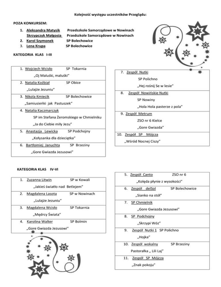 Kolejność występu uczestników Przeglądu: POZA KONKURSEM: 1. Aleksandra Matysik Skrzypczyk Małgosia 2. Karol Szymonek 3. Lena Krupa Przedszkole Samorządowe w Nowinach Przedszkole Samorządowe w Nowinach SP Bolechowice SP Bolechowice KATEGORIA KLAS I-III 1. Wojciech Wcisło SP Tokarnia „Oj Maluśki, maluśki” 2. Natalia Koźbiał SP Polichno SP Obice „Lulajże Jezuniu” 3. Nikola Kmiecik 7. Zespół Nutki SP Bolechowice „Hej rośnij Se w lesie” 8. Zespół Nowioskie Nutki SP Nowiny „Samiusieoki jak Pastuszek” 4. Natalia Kaczmarczyk SP im Stefana Żeromskiego w Chmielniku „Hola Hola pasterze z pola” 9. Zespół Metrum ZSO nr 6 Kielce „Ja do Ciebie miły Jezu” 5. Anastazja Lewicka SP Podchojny „Kołysanka dla dzieciątka” 6. Bartłomiej Januchta „Gore Gwiazda” 10. Zespół SP Mójcza „Wśród Nocnej Ciszy” SP Brzeziny „Gore Gwiazda Jezusowi” KATEGORIA KLAS IV-VI 5. Zespół Canto 1. Zuzanna Litwin SP w Kowali „Jakieś światło nad Betlejem” 2. Magdalena Lasota 3. Magdalena Wcisło „Gore Gwiazda Jezusowi” 6. Zespół delSol SP Bolechowice „Sianko na stół” 7. SP Chmielnik SP Tokarnia „Mędrcy Świata” 4. Karolina Walter „Kolęda płynie z wysokości” SP w Nowinach „Lulajże Jezuniu” ZSO nr 6 „Gore Gwiazda Jezusowi” 8. SP Podchojny SP Bolmin „Skrzypi Wóz” 9. Zespół Nutki 1 SP Polichno „Hojka” 10. Zespół wokalny Pastorałka „ Lili Laj” 11. Zespół SP Mójcza „Znak pokoju” SP Brzeziny