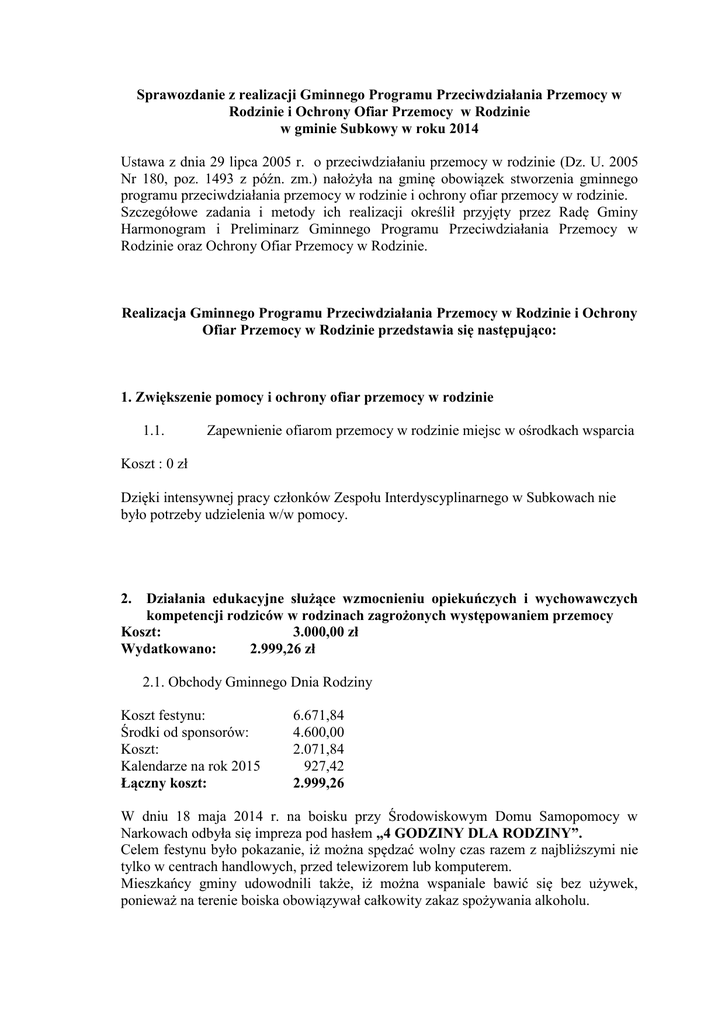 Sprawozdanie z realizacji Gminnego Programu Przeciwdziałania Przemocy w Rodzinie i Ochrony Ofiar Przemocy w Rodzinie w gminie Subkowy w roku 2014 Ustawa z dnia 29 lipca 2005 r. o przeciwdziałaniu przemocy w rodzinie (Dz. U. 2005 Nr 180, poz. 1493 z późn. zm.) nałożyła na gminę obowiązek stworzenia gminnego programu przeciwdziałania przemocy w rodzinie i ochrony ofiar przemocy w rodzinie. Szczegółowe zadania i metody ich realizacji określił przyjęty przez Radę Gminy Harmonogram i Preliminarz Gminnego Programu Przeciwdziałania Przemocy w Rodzinie oraz Ochrony Ofiar Przemocy w Rodzinie. Realizacja Gminnego Programu Przeciwdziałania Przemocy w Rodzinie i Ochrony Ofiar Przemocy w Rodzinie przedstawia się następująco: 1. Zwiększenie pomocy i ochrony ofiar przemocy w rodzinie 1.1. Zapewnienie ofiarom przemocy w rodzinie miejsc w ośrodkach wsparcia Koszt : 0 zł Dzięki intensywnej pracy członków Zespołu Interdyscyplinarnego w Subkowach nie było potrzeby udzielenia w/w pomocy. 2. Działania edukacyjne służące wzmocnieniu opiekuńczych i wychowawczych kompetencji rodziców w rodzinach zagrożonych występowaniem przemocy Koszt: 3.000,00 zł Wydatkowano: 2.999,26 zł 2.1. Obchody Gminnego Dnia Rodziny Koszt festynu: Środki od sponsorów: Koszt: Kalendarze na rok 2015 Łączny koszt: 6.671,84 4.600,00 2.071,84 927,42 2.999,26 W dniu 18 maja 2014 r. na boisku przy Środowiskowym Domu Samopomocy w Narkowach odbyła się impreza pod hasłem „4 GODZINY DLA RODZINY”. Celem festynu było pokazanie, iż można spędzać wolny czas razem z najbliższymi nie tylko w centrach handlowych, przed telewizorem lub komputerem. Mieszkańcy gminy udowodnili także, iż można wspaniale bawić się bez używek, ponieważ na terenie boiska obowiązywał całkowity zakaz spożywania alkoholu. Dzięki zaangażowaniu różnych podmiotów udało nam się udowodnić, iż wspólnymi siłami można wiele zdziałać, nawet w tak małej gminie, jak nasza. Licznie zebrani mieszkańcy Gminy Subkowy mieli okazje podziwiać występy artystyczne oraz pokaz karate w wykonaniu swoich pociech. Dla fanów motoryzacji nie lada gratką były pokazy wozów strażackich i policyjnych, a także prezentacja motocykli z Klubu Motocykli Ciężkich TORNADO z Tczewa. W czasy średniowiecza wprowadziło nas Bractwo Rycerskie KERIN z miejscowości Subkowy. Dzieci i młodzież mogły uczestniczyć w zabawach i konkursach zorganizowanych przez Stowarzyszenie „Pomoc za Jeden Uśmiech”. Organizatorzy dopilnowali również, aby zebrani mogli posilić się kiełbaską z grilla, bigosem bądź też przepysznymi domowymi wypiekami upieczonymi przez organizatorki. O bezpieczeństwo dbali funkcjonariusze policji z Posterunku Policji w Subkowach. Na koniec imprezy odbył się koncert Zespołu CRISTO. Na rzecz Stowarzyszenia „Pomoc za jeden uśmiech” przekazano 1.008,77 zł. Pieniądze pochodziły ze sprzedaży domowych wypieków. Podczas festynu zostały wręczone również nagrody najmłodszym, którzy wzięli udział w konkursie plastycznym” Rodzinny świat – bezpieczny świat”. Zwycięskie prace plastyczne zostały umieszczone w kalendarzu na rok 2015. Koszt kalendarzy: 927,42 zł 3. Udostępnienie pomocy terapeutycznej dla ofiar i sprawców przemocy w rodzinie 3.1. Częściowe pokrywanie kosztów dojazdów na zajęcia terapeutyczne dla ofiar przemocy w rodzinie oraz na zajęcia korekcyjno – edukacyjne dla sprawców przemocy Koszt: 0 zł Żadna z osób nie zwróciła się o pomoc na pokrywanie kosztów przejazdu na zajęcia terapeutyczne dla ofiar przemocy w rodzinie oraz na zajęcia korekcyjno – edukacyjne. 4. Podnoszenie kompetencji służb i instytucji w zakresie przemocy w rodzinie 4.1. Szkolenia dla członków zespołu interdyscyplinarnego grup roboczych Koszt: Wydatkowano: 3.000,00 zł 3.000,00 zł W dniu 24.07.2014 r. przewodnicząca Zespołu Interdyscyplinarnego uczestniczyła w szkoleniu pt. „Szkolenie dla Przewodniczących Zespołów Interdyscyplinarnych oraz kandydatów na stanowisko Przewodniczącego Zespołu Interdyscyplinarnego” organizowanym przez Centrum Profilaktyki i Reedukacji „Atelier” Sp. z o.o. z Krakowa. Koszt szkolenia: 250 zł, delegacja: 43,46 zł. 10.11.2014 r. odbyło się szkolenie dla nauczycieli, funkcjonariuszy policji, pracowników ośrodka zdrowia, GOPS oraz ŚDS, którzy mogą mieć styczność w codziennej pracy z problemem przemocy w rodzinie. W szkoleniu udział wzięło łącznie 59 osób. Koszt szkolenia: 2.000,00 zł. W listopadzie również przewodnicząca Zespołu Interdyscyplinarnego, z-ca przewodniczącej oraz sekretarz Zespołu wzięli udział w kursie „Przeciwdziałanie Przemocy w Rodzinie 2015 Prawo i praktyka”. Jest to kurs e – learningowy. Będzie on trwał do lutego 2015 r. Koszt kursu za 3 osoby: 706,54 zł. 5. Działalność Zespołu Interdyscyplinarnego w Subkowach W roku 2014 Zespół Interdyscyplinarny zebrał się pięć razy, natomiast członkowie grup roboczych 42 razy. W wyniku podjętych przez grupy robocze działań 1 osoba wyraziły chęć udziału w programie korekcyjno – edukacyjnym dla sprawców przemocy w Wydziale Interwencji Kryzysowej w Tczewie, trzy sprawy zostały skierowane do Prokuratury Rejonowej w Tczewie, cztery sprawy zostały skierowane do GKRPA w Subkowach, cztery osoby są objęte wsparciem psychologicznym, Ogółem koszt realizacji Gminnego Programu Przeciwdziałania Przemocy w Rodzinie i Ochrony Ofiar Przemocy w Rodzinie w 2014 r. wyniósł 5.999,26 zł Sporządziła: Ewa Langowska