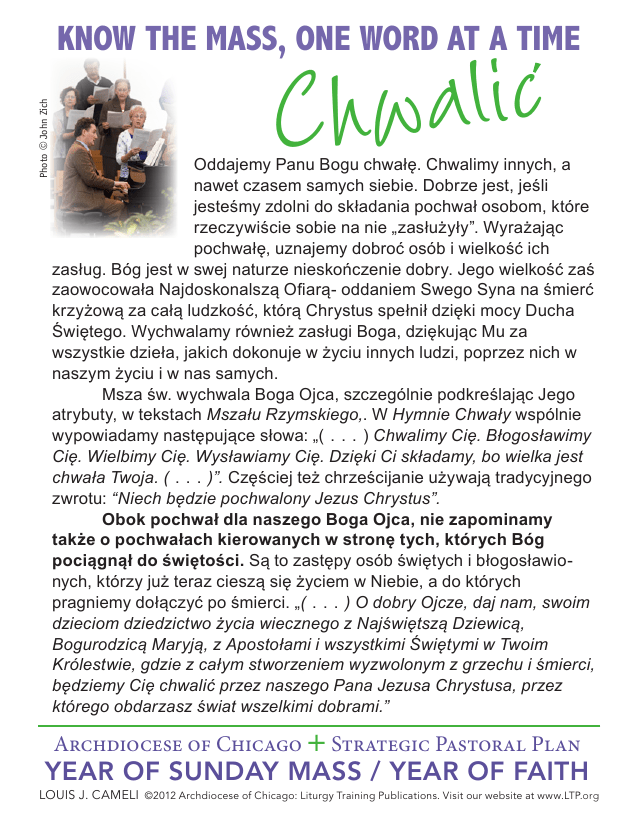 Chwalic Photo © John Zich KNOW THE MASS, ONE WORD AT A TIME Oddajemy Panu Bogu chwałę. Chwalimy innych, a nawet czasem samych siebie. Dobrze jest, jeśli jesteśmy zdolni do składania pochwał osobom, które rzeczywiście sobie na nie „zasłużyły”. Wyrażając pochwałę, uznajemy dobroć osób i wielkość ich zasług. Bóg jest w swej naturze nieskończenie dobry. Jego wielkość zaś zaowocowała Najdoskonalszą Ofiarą- oddaniem Swego Syna na śmierć krzyżową za całą ludzkość, którą Chrystus spełnił dzięki mocy Ducha Świętego. Wychwalamy również zasługi Boga, dziękując Mu za wszystkie dzieła, jakich dokonuje w życiu innych ludzi, poprzez nich w naszym życiu i w nas samych. Msza św. wychwala Boga Ojca, szczególnie podkreślając Jego atrybuty, w tekstach Mszału Rzymskiego,. W Hymnie Chwały wspólnie wypowiadamy następujące słowa: „( . . . ) Chwalimy Cię. Błogosławimy Cię. Wielbimy Cię. Wysławiamy Cię. Dzięki Ci składamy, bo wielka jest chwała Twoja. ( . . . )”. Częściej też chrześcijanie używają tradycyjnego zwrotu: “Niech będzie pochwalony Jezus Chrystus”. Obok pochwał dla naszego Boga Ojca, nie zapominamy także o pochwałach kierowanych w stronę tych, których Bóg pociągnął do świętości. Są to zastępy osób świętych i błogosławionych, którzy już teraz cieszą się życiem w Niebie, a do których pragniemy dołączyć po śmierci. „( . . . ) O dobry Ojcze, daj nam, swoim dzieciom dziedzictwo życia wiecznego z Najświętszą Dziewicą, Bogurodzicą Maryją, z Apostołami i wszystkimi Świętymi w Twoim Królestwie, gdzie z całym stworzeniem wyzwolonym z grzechu i śmierci, będziemy Cię chwalić przez naszego Pana Jezusa Chrystusa, przez którego obdarzasz świat wszelkimi dobrami.” Archdiocese of Chicago È Strategic Pastoral Plan YEAR OF SUNDAY MASS / YEAR OF FAITH LOUIS J. CAMELI ©2012 Archdiocese of Chicago: Liturgy Training Publications. Visit our website at www.LTP.org