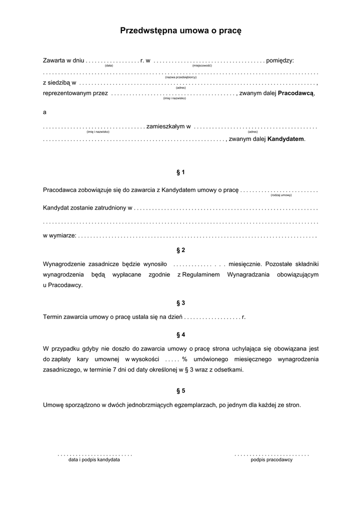Przedwstępna umowa o pracę Zawarta w dniu . . . . . . . . . . . . . . . . . . r. w . . . . . . . . . . . . . . . . . . . . . . . . . . . . . . . . . . . . . pomiędzy: (data) (miejscowość) ........................................................................................... (nazwa przedsiębiorcy) z siedzibą w . . . . . . . . . . . . . . . . . . . . . . . . . . . . . . . . . . . . . . . . . . . . . . . . . . . . . . . . . . . . . . . . . . . . . . . . . . . . . . , (adres) reprezentowanym przez . . . . . . . . . . . . . . . . . . . . . . . . . . . . . . . . . . . . . . . . . , zwanym dalej Pracodawcą, (imię i nazwisko) a . . . . . . . . . . . . . . . . . . . . . . . . . . . . . . . . . . zamieszkałym w . . . . . . . . . . . . . . . . . . . . . . . . . . . . . . . . . . . . . . . . . (imię i nazwisko) (adres) . . . . . . . . . . . . . . . . . . . . . . . . . . . . . . . . . . . . . . . . . . . . . . . . . . . . . . . . . . . . , zwanym dalej Kandydatem. §1 Pracodawca zobowiązuje się do zawarcia z Kandydatem umowy o pracę . . . . . . . . . . . . . . . . . . . . . . . . . . (rodzaj umowy) Kandydat zostanie zatrudniony w . . . . . . . . . . . . . . . . . . . . . . . . . . . . . . . . . . . . . . . . . . . . . . . . . . . . . . . . . . . . . ........................................................................................... w wymiarze: . . . . . . . . . . . . . . . . . . . . . . . . . . . . . . . . . . . . . . . . . . . . . . . . . . . . . . . . . . . . . . . . . . . . . . . . . . . . . . . §2 Wynagrodzenie zasadnicze będzie wynosiło wynagrodzenia będą wypłacane zgodnie . . . . . . . . . . . . . . . . miesięcznie. Pozostałe składniki z Regulaminem Wynagradzania obowiązującym u Pracodawcy. §3 Termin zawarcia umowy o pracę ustala się na dzień . . . . . . . . . . . . . . . . . . . r. §4 W przypadku gdyby nie doszło do zawarcia umowy o pracę strona uchylająca się obowiązana jest do zapłaty kary umownej w wysokości ..... % umówionego miesięcznego wynagrodzenia zasadniczego, w terminie 7 dni od daty określonej w § 3 wraz z odsetkami. §5 Umowę sporządzono w dwóch jednobrzmiących egzemplarzach, po jednym dla każdej ze stron. ......................... ......................... data i podpis kandydata podpis pracodawcy