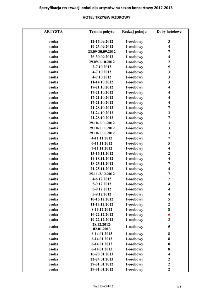 Specyfikacja rezerwacji pokoi dla artystów na sezon koncertowy 2012-2013 HOTEL TRZYGWIAZDKOWY ARTYSTA Termin pobytu Rodzaj pokoju Doby hotelowe osoba osoba osoba osoba osoba osoba osoba osoba osoba osoba osoba osoba osoba osoba osoba osoba osoba osoba osoba osoba osoba osoba osoba osoba osoba osoba osoba osoba osoba osoba osoba osoba osoba osoba osoba osoba 12-15.09.2012 19-23.09.2012 23.09-30.09.2012 26-30.09.2012 29.09-1.10.2012 2-7.10.2012 4-7.10.2012 4-7.10.2012 11-14.10.2012 17-21.10.2012 17-21.10.2012 17-21.10.2012 17-21.10.2012 21-28.10.2012 21-24.10.2012 21-28.10.2012 29.10-1.11.2012 29.10-1.11.2012 29.10-1.11.2012 4-11.11.2012 6-11.11.2012 7-11.11.2012 13-15.11.2012 14-18.11.2012 18-25.11.2012 21-25.11.2012 25.11-2.12.2012 4-6.12.2012 5-9.12.2012 5-9.12.2012 5-9.12.2012 10-15.12.2012 11-13.12.2012 8-16.12.2012 16-22.12.2012 19-22.12.2012 28.12.201202.01.2013 6-14.01.2013 6-14.01.2013 6-14.01.2013 6-14.01.2013 16-20.01.2013 22-24.01.2013 29-31.01.2012 29-31.01.2012 1-osobowy 1-osobowy 1-osobowy 1-osobowy 1-osobowy 1-osobowy 1-osobowy 1-osobowy 1-osobowy 1-osobowy 1-osobowy 1-osobowy 1-osobowy 1-osobowy 1-osobowy 1-osobowy 1-osobowy 1-osobowy 1-osobowy 1-osobowy 1-osobowy 1-osobowy 1-osobowy 1-osobowy 1-osobowy 1-osobowy 1-osobowy 1-osobowy 1-osobowy 1-osobowy 1-osobowy 1-osobowy 1-osobowy 1-osobowy 1-osobowy 1-osobowy 3 4 7 4 2 5 3 3 3 4 4 4 4 7 3 7 3 3 3 7 5 4 2 4 7 4 7 2 4 4 4 5 2 8 6 3 1-osobowy 5 1-osobowy 1-osobowy 1-osobowy 1-osobowy 1-osobowy 1-osobowy 1-osobowy 1-osobowy 8 8 8 8 4 2 2 2 osoba osoba osoba osoba osoba osoba osoba osoba osoba NA.215-ZP4/12 1/3 Specyfikacja rezerwacji pokoi dla artystów na sezon koncertowy 2012-2013 HOTEL TRZYGWIAZDKOWY osoba osoba osoba osoba osoba osoba osoba osoba osoba osoba osoba osoba osoba osoba osoba osoba osoba osoba osoba osoba osoba osoba osoba osoba osoba osoba osoba osoba osoba osoba osoba osoba osoba osoba osoba osoba osoba osoba osoba osoba osoba osoba osoba osoba osoba osoba osoba osoba 29-31.01.2012 27.01.-3.02.2013 30.01-3.02.2013 30.01-3.02.2013 30.01-3.02.2013 30.01-3.02.2013 3-10.02.2013 18-23.02.2013 26-28.02.2013 26-28.02.2013 26-28.02.2013 24.02-3.03.2013 27.02-3.03.2013 3-10.03.2013 13-17.03.2013 20-24.03.2013 20-24.03.2013 20-24.03.2013 20-24.03.2013 3-7.04.2013 3-7.04.2013 8-13.04.2014 12-14.04.2013 12-14.04.2013 12-14.04.2013 17-21.04.2013 17-21.04.2013 21-28.04.2013 24-28.04.2013 8-12.05.2013 12-19.05.2013 15-19.05.2013 15-19.05.2013 15-19.05.2013 15-19.05.2013 22-24.05.2013 22-24.05.2013 22-24.05.2013 22-24.05.2013 26.05-2.06.2013 29.05-2.06.2013 2-9.06.2013 3-8.06.2013 4-8.06.2013 11-16.06.2013 11-16.06.2013 11-16.06.2013 11-16.06.2013 NA.215-ZP4/12 1-osobowy 1-osobowy 1-osobowy 1-osobowy 1-osobowy 1-osobowy 1-osobowy 1-osobowy 1-osobowy 1-osobowy 1-osobowy 1-osobowy 1-osobowy 1-osobowy 1-osobowy 1-osobowy 1-osobowy 1-osobowy 1-osobowy 1-osobowy 1-osobowy 1-osobowy 1-osobowy 1-osobowy 1-osobowy 1-osobowy 1-osobowy 1-osobowy 1-osobowy 1-osobowy 1-osobowy 1-osobowy 1-osobowy 1-osobowy 1-osobowy 1-osobowy 1-osobowy 1-osobowy 1-osobowy 1-osobowy 1-osobowy 1-osobowy 1-osobowy 1-osobowy 1-osobowy 1-osobowy 1-osobowy 1-osobowy 2 7 4 4 4 4 7 5 2 2 2 7 4 7 4 4 4 4 4 4 4 5 2 2 2 4 4 7 4 4 7 4 4 4 4 2 2 2 2 7 4 7 5 4 5 5 5 5 2/3 Specyfikacja rezerwacji pokoi dla artystów na sezon koncertowy 2012-2013 HOTEL TRZYGWIAZDKOWY Razem: 402 doby hotelowe NA.215-ZP4/12 3/3