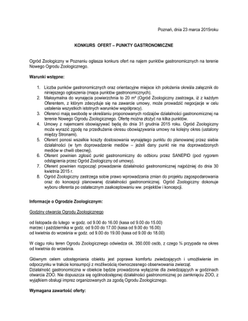 Poznań, dnia 23 marca 2015roku KONKURS OFERT – PUNKTY GASTRONOMICZNE Ogród Zoologiczny w Poznaniu ogłasza konkurs ofert na najem punktów gastronomicznych na terenie Nowego Ogrodu Zoologicznego. Warunki wstępne: 1. Liczba punków gastronomicznych oraz orientacyjne miejsce ich położenia określa załącznik do niniejszego ogłoszenia (mapa punktów gastronomicznych). 2. Maksymalna do wynajęcia powierzchnia to 20 m² (Ogród Zoologiczny zastrzega, iż z każdym Oferentem, z którym zdecyduje się na zawarcie umowy, może prowadzić negocjacje w celu ustalenia wszystkich istotnych warunków współpracy). 3. Oferenci mają swobodę w określaniu proponowanych rodzajów działalności gastronomicznej na terenie Nowego Ogrodu Zoologicznego. Ofertę można złożyć na kilka punktów. 4. Umowy z najemcami obowiązywać będą do dnia 31 grudnia 2015 roku. Ogród Zoologiczny może wyrazić zgodę na przedłużenie okresu obowiązywania umowy na kolejny okres (ustalony między Stronami). 5. Oferent ponosi wszelkie koszty dostosowania wynajętego punktu do planowanej przez siebie działalności (w tym doprowadzenie mediów – jeżeli dany punkt nie ma doprowadzonych mediów w chwili obecnej). 6. Oferent powinien zgłosić punkt gastronomiczny do odbioru przez SANEPID (pod rygorem odstąpienia przez Ogród Zoologiczny od umowy). 7. Oferent powinien rozpocząć prowadzenie działalności gastronomicznej najpóźniej do dnia 30 kwietnia 2015 r. 8. Ogród Zoologiczny zastrzega sobie prawo wprowadzania zmian do projektu zagospodarowania oraz do koncepcji planowanej działalności gastronomicznej. Ogród Zoologiczny dokonuje wyboru oferenta po ostatecznym zaakceptowaniu ww. projektów i koncepcji. Informacje o Ogrodzie Zoologicznym: Godziny otwarcia Ogrodu Zoologicznego od listopada do lutego w godz. od 9.00 do 16.00 (kasa od 9.00 do 15.00) marzec i października w godz. od 9.00 do 17.00 (kasa od 9.00 do 16.00) od kwietnia do września w godz. od 9.00 do 19.00 (kasa od 9.00 do 18.00) W ciągu roku teren Ogrodu Zoologicznego odwiedza ok. 350.000 osób, z czego ¾ przypada na okres od kwietnia do września. Głównym celem udostępniania obiektu jest poprawa komfortu zwiedzających i umożliwienie im odpoczynku w trakcie konsumpcji z możliwością równoczesnego obserwowania zwierząt. Działalność gastronomiczna w obiekcie będzie prowadzona wyłącznie dla zwiedzających w godzinach otwarcia ZOO. Nie dopuszcza się ogólnodostępnej działalności gastronomicznej po zamknięciu ZOO, z wyjątkiem obsługi imprez organizowanych za zgodą Ogrodu Zoologicznego. Wymagana zawartość oferty: 1. Projekt / koncepcja zagospodarowania obiektu zawierająca: szkic części usługowej i zaplecza, aranżację wnętrz (meble, urządzenia, itp.), listę urządzeń z określeniem typu i opisem. 2. Opis planowanej działalności gastronomicznej na terenie Ogrodu Zoologicznego, z informacją o charakterze planowanej działalności, koncepcji w zakresie świadczonych usług gastronomicznych, menu wraz z orientacyjnymi cenami. UWAGA! Przedstawiając powyższy dokument oferent zobowiązuje się do świadczenia usług w opisanym zakresie lub ustalonym z Ogrodem Zoologicznym (możliwość zmiany ustalonego zakresu istnieje wyłącznie za zgodą Ogrodu Zoologicznego). 3. Oferowaną miesięczną cenę najmu brutto. UWAGA! Oferowana cena najmu nie obejmuje płatności z tytułu wywozu nieczystości – wywóz we własnym zakresie, podatku od nieruchomości oraz zużycia wody ciepłej i zimnej oraz energii elektrycznej, które będą rozliczane zgodnie z wskazaniem liczników, a także instalacji nowych podliczników. Informacje dodatkowe: 1. Do umowy oferent zobowiązany jest przedłożyć dokument potwierdzający, iż jest ubezpieczony od odpowiedzialności cywilnej OC na kwotę 20.000,00 zł (słownie: dwadzieścia tysięcy złotych) do dnia 31 grudnia 2015 roku. W przypadku nie przedłożenia ww. dokumentu Ogród Zoologiczny może odstąpić od podpisania umowy. 2. Mapę punktów gastronomicznych można ściągnąć ze strony internetowej www.zoo.poznan.pl – zakładka informacje – link informacje o przetargach lub odebrać w sekretariacie Ogrodu Zoologicznego, ul. Browarna 25, Poznań, w godzinach od 8.00 do 14.00. 3. Oferty należy składać w zamkniętych kopertach do dnia 10 kwietnia 2015 r. do godziny 10.00 w sekretariacie Ogrodu Zoologicznego, ul. Browarna 25, Poznań. Koperty należy opisać nazwą i danymi adresowymi oferenta oraz napisem „KONKURS – PUNKTY GASTRONOMICZNE”. 4. O wynikach konkursu oferenci zostaną powiadomieni na piśmie do dnia 15 kwietnia 2015 r. 5. Dyrekcja Ogrodu Zoologicznego zastrzega sobie prawo do unieważnienia konkursu bez podania przyczyny. 6. Kryteria oceny ofert: 1. Zaoferowana cena – 60 %; 2. Projekt / koncepcja zagospodarowania obiektu – 20 %; 3. Opis planowanej działalności gastronomicznej – 20 %. Dyrektor Ogrodu Zoologicznego