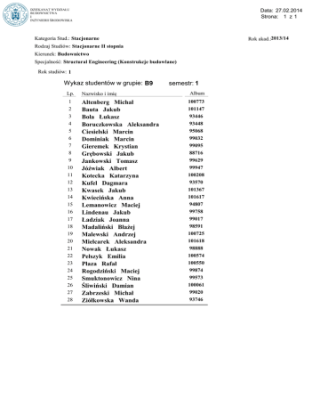 Data: 27.02.2014 Strona: 1 z 1 Rok akad.:2013/14 Kategoria Stud.: Stacjonarne Rodzaj Studiów: Stacjonarne II stopnia Kierunek: Budownictwo Specjalność: Structural Engineering (Konstrukcje budowlane) Rok studiów: 1 Wykaz studentów w grupie: B9 Lp. Nazwisko i imię 1 2 3 4 5 6 7 8 9 10 11 12 13 14 Altenberg Michał Bauta Jakub Bola Łukasz Boruczkowska Aleksandra Ciesielski Marcin Dominiak Marcin Gieremek Krystian Grębowski Jakub Jankowski Tomasz Jóźwiak Albert Kotecka Katarzyna Kufel Dagmara Kwasek Jakub Kwiecińska Anna Lemanowicz Maciej Lindenau Jakub Ładziak Joanna Madaliński Błażej Malewski Andrzej Mielcarek Aleksandra Nowak Łukasz Pełszyk Emilia Płaza Rafał Rogodziński Maciej Smuktonowicz Nina Śliwiński Damian Zabrzeski Michał Ziółkowska Wanda 15 16 17 18 19 20 21 22 23 24 25 26 27 28 semestr: 1 Album 100773 101147 93446 93448 95068 99032 99095 88716 99629 99947 100208 93570 101367 101617 94807 99758 99017 98591 100725 101618 98888 100574 100550 99874 99573 100061 99020 93746