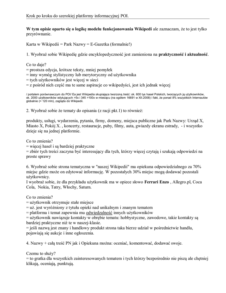 Krok po kroku do szerokiej platformy informacyjnej POI. W tym opisie oparto się o logikę modelu funkcjonowania Wikipedi ale zaznaczam, że to jest tylko przyrównanie. Karta w Wikipedii = Park Nazwy = E-Gazetka (formalnie!) 1. Wyobraź sobie Wikipedię gdzie encyklopedyczność jest zamieniona na praktyczność i aktualność. Co to daje? = prostsza edycja, krótsze teksty, mniej pomyłek = inny wymóg stylistyczny lub merytoryczny od użytkownika = tych użytkowników jest więcej w sieci = z pośród nich część ma te same aspiracje co wikipedyści, jest ich jednak więcej / portalem porównawczym do POI/ Ea jest Wikipedia skupiająca tworzoną treść: ok. 600 tys haseł Polskich, tworzących ją użytkowników, ok. 2000 użytkowników edytujących >5x i 345 >100x w miesiącu (na ogółem 16691 w XII.2008) i fakt, że ponad 8% wszystkich Internautów globalnie (= 120 mln), zagląda do Wikipedii. 2. Wyobraź sobie że tematy do opisania (z racji pkt.1) to również: produkty, usługi, wydarzenia, pytania, firmy, domeny, miejsca publiczne jak Park Nazwy: Urząd X, Miasto X, Pokój X. , koncerty, restauracje, puby, filmy, auta, gwiazdy ekranu estrady, - i wszystko dzieje się na jednej platformie. Co to zmienia? = więcej haseł i są bardziej praktyczne = zbiór tych treści zaczyna być interesujący dla tych, którzy więcej czytają i szukają odpowiedzi na proste sprawy 6. Wyobraź sobie strona tematyczna w "naszej Wikipedii" ma opiekuna odpowiedzialnego za 70% miejsc gdzie może on edytować informację. W pozostałych 30% miejsc mogą dodawać pozostali użytkownicy. I wyobraź sobie, że dla przykładu użytkownik ma w opiece słowo Ferrari Enzo , Allegro.pl, Coca Cola, Nokia, Tatry, Włochy, Saturn. Co to zmienia? = użytkownik otrzymuje stałe miejsce = uż. jest wyróżniony z tytułu opieki nad unikalnym i znanym tematem = platforma i temat zapewnia mu odwiedzalność innych użytkowników = użytkownik nawiązuje kontakty w obrębie tematu: hobbystyczne, zawodowe, takie kontakty są bardziej praktyczne niż te w naszej-klasie. = jeśli nazwą jest znany i handlowy produkt strona taka bierze udział w pośrednictwie handlu, pojawiają się aukcje i inne ogłoszenia. 4. Nazwy + całą treść PN jak i Opiekuna można: oceniać, komentować, dodawać swoje. Czemu to służy? = to gratka dla wszystkich zainteresowanych tematem i tych którzy bezpośrednio nie piszą ale chętniej klikają, oceniają, punktują. Krok po kroku do szerokiej platformy informacyjnej POI. = tworzy się platforma oceny produktów, usług, firm = niektórzy korzystają z tej wiedzy zanim dokonają zakupu, skorzystają z usługi = biznes jest zainteresowany takimi informacjami i zapłaci za nie a docelowo zareaguję poprawą produktu. 5. Wyobraź sobie że zarówno kliknięcia jak i wpisy użytkowników są punktowane (jak punkty na stacji benzynowej lub w sklepie) a punktacja przekłada się na: - hierarchię i uprawnienia w portalu - wygraną w konkursie - nagrodę rzeczową - doładowanie telefonu - pieniądze Co to ułatwia? = użytkownik jest motywowany do tych działań = treści przybywa szybciej = treść jest oceniona i skorygowana dlatego = taka treść jest jeszcze bardziej interesująca dla przeciętnego Internauty, który tylko szuka treści 6. Wyobraź sobie że do "naszej Wikipedii" na strony tematyczne wpuszczasz reklamę. Co to daje biznesowi pragnącemu się skontaktować z użytkownikiem? = reklama jest kontekstowa: linki, teksty sponsorowane (oddzielnie) reklama multimedialna = użytkownik zostaje wyselekcjonowany miejscem, w którym przebywa i lub którym się zajmuje. = rizomatyczny charakter portalu pozwala towarzyszyć reklamodawcy krok po kroku jak porusza się użytkownik w głąb tematu szukając coraz szczegółowszych informacji. A nawet towarzyszyć mu do zewnętrznego portalu z którym współpracujemy – i gdzie nie musi się logować ponownie. 7. i na koniec wyobraź sobie że jesteś autorem ciekawych zdjęć z jakiegoś miejsca, artykułu lub bloga na jakiś temat, nakręciłeś film o czymś, zebrałeś informacje na jakiś temat z sieci przy okazji pracy do szkoły, zbudowałeś nowy skrypt lub program - i właśnie go opublikowałeś gdzieś w sieci. Czy nowy portal może Tobie w czymś pomóc? = wystarczy że wkleisz link do miejsca, w którym opublikowałeś Informację do Parku Nazwy, który już istnieje (lub nie istnieje – ty go utworzysz jednym kliknięciem) i jest tam spora ilość zainteresowanych tematem. = pozyskujesz opinię = pozyskujesz kontakty = może wygrasz jakąś nagrodę, nauczysz się czegoś od innych = oni mają narzędzia by ocenić, skomentować, których może braknąć w miejscu gdzie opublikowałeś informację = powstaje platforma odniesienia do wszystkich ciekawych miejsc w necie = to samo dzieje się w innych językach Krok po kroku do szerokiej platformy informacyjnej POI. = interfejs jest ten sam, tylko język się zmienia, automaty i ludzie go łatwiej przetłumaczą Istnieją poglądy na temat Internetu: >W necie jest wszystko i wstrzelić sie można jedynie w wąski, specjalistyczny sektor, z konieczności >możliwie w pełni zautomatyzowany. nie ma miejsca, czasu i pieniędzy na czynnik ludzki." Idziemy w drugim kierunku, sięgamy bardzo szeroko. Opieramy się na człowieku i na sile Mas dlatego nie będzie tak drogo. Ale mamy szansę być jedynymi. Naszym wąskim sektorem jest postawienie wszystkich funkcjonalności portalu POI pod użytkowinika. Nie do końca przywiązujemy uwagę do budowanej treści – mimo to zaimplementujemy narzędzia do jej oceny. Dużo ważniejszy jest użytkownik ze swoimi różnorodnymi perspektywami rozumienia świata i czytanej treści. Staramy się zaspokoić coś więcej jak tylko dostęp do informacji. Użytkownik chce być widoczny (jako nr. 1 w sieci), chce być wyróżniony z tytułu hasła, którym się zajmuje (Ferrari Enzo, Nokia, Morze Bałtyckie), chce mieć swoich użytkowników it