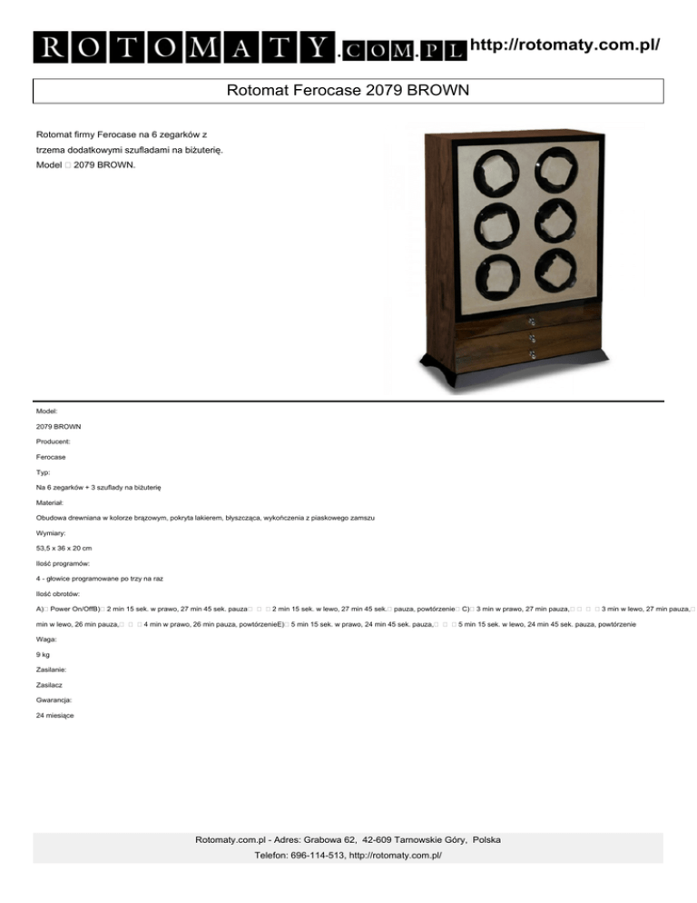 http://rotomaty.com.pl/ Rotomat Ferocase 2079 BROWN Rotomat firmy Ferocase na 6 zegarków z trzema dodatkowymi szufladami na biżuterię. Model 2079 BROWN. Model: 2079 BROWN Producent: Ferocase Typ: Na 6 zegarków + 3 szuflady na biżuterię Materiał: Obudowa drewniana w kolorze brązowym, pokryta lakierem, błyszcząca, wykończenia z piaskowego zamszu Wymiary: 53,5 x 36 x 20 cm Ilość programów: 4 - głowice programowane po trzy na raz Ilość obrotów: A) Power On/OffB) 2 min 15 sek. w prawo, 27 min 45 sek. pauza 2 min 15 sek. w lewo, 27 min 45 sek. pauza, powtórzenie C) 3 min w prawo, 27 min pauza, 3 min w lewo, 27 min pauza, min w lewo, 26 min pauza, 4 min w prawo, 26 min pauza, powtórzenieE) 5 min 15 sek. w prawo, 24 min 45 sek. pauza, 5 min 15 sek. w lewo, 24 min 45 sek. pauza, powtórzenie Waga: 9 kg Zasilanie: Zasilacz Gwarancja: 24 miesiące Rotomaty.com.pl - Adres: Grabowa 62, 42-609 Tarnowskie Góry, Polska Telefon: 696-114-513, http://rotomaty.com.pl/ http://rotomaty.com.pl/ Rotomaty.com.pl - Adres: Grabowa 62, 42-609 Tarnowskie Góry, Polska Telefon: 696-114-513, http://rotomaty.com.pl/