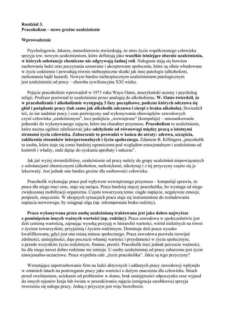 Rozdział 3. Pracoholizm – nowe groźne uzależnienie Wprowadzenie Psychologowie, lekarze, menedżerowie stwierdzają, że stres życia współczesnego człowieka sprzyja tzw. nowym uzależnieniom, które definiują jako wszelkie istniejące obecnie uzależnienia, w których substancje chemiczne nie odgrywają żadnej roli. Nałogiem stają się bowiem zachowania ludzi oraz poczynania uznawane i akceptowane społecznie, które są silnie wbudowane w życie codzienne i powodują równie niebezpieczne skutki jak inne patologie (alkoholizm, narkomania bądź hazard). Nowym bardzo niebezpiecznym uzależnieniem patologicznym jest uzależnienie od pracy – choroba cywilizacyjna XXI wieku. Pojęcie pracoholizm wprowadził w 1971 roku Wayn Oates, amerykański uczony i psycholog religii. Profesor porównał to uzależnienie przez analogię do alkoholizmu. W. Oates twierdził, że w pracoholizmie i alkoholizmie występują 3 fazy początkowe, podczas których odczuwa się głód i pożądanie pracy (tak samo jak alkoholik odczuwa i cierpi z braku alkoholu). Stwierdził też, że nie nadmiar pracy i czas poświęcony nad wykonywanie obowiązków zawodowych czyni człowieka „uzależnionym”, lecz podejście „wewnętrzne” (kompulsja) – ustosunkowanie jednostki do wykonywanego zajęcia, które ma charakter przymusu. Pracoholizm to uzależnienie, które można ogólnie zdefiniować jako odchylenie od równowagi między pracą a istotnymi stronami życia człowieka. Zaburzenie to prowadzi w końcu do utraty: zdrowa, szczęścia, zakłócenia stosunków interpersonalnych i życia społecznego. Zdaniem B. Killingera „pracoholik to osoba, która staje się coraz bardziej ograniczona pod względem emocjonalnym i uzależniona od kontroli i władzy, stale dążąc do zyskania aprobaty i sukcesu”. Jak już wyżej stwierdziliśmy, uzależnienie od pracy należy do grupy uzależnień niepowiązanych z substancjami chemicznymi (alkoholem, narkotykami, nikotyną) i z tej przyczyny często się je lekceważy. Jest jednak ono bardzo groźne dla osobowości człowieka. Pracoholik wykonując prace pod wpływem wewnętrznego przymusu – kompulsji sprawia, że praca dla niego traci sens, staje się nużąca. Praca bardziej męczy pracoholika, bo wymaga od niego zwiększonej mobilizacji organizmu. Często towarzyszą temu: ciągłe napięcie, negatywne emocje, pośpiech, zmęczenie. W skrajnych sytuacjach praca staje się instrumentem do rozładowania napięcia nerwowego, by osiągnąć ulgę (np. rekompensata braku rodziny). Praca wykonywana przez osobę uzależnioną traktowana jest jako dobro najwyższe z pominięciem innych ważnych wartości (np. rodziny). Praca zawodowa w społeczeństwie jest dziś cenioną wartością, zajmując wysoką pozycję w hierarchii wartości, wśród niektórych na równi z życiem towarzyskim, przyjaźnią i życiem rodzinnym. Dominuje dziś praca wysoko kwalifikowana, gdyż jest ona miarą statusu społecznego. Praca zawodowa pozwala rozwijać zdolności, umiejętności, daje poczucie własnej wartości i przydatności w życiu społecznym, a przede wszystkim życiu rodzinnym, finanse, prestiż. Pracoholik traci jednak poczucie ważności, bo dla niego nawet dobro rodzinne nie istnieje. U osoby uzależnionej od pracy zaburzone jest życie emocjonalno-uczuciowe. Praca wypełnia całe „życie pracoholika”. Jakie są tego przyczyny? Wzrastające zapotrzebowanie firm na ludzi aktywnych i oddanych pracy zawodowej wpłynęło w ostatnich latach na postrzeganie pracy jako wartości o dużym znaczeniu dla człowieka. Strach przed zwolnieniem, uciekanie od problemów w domu, brak umiejętności odpoczynku oraz wyjazd do innych rejonów kraju lub świata w poszukiwaniu zajęcia (emigracja zarobkowa) sprzyja tworzeniu się nałogu pracy. Jedną z przyczyn jest więc bezrobocie. Pracoholikami są zwykle osoby pilne, perfekcyjne, ale i niepewne siebie, nieśmiałe, niedowartościowane, bojące się otoczenia. Często są to osoby ambitne, lubiące rywalizować i wygrywać, które wysoko stawiają sobie poprzeczkę, za wszelką cenę dążą do osiągnięcia sukcesu i prestiżu społecznego. Z drugiej zaś strony podchodzące niejednokrotnie z obawą do własnego talentu, spontaniczności czy fantazji. Człowiek uciekając od konfliktowych sytuacji np. w rodzinie, powodowanych przez siebie lub innych, może popaść w pracoholizm, którego etiologia jest podobna do innych uzależnień (o czym już wspomniałem). Wielu psychologów, filozofów, etyków pedagogów zgodnie stwierdza, że praca zawodowa jest cenioną wartością i zajmuje wysoką pozycję w hierarchii wartości ludzi na równi z życiem rodzinnym, przyjaźnią i sprawami materialnymi. Praca jest treścią życia wszystkich „zdrowych ludzi”, poprzez pracę ludzie się sami definiują, określają swoje miejsce w społeczeństwie, rozwijają swoje możliwości, czerpią z niej satysfakcję oraz poczucie sprawstwa (radzenia sobie z problemami). O tym, jak ważna jest praca dla człowieka świadczy fakt, że wraz z jej pozbawieniem (emerytura, bezrobocie) jednostka traci poczucie bezpieczeństwa, wewnętrznej integracji. Jednak w pracoholizmie praca zawodowa staje się najważniejsza, „ponad wszystko”, co jest patologią (cierpieniem). Zjawisko pracoholizmu wzbudza coraz więcej zainteresowania. Interesują się nim klinicyści, którzy badają jego negatywne skutki, a także praktycy patrzący z perspektywy potencjalnych korzyści i zagrożeń firmy. Jednak wciąż brakuje systematycznych badań, pozwalających głębiej poznać to zjawisko i wprowadzić rzetelne uogólnienie. Próba oceny pracoholizmu wymaga uwzględnienia jego złożoności i stosowania osobnych kryteriów oceny dla różnych typów pracoholizmu. Obok karoshi (Japonia) – śmierci z przepracowania, mamy bowiem niewątpliwe społeczne korzyści ze wzrostu przedsiębiorczości, do którego pewnością przyczyniają się pracoholicy zorientowa