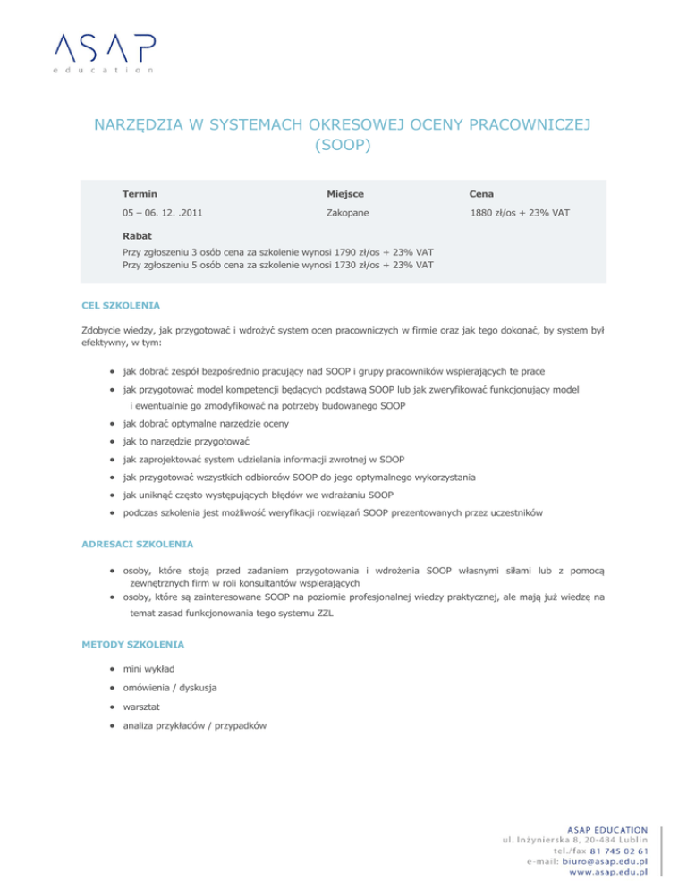NARZĘDZIA W SYSTEMACH OKRESOWEJ OCENY PRACOWNICZEJ (SOOP) Termin Miejsce Cena 05 – 06. 12. .2011 Zakopane 1880 zł/os + 23% VAT Rabat Przy zgłoszeniu 3 osób cena za szkolenie wynosi 1790 zł/os + 23% VAT Przy zgłoszeniu 5 osób cena za szkolenie wynosi 1730 zł/os + 23% VAT CEL SZKOLENIA Zdobycie wiedzy, jak przygotować i wdrożyć system ocen pracowniczych w firmie oraz jak tego dokonać, by system był efektywny, w tym: jak dobrać zespół bezpośrednio pracujący nad SOOP i grupy pracowników wspierających te prace jak przygotować model kompetencji będących podstawą SOOP lub jak zweryfikować funkcjonujący model i ewentualnie go zmodyfikować na potrzeby budowanego SOOP jak dobrać optymalne narzędzie oceny jak to narzędzie przygotować jak zaprojektować system udzielania informacji zwrotnej w SOOP jak przygotować wszystkich odbiorców SOOP do jego optymalnego wykorzystania jak uniknąć często występujących błędów we wdrażaniu SOOP podczas szkolenia jest możliwość weryfikacji rozwiązań SOOP prezentowanych przez uczestników ADRESACI SZKOLENIA osoby, które stoją przed zadaniem przygotowania i wdrożenia SOOP własnymi siłami lub z pomocą zewnętrznych firm w roli konsultantów wspierających osoby, które są zainteresowane SOOP na poziomie profesjonalnej wiedzy praktycznej, ale mają już wiedzę na temat zasad funkcjonowania tego systemu ZZL METODY SZKOLENIA mini wykład omówienia / dyskusja warsztat analiza przykładów / przypadków KORZYŚCI Z UCZESTNICTWA W SZKOLENIU zapoznanie się z licznymi przykładami różnorodnych narzędzi SOOP wraz z analizą ich korzystnych i niekorzystnych rozwiązań zdobycie podstawowej acz praktycznej wiedzy nt. zasad poprawnego przygotowania modelu kompetencji oraz przykładów takich opracowań udział w omówieniu kolejnych kroków w procesie przygotowania kwestionariusza ocen ważonych opartych o ocenę zero-jedynkową oraz możliwość pełnego wykorzystania tego narzędzia lub jego wybranych rozwiązań we własnej praktyce ZZL poznanie rozwiązań umożliwiających bezpośrednie połączenie wyników oceny okresowej z systemami rozwoju pracowników TRENER SZKOLENIA DR KINGA PADZIK - Ekspert w dziedzinie zarządzania zasobami ludzkimi i zarządzania organizacją. Trener i wieloletni konsultant w obszarze rekrutacji, oceny i rozwoju pracowników, projektowania stanowisk oraz organizacji pracy. Swoje doświadczenia i osiągnięcia w zarządzaniu zasobami ludzkimi wykorzystuje realizując autorskie programy szkoleniowe dotyczące dopasowania pracownika do stanowiska pracy, zarządzania kompetencjami, okresowej oceny pracowników oraz planowania rozwoju zawodowego, w tym ścieżek karier itp. Autorka pierwszego na polskim rynku leksykonu z zakresu dziedziny zarządzania zasobami ludzkimi. Potrafi skutecznie zaangażować i skupić uwagę słuchaczy na istotnych dla nich zagadnieniach. PROGRAM SZKOLENIA I. Wprowadzenie miejsce procesu oceny pracowników w całym systemie ZZL i jego znaczenie dla efektywności działań z zakresu zarządzania zasobami ludzkimi funkcje SOOP warunki poprawności i efektywności SOOP rodzaje narzędzi i metod oceny wykorzystywane w SOOP i poza SOOP – różnice i powiązania budowa SOOP – z jakich elementów i procesów składa się SOOP poprawność opracowania wskaźników dla kompetencji i wyników pracy jako kluczowy element efektywnego SOOP II. Powiązanie oceniania pracowników z satysfakcją z pracy, motywacją do pracy, poziomem identyfikacji z organizacją i efektywnością pracy identyfikacja luki kompetencyjnej – realna luka kompetencyjna a efekt braku motywacji zewnętrznej dobór sposobu likwidowania luki kompetencyjnej w zależności od jej źródła III. Przegląd i omówienie praktyk rynkowych w zakresie narzędzi i metod oceny SOOP omówienie niekorzystnych rozwiązań w narzędziach SOOP oraz sposobów na ich uniknięcie lub korektę (np. problem z definicją wskaźników na skalach natężeń) ćwiczenia mają cena celu poprawę wybranych narzędzi 2 IV. Wprowadzenie do metod tworzenia narzędzi SOOP V. Przeanalizowanie na przykładzie dwóch narzędzi oceny kolejnych etapów i założeń koniecznych do przygotowania podstawy SOOP przygotowanie kwestionariusza ocen ważonych opartego na ocenie zero-jedynkowej (bez stosowania skal natężeń); przygotowanie materiału do wersji elektronicznej przygotowanie arkusza oceny z systemem precyzyjnego planowania szkoleń czy systemu wsparcia rozwoju zawodowego VI. Omówienie podstawowych zasad integrowania wyników oceny oraz przygotowania i prowadzenia rozmowy oceniającej w SOOP stosowanie systemu samooceny pracowników – narzędzia samooceny i zasady integrowanie jej z ocena menedżerską rola regulaminu SOOP i podstawowe zasady w nim spisane rola oceny typu 360° jako oceny wspomagającej lub zastępującej SOOP © Copyright 2011 Dr Kinga Padzik SZCZEGÓŁOWY HARMONOGRAM SZKOLENIA Program szkolenia obejmuje 16 godzin dydaktycznych Przyjazd uczestników w dniu poprzedzającym szkolenie (zakwaterowanie od godz. 15.00) I DZIEŃ - zajęcia od godz. 9.00 – 16.00 z przerwami na kawę i obiad II DZIEŃ - zajęcia od godz. 9.00 – 16.00 z przerwami na kawę i obiad Wyjazd uczestników następnego dnia po szkoleniu (zakwaterowanie do godz. 12.00) INFORMACJE DODATKOWE Cena za udział w szkoleniu wynosi 1880 zł/os + 23% VAT Przy zgłoszeniu 3 osób cena za szkolenie wynosi 1790 zł/os + 23% VAT Przy zgłoszeniu 5 osób cena za szkolenie wynosi 1730 zł/os + 23% VAT W ramach szkolenia oferujemy: materiały szkoleniowe zakwaterowanie w pokoju 2 - osobowym (3 doby, przyjazd na kolację w dzień poprzedzający szkolenie, wyjazd po śniadaniu następnego dnia po szkoleniu) pełne wyżywienie oraz przerwy kawowe zaświadczenie o ukończeniu szkolenia integrację profesjonalizm trenera oraz możliwość indywidualnych konsultacji podczas szkolenia profesjonalizm organizatora 3 Dodatkowe opcje: Udział w szkoleniu bez noclegów