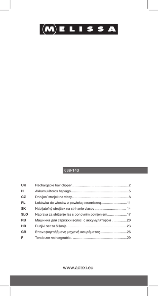 638-143 UK Rechargable hair clipper........................ ....................................2 H Akkumulátoros hajvágó .............................................................5 CZ Dobíjecí strojek na vlasy............................ ................................8 PL Lokówka do włosów z powłoką ceramiczną ...........................11 SK Nabíjateľný strojček na strihanie vlasov ................................. 14 SLO Naprava za striženje las s ponovnim polnjenjem....... .............17 RU Mашинка для стрижки волос c aккyмyлятopoм ................20 HR Punjivi set za šišanje................... ............................................23 GR Επαναφορτιζόμενη μηχανή κουρέματος ............................26 F Tondeuse rechargeable.. .........................................................29 www.adexi.eu UK Please read this instruction manual carefully and familiarise yourself with your new hairtrimmer, before using for the first time. Please retain this manual for future reference. IMPORTANT SAFEGUARDS When using electrical appliances, especially when children are present, basic safety precautions should always be followed, including the following: - Unplug the appliance before cleaning. - Do not place or store appliance where it can fall or be pulled into a tub or sink. - Do not use while bathing or in a shower - Do not place in, or drop into, water or any other liquid. - Do not reach for an appliance that has fallen into water. Unplug immediately. - Use the appliance only for its intended use as described in this manual. Do not use attachments not recommended by the manufacturer. - This appliance should never be left unattended when plugged in. - Close supervision is necessary when this appliance is used by, on, or near children or invalids. - Never operate this appliance if it has a damaged cord or plug, or if it is not working properly. - Keep the cord away from heated surfaces. - Do not pull, twist, or wrap line cord around appliance. - Never drop or insert any object into any opening on this appliance. - Before use, make sure certain blades are aligned properly. - Do not place the appliance on any surface while it is operating. - Do not use this appliance with a damaged or broken comb nor with teeth missing from the blades as injury may occur. CONTENTS OF BOX Hair trimmer unit Charging base Adapter and power feed plug Comb Scissors Oil Brush CHARGING BEFORE USING - Turn switch to 0 position and insert the unit into the charging base. - Insert power feed plug (adapter) into the charging base socket. - Insert adapter plug into outlet. - During charging, the LED indicator lamp lights up. - Charging can only be done with unit switch at 0 position. - After charging, unplug adapter and power feed plugs. - Charging time is 7 hours. 2 - The unit can operate for about 25 mins. after full charge. For charging the hairtrimmer, press the unit into the charger until the light indicator ignites. Be sure that the charger is connected to the outlet. DIRECT-POWERED BY ADAPTOR - The proclipper can also be powered directly by the adapter. - Plug the power feed plug of adapter direct into the unit socket. Then plug the adapter to the proper AC outlet. - Do not operate for more than 25 mins. continuously. Allow the unit to rest for approx. 10 mins. and oil the blades after every 25 mins. of operation, in order to maintain efficient cutting performance. - If the clipper should not run immediately due to a completely empty cell, recharge the trimmer for approx. 1 minute before cord operation. OIL BEFORE USING - Always oil before and after use. Cutting performance deteriorates if cutting blades are not oiled properly. When doing more than one haircut in one session, clean and oil blades once after finishing each cut. - Remove cutting head in direction of arrow. - Apply about 1 to 2 drops of accessory oil at the cutting blades. - Slide back the cutting head to the unit. - Allow the unit to operate without actual cutting for about 10 seconds and wipe off any excess oil. - The oil contains kerosene and is extremely dangerous if swallowed. Keep the oil away from children. - Do no use hair-oil or hair-vax. CONNECTION AND ADJUSTMENT OF ATTACHMENT COMB - The attachment comb has 6-position adjustment, which provides 7,10,13,16,18 and 21 mm. cutting length. - The comb is fixed to the clipper by 2 locks at both sides of the guide groove of attachment. - Push attachment knob upward with finger to set the desired cutting length as shown in the figure. - Press on comb portion of attachment to make sure that it is locked to the body. INSTRUCTIONS FOR HAIR CUTTING - Inspect the clipper, making sure that it is free of oil between the cutting blade teeth and turn the unit on to distribute the oil and to make sure it is running smoothly. Wipe of any excess oil. This should be done after each use. While using the unit, untwist the cord from time to time to avoid tangling. - Seat the person so his/her head is approximately at your eye level. This allows ease of visibility while cutting and a relaxed control of the unit. - Before cutting, always first comb the hair so it is tangle free and as it is naturally worn. - Place a towel around the neck and shoulders of the person having the haircut. 3 REMINDERS - Cut the hair in a relaxed and slow manner. Use short strokes only to work gradually over the entire head. - Always take off a little hair at a time; you can always trim off additional hair later. - As you work, comb the hair frequently back into the style to which you are cutting. - When cutting with this hair clipper it is better to leave the hair dry, not wet. With the hair dry, it is much easier to control the amount of the hair being cut. BEGINNING THE HAIRCUT Cutting hair requires practise so it is always better to leave the hair longer for the first few hair cuts until you become used to the length to which each comb attachment c