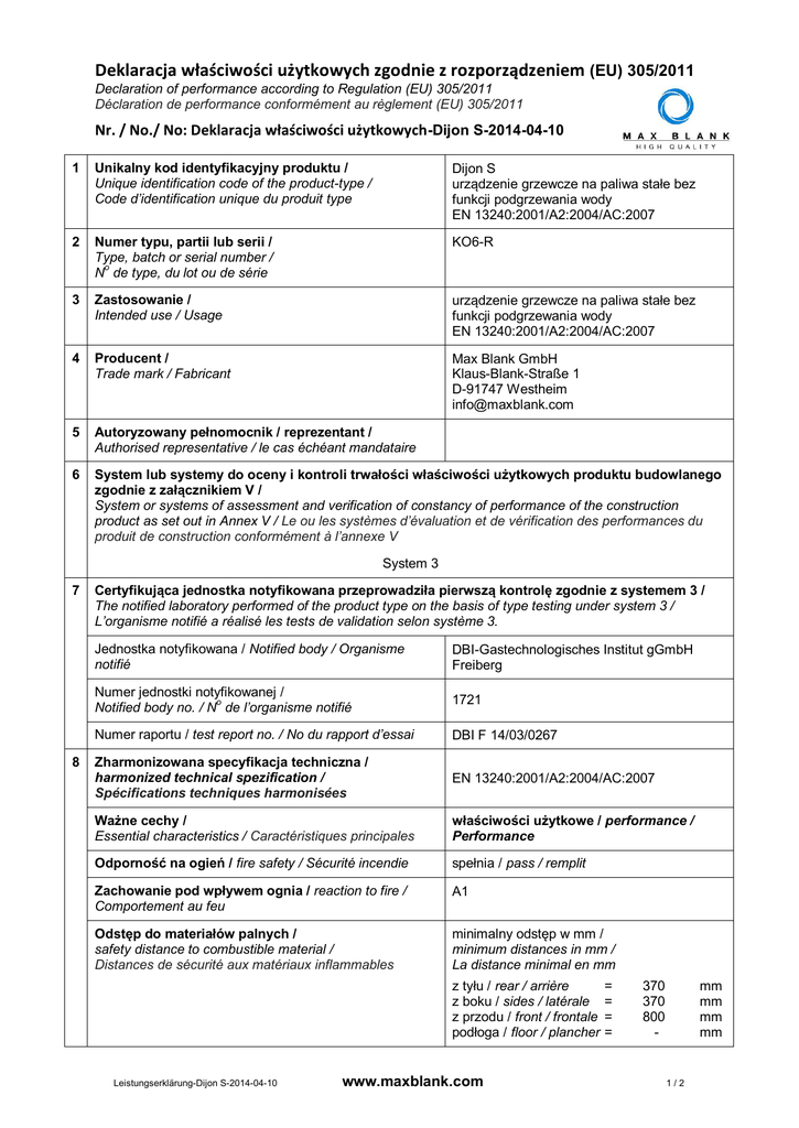 Deklaracja właściwości użytkowych zgodnie z rozporządzeniem (EU) 305/2011 Declaration of performance according to Regulation (EU) 305/2011 Déclaration de performance conformément au règlement (EU) 305/2011 Nr. / No./ No: Deklaracja właściwości użytkowych-Dijon S-2014-04-10 1 Unikalny kod identyfikacyjny produktu / Unique identification code of the product-type / Code d’identification unique du produit type Dijon S urządzenie grzewcze na paliwa stałe bez funkcji podgrzewania wody EN 13240:2001/A2:2004/AC:2007 2 Numer typu, partii lub serii / Type, batch or serial number / No de type, du lot ou de série KO6-R 3 Zastosowanie / Intended use / Usage urządzenie grzewcze na paliwa stałe bez funkcji podgrzewania wody EN 13240:2001/A2:2004/AC:2007 4 Producent / Trade mark / Fabricant Max Blank GmbH Klaus-Blank-Straße 1 D-91747 Westheim [email protected] 5 Autoryzowany pełnomocnik / reprezentant / Authorised representative / le cas échéant mandataire 6 System lub systemy do oceny i kontroli trwałości właściwości użytkowych produktu budowlanego zgodnie z załącznikiem V / System or systems of assessment and verification of constancy of performance of the construction product as set out in Annex V / Le ou les systèmes d’évaluation et de vérification des performances du produit de construction conformément à l’annexe V System 3 7 8 Certyfikująca jednostka notyfikowana przeprowadziła pierwszą kontrolę zgodnie z systemem 3 / The notified laboratory performed of the product type on the basis of type testing under system 3 / L’organisme notifié a réalisé les tests de validation selon système 3. Jednostka notyfikowana / Notified body / Organisme notifié DBI-Gastechnologisches Institut gGmbH Freiberg Numer jednostki notyfikowanej / Notified body no. / No de l’organisme notifié 1721 Numer raportu / test report no. / No du rapport d’essai DBI F 14/03/0267 Zharmonizowana specyfikacja techniczna / harmonized technical spezification / Spécifications techniques harmonisées EN 13240:2001/A2:2004/AC:2007 Ważne cechy / Essential characteristics / Caractéristiques principales właściwości użytkowe / performance / Performance Odporność na ogień / fire safety / Sécurité incendie spełnia / pass / remplit Zachowanie pod wpływem ognia / reaction to fire / Comportement au feu A1 Odstęp do materiałów palnych / safety distance to combustible material / Distances de sécurité aux matériaux inflammables minimalny odstęp w mm / minimum distances in mm / La distance minimal en mm z tyłu / rear / arrière z boku / sides / latérale z przodu / front / frontale podłoga / floor / plancher Leistungserklärung-Dijon S-2014-04-10 www.maxblank.com = = = = 370 370 800 - mm mm mm mm 1/2 Niebezpieczeństwo pożaru spowodowane wypadnięciem palących się części opału / risk of burning fuelfalling out / Risque d'incendie dû à la chute de combustible allumé spełnia / pass / remplit Możliwość wyczyszczenia / cleanability / Facilité d‘entretien spełnia / pass / remplit Emisja produktów spalania / emission of combustion products / Emission de produits de combustion 1072 mg/m³ Temperatura powierzchni / surface temperature / Température de surface spełnia / pass / remplit Bezpieczeństwo elektryczne / electrical safety / Sécurité électrique spełnia / pass / remplit Uwalnianie się substancji niebezpiecznych / Release of dangerous substance / Emission de substances dangéreuses nie stwierdzono żadnych / NPD / RAS Max ciśnienie robocze /max. operation pressure / / Emission de substances dangéreuses - - bar Temperatura spalin przy znamionowej wydajności cieplnej / flue gas temperature at nominal heat output / Température des fumées à la puissance nominale 265 °C Wytrzymałość mechaniczna (w celu udźwignięcia komina) / mechanical resistance (to carry a a chimney/flue) / Résistance mécanique (pour supporter un conduit) nieoznaczona / NPD / RAS Wydajność cieplna / thermal output / Performance calorifique Znamionowa wydajność cieplna / nominal heat output / Puissance nominale 8,5 kW Wydajność grzewcza / room heating output / Puissance calorifique 8,5 kW Wydajność podgrzewania wody / water heating output / Puissance chauffage eau - - kW Skuteczność / efficiency / Rendement Ƞ 81,4 % Trwałość / durability / durabilité 9 spełnia / pass / remplit Wydajność produktu zgodnie z nr. 1 i 2 jest zgodna z deklarowaną wydajnością wg nr 8. / The performance of the product identified in points 1 and 2 is in conformity with the declared performance in point 8 / La performance du produit conformément aux paragraphes 1 et 2 correspond à la performùance déclarée au point 8. Odpowiedzialny za sporządzenie tej deklaracji właściwości użytkowych produktu jest sam producent, zgodnie z danymi podanymi w nr 4. / This declaration of performance is issued under the sole responsibility of the manufacturer identified in point 4 / Seul le fabricant visé à l’alinea 4 est responsable de la réalisation de cette déclaration des performances.. W imieniu producenta podpisał / signed on behalf of the manufacturer / Signé pour le fabricant Thomas Blank, Kierownik Produkcji Nazwisko, stanowisko / name and function / Nom et fonction Westheim, 20.05.2015 Miejscowość, data / place and date of issue / Lieu et date podpis / signature / signature Leistungserklärung-Dijon S-2014-04-10 www.maxblank.com 2/2
