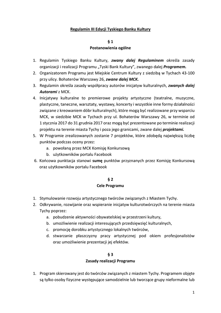Regulamin III Edycji Tyskiego Banku Kultury §1 Postanowienia ogólne 1. Regulamin Tyskiego Banku Kultury, zwany dalej Regulaminem określa zasady organizacji i realizacji Programu „Tyski Bank Kultury”, zwanego dalej Programem. 2. Organizatorem Programu jest Miejskie Centrum Kultury z siedzibą w Tychach 43-100 przy ulicy. Bohaterów Warszawy 26, zwane dalej MCK. 3. Regulamin określa zasady współpracy autorów inicjatyw kulturalnych, zwanych dalej Autorami z MCK. 4. Inicjatywy kulturalne to premierowe projekty artystyczne (teatralne, muzyczne, plastyczne, taneczne, warsztaty, wystawy, koncerty i wszystkie inne formy działalności związane z kreowaniem dóbr kulturalnych), które mogą być realizowane przy wsparciu MCK, w siedzibie MCK w Tychach przy ul. Bohaterów Warszawy 26, w terminie od 1 stycznia 2017 do 31 grudnia 2017 oraz mogą być prezentowane po terminie realizacji projektu na terenie miasta Tychy i poza jego granicami, zwane dalej projektami. 5. W Programie zrealizowanych zostanie 7 projektów, które zdobędą największą liczbę punktów podczas oceny przez: a. powołaną przez MCK Komisję Konkursową b. użytkowników portalu Facebook 6. Końcowa punktacja stanowi sumę punktów przyznanych przez Komisję Konkursową oraz użytkowników portalu Facebook §2 Cele Programu 1. Stymulowanie rozwoju artystycznego twórców związanych z Miastem Tychy. 2. Odkrywanie, rozwijanie oraz wspieranie inicjatyw kulturotwórczych na terenie miasta Tychy poprzez: a. pobudzenie aktywności obywatelskiej w przestrzeni kultury, b. umożliwienie realizacji interesujących przedsięwzięć kulturalnych, c. promocję dorobku artystycznego lokalnych twórców, d. stwarzanie płaszczyzny pracy artystycznej pod okiem profesjonalistów oraz umożliwienie prezentacji jej efektów. §3 Zasady realizacji Programu 1. Program skierowany jest do twórców związanych z miastem Tychy. Programem objęte są tylko osoby fizyczne występujące samodzielnie lub tworzące grupy nieformalne lub 1 koła zainteresowań działające na terenie Miasta Tychy i Gminy Tychy. Program nie obejmuje uczestnictwa osób prawnych lub takich jak w szczególności: stowarzyszenia, szkoły, grupy formalne. 2. Autorów nie obowiązują limity wiekowe, jednak udział osoby nie posiadającej pełnej zdolności do czynności prawnych (osoby nieletniej, małoletniej) wymaga pisemnej zgody przedstawicieli ustawowych (rodziców/opiekunów prawnych), której wzór stanowi załącznik do formularza zgłoszeniowego. 3. Każdy Autor zainteresowany uczestnictwem w Programie wypełnia formularz zgłoszeniowy dostępny na stronie www.tbk.kultura.tychy.pl, w którym szczegółowo opisuje swój projekt kulturalny. 4. Program będzie realizowany w terminie od 7 listopada 2016 do 31 grudnia 2017 roku. 5. Autorzy zgłoszeń zakwalifikowanych do Programu w okresie realizacji swojego projektu będą mogli korzystać z pomocy merytorycznej i organizacyjnej zapewnianej przez MCK. Pomoc merytoryczna będzie związana z udzielaniem wsparcia przez pracowników MCK oraz udzielaniem konsultacji artystycznej. Pomoc organizacyjna będzie wiązała się z zapewnieniem Autorowi możliwości realizacji projektu. Przy czym, MCK zastrzega sobie wyłączne prawo przeprowadzania procedur związanych z zakupem materiałów lub wyborem podmiotów realizujących na zlecenie MCK wszelkie usługi niezbędne do wykonania projektu, w tym w szczególności prawo do zawierania i negocjowania umów z tymi podmiotami. MCK dopuszcza możliwość aby wybór i zakup materiałów na które uzyskano dofinansowanie został dokonany zgodnie z sugestiami Autora. 6. MCK po wyborze projektu dopuszcza możliwość uwzględnienia sugestii Autora w zakresie realizacji części zleconych czynności w celu realizacji projektu przez wskazane przez niego podmioty. Jednak ostateczne prawo wyboru podmiotu w tym przypadku należy do MCK. 7. MCK zastrzega sobie również prawo do wyboru i zaakceptowania ostatecznych warunków i formy promocji projektu uzgodnionej wspólnie z Autorem. 8. MCK zastrzega sobie również prawo własności do wszystkich zakupionych na potrzeby realizacji projektu środków lub materiałów. MCK dopuszcza możliwość przeniesienia na Autora prawa własności do przedmiotów stworzonych lub wykonanych z zakupionych przez MCK środków. 9. Regulamin dopuszcza możliwość uczestnictwa specjalistów i pokrywania w ramach przyznanych środków kosztów ich uczestnictwa w projekcie na zasadach wynikających z regulaminu i Statutu MCK nadanego uchwałą Rady Miasta Tychy z dnia 15 grudnia 2005 r. Przy czym MCK zastrzega sobie prawo do decydowaniu o konieczności i potrzebie udziału takich specjalistów w celu realizacji projektu. 10. Regulamin nie dopuszcza możliwości wprowadzania do obrotu (w szczególności sprzedaży) egzemplarzy dzieł lub utworów stworzonych w ramach realizacji danego projektu. Naruszenie przez Autora niniejszego postanowienia skutkować będzie obowiązkiem zwrotu wszystkich przyznanych Autorowi przez MCK środków 2 dofinansowania projektu. Regulamin dopuszcza możliwość rozpowszechniania wytworzonych w ramach projektu egzemplarzy dzieł związanych z promocją Autora oraz programu Tyski Bank Kultury. 11. MCK sfinansuje realizację każdego projektu zakwalifikowanego do Programu w kwocie do 6000 zł brutto, przy czym kwota dofinansowania obejmuje również koszty promocji projektu. Na kwotę 6000 zł brutto składa się kwota 5000 zł brutto, która będzie przeznaczona na pokrycie kosztów realizacji projektu oraz kwota 1000 zł brutto, która będzie przeznaczona na promocję projektu. MCK w uzasadnionych przypadkach dopuszcza możliwość innego podziału kwot o których mowa powyżej, przy czym kwota przeznaczona na promocję nie może przekroczyć połowy z kwoty 6000 zł brutto. 12. MCK zastrzega sobie prawo do przyznania wyższej kwoty dofinansowania projektu ponad kwotę 6000 zł brutto tylko w przypadku projektu prezentują