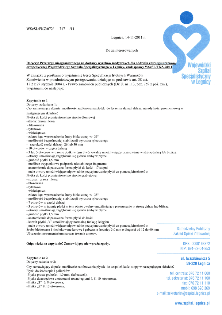 WSzSL/FKZ/072/ 717 /11 Legnica, 14-11-2011 r. Do zainteresowanych Dotyczy: Przetargu nieograniczonego na dostawy wyrobów medycznych dla oddziału chirurgii urazowoortopedycznej Wojewódzkiego Szpitala Specjalistycznego w Legnicy, znak sprawy WSzSL/FKZ-78/11 W związku z prośbami o wyjaśnienie treści Specyfikacji Istotnych Warunków Zamówienia w przedmiotowym postępowaniu, działając na podstawie art. 38 ust. 1 i 2 z 29 stycznia 2004 r. - Prawo zamówień publicznych (Dz.U. nr 113, poz. 759 z póź. zm.), wyjaśniam, co następuje: Zapytanie nr 1 Dotyczy zadania nr 1: Czy zamawiający dopuści możliwość zaoferowania płytek do leczenia złamań dalszej nasady kości promieniowej w następującym składzie: Płytka do kości promieniowej po stronie dłoniowej -strona: prawa i lewa - blokowana - tytanowa - wielokątowa - zakres kąta wprowadzenia śruby blokowanej +/- 35º - możliwość bezpośredniej stabilizacji wyrostka rylcowatego - szerokość części dalszej: 26 lub 30 mm - 10 otworów w części dalszej - 3 lub 5 otworów w trzonie płytki w tym otwór owalny umożliwiający przesuwanie w stronę dalszą lub bliższą - otwory umożliwiają zagłębienie się główki śruby w płytce - grubość płytki 1,5 mm - możliwe trzypunktowe podparcie niestabilnego fragmentu - anatomicznie dopasowana forma płytki do kości -17 stopni - małe otwory umożliwiające odpowiednie pozycjonowanie płytki za pomocą kirschnerów Płytka do kości promieniowej po stronie grzbietowej - strona: prawa i lewa - blokowana - tytanowa - wielokątowa - zakres kąta wprowadzenia śruby blokowanej +/- 35º - możliwość bezpośredniej stabilizacji wyrostka rylcowatego - 7 otworów w części dalszej - 3 otworów w trzonie płytki w tym otwór owalny umożliwiający przesuwanie w stronę dalszą lub bliższą - otwory umożliwiają zagłębienie się główki śruby w płytce - grubość płytki 1,5 mm - anatomicznie dopasowana forma płytki do kości - kształt płytki „Y” umożliwiający normalną funkcję ścięgien - małe otwory umożliwiające odpowiednie pozycjonowanie płytki za pomocą kirschnerów Śruby blokowane i nieblokowane korowe i gąbczaste średnicy 3,0 mm o długości od 12 do 60 mm Użyczenie instrumentarium na czas trwania umowy. Odpowiedź na zapytanie: Zamawiający nie wyraża zgody. Zapytanie nr 2 Dotyczy zadania nr 2: Czy zamawiający dopuści możliwość zaoferowania płytek do zespoleń kości stopy w następującym składzie : Płytki do śródstopia i paliczków -Płytka prosta grubości 1,0 mm. (łańcuszek), -Płytka dwurzędowa z otworami równoległymi 6, 8, 10 otworowa, -Płytka „T” 6, 8 otworowa, -Płytka „Z” 9, 13 otworowa, -Płytka „X” 4 otworowa, -Płytka dwurzędowa z otworami po przekątnej 8, 12 otworowe -Płytka „Y” 7 otworowa Wszystkie płytki blokowane, tytanowe, wielokątowe, zakres kąta wprowadzenia śruby blokowanej +/- 10º, grubości 1 mm z możliwością modelowania i przycinania. Śruby średnicy 2,0 oraz 2,2 mm. Długość śrub od 6 do 24 mm. Użyczenie instrumentarium na czas trwania umowy Płytki do kości piętowej standardowa -ilość otworów:10 -strona: prawa lub lewa - blokowana - tytanowa - wielokątowa - zakres kąta wprowadzenia śruby blokowanej +/- 35º - otwory umożliwiają zagłębienie się główki śruby w płytce - grubość płytki 1,5 mm - możliwość modelowania (przycinania) płytki Płytka do kości piętowej siatka -ilość otworów: 17 -strona : prawa - blokowana - tytanowa - wielokątowa - zakres kąta wprowadzenia śruby blokowanej +/- 35º - otwory umożliwiają zagłębienie się główki śruby w płytce - grubość płytki 1,5 mm - możliwość modelowania (przycinania) płytki Śruby blokowane i nieblokowane korowe i gąbczaste średnicy 3,0 mm o długości od 12 do 60 mm Użyczenie instrumentarium na czas trwania umowy. Odpowiedź na zapytanie: Zamawiający nie wyraża zgody. Zapytanie nr 3 Dotyczy zadania nr 3: Czy zamawiający dopuści możliwość zaoferowania płytek do leczenia złamań w obrębie łokcia w następującym składzie: Płytka do dalszej nasady kości ramiennej po stronie przyśrodkowej 10 otworowa Płytka do dalszej nasady kości ramiennej po stronie przedniej bocznej 11 otworowa Płytka do dalszej nasady kości ramieniowej po stronie grzbietowo bocznej 11 otworowa -strona: prawa/lewa - blokowane - tytanowe - wielokątowe - zakres kąta wprowadzenia śruby blokowanej +/- 20º - otwory umożliwiające zagłębienie się główki śruby w płytce - grubość płytek 2,0 mm - możliwość modelowania płytki Płytka do wyrostka łokciowego 8 otworowa długości 99 mm Płytka do wyrostka łokciowego 10 otworowa długości 115 mm - blokowane - tytanowe - wielokątowe - zakres kąta wprowadzenia śruby blokowanej +/- 35º - otwory umożliwiają zagłębienie się główki śruby w płytce - grubość płytki 2,5 mm - anatomicznie dopasowana forma płytki do kości - szpony umożliwiające stabilizację wyrostka łokciowego Śruby blokowane i nieblokowane korowe i gąbczaste średnicy 3,0 mm o długości od 12 do 60 mm Użyczenie instrumentarium na czas trwania umowy. Odpowiedź na zapytanie: Zamawiający nie wyraża zgody. Zapytanie nr 4 Czy Zamawiający w Zadaniu nr 4 dopuści możliwość zaoferowania: 1) 2) 3) 4) Stalowa płytka ukształtowana anatomicznie do dalszej nasady kości udowej, boczna, prawa/lewa. Ilość otworów w trzonie: 4, 6, 8, 10, 12, 14 i 16. Długość płyty: 134, 170, 206, 242, 278, 314 i 350 mm. W czę ści nasadowej płyty 5 otworów gwintowanych pod śruby blokowane Ø 5,0 mm i 1 otwór gwintowany pod śrubę blokowaną kaniulowaną Ø 7,3 mm oraz otwory do wprowadzenia drutów Kirschnera. W trzonie płyty otwory dwufunkcyjne nie wymagające zaślepek/przejściówek, blokująco – kompresyjne z możliwością zastosowania śrub blokowanych Ø 5,0 mm lub korowych Ø 4,5 mm oraz otwór do wprowadzenia drutów Kirschnera. (1 szt.) Stalowa śruba b